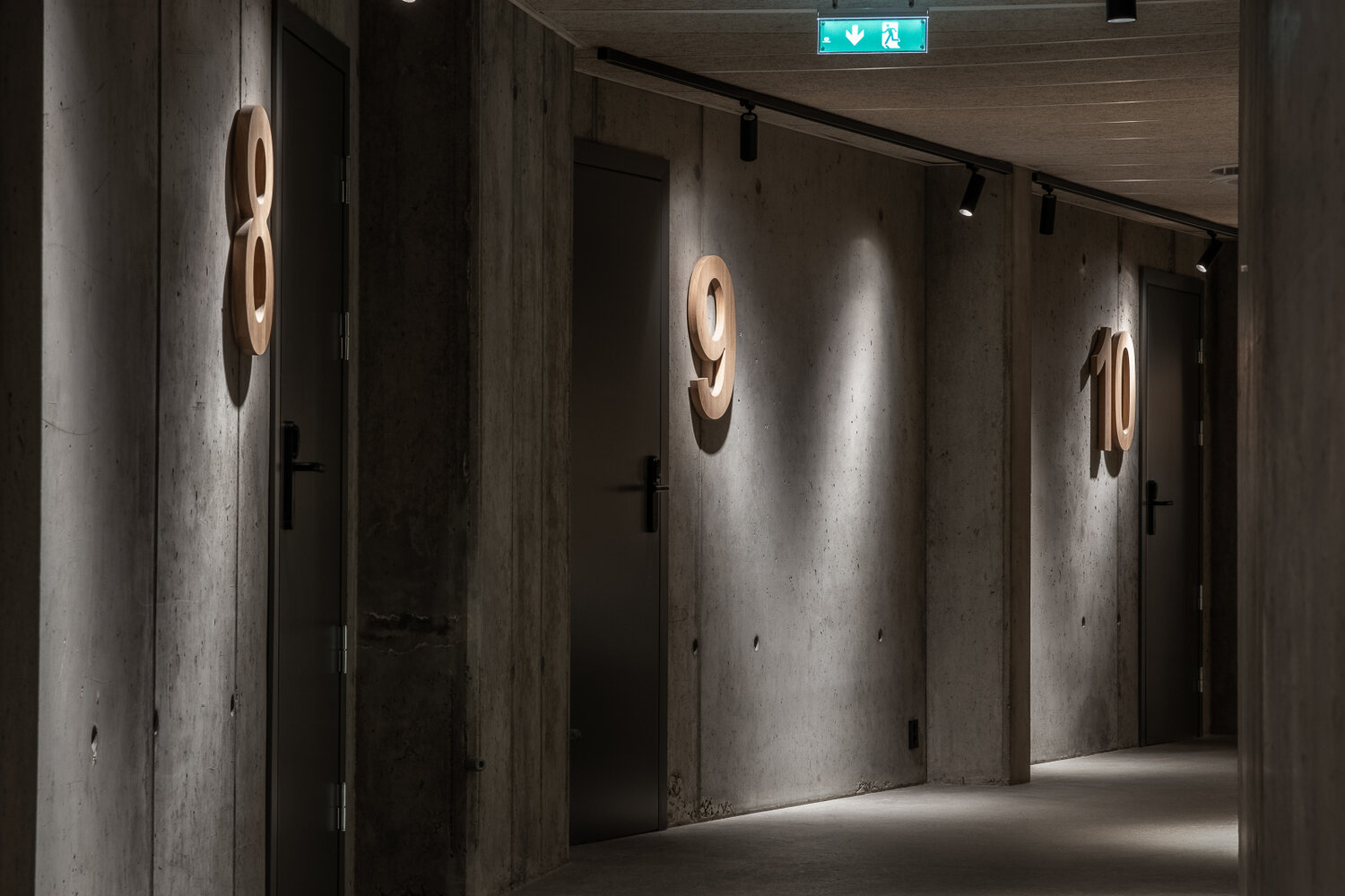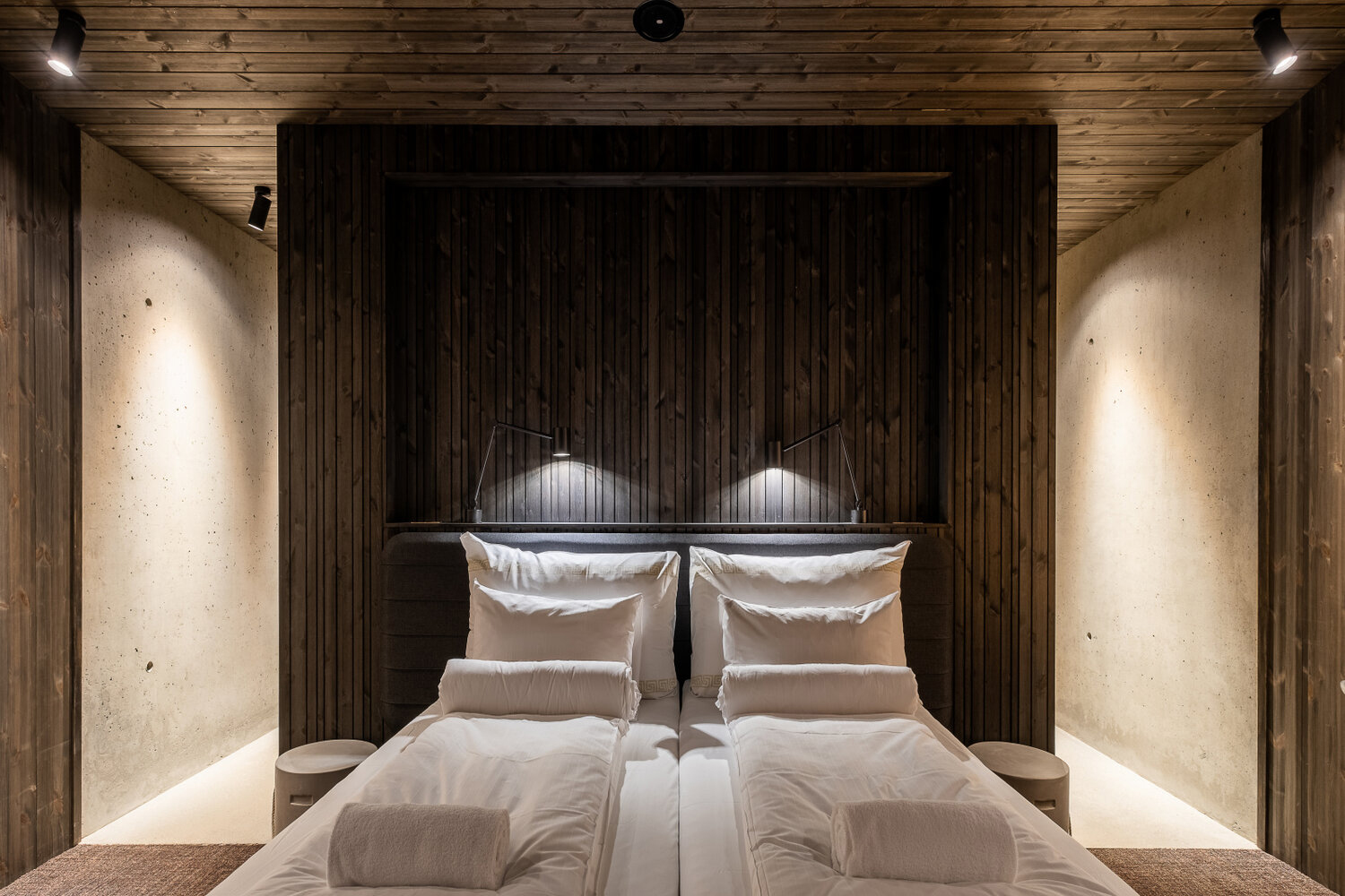 Located on a higher level, the reception area provides access to the rooms via an underground corridor. The studio used concrete for all elements buried in the ground, but chose solid wood for the cantilevered sections. Thanks to the warm wood cladding, the volumes adds a natural contrast to the green setting. Inside, the 16 double rooms and 2 suites feature either light or dark wood paneling, natural textiles in matching hues, and elegant bathrooms with dark tiles. By contrast, the entrance area boasts exposed concrete surfaces and minimalist accessories. The restaurant’s menu focuses on locally sourced ingredients with dishes that offer a modern twist on classics. Finally, the hotel is a great choice for foodies who want to explore the nearby Golden Road area. Photographs© Green Advisers AS.
