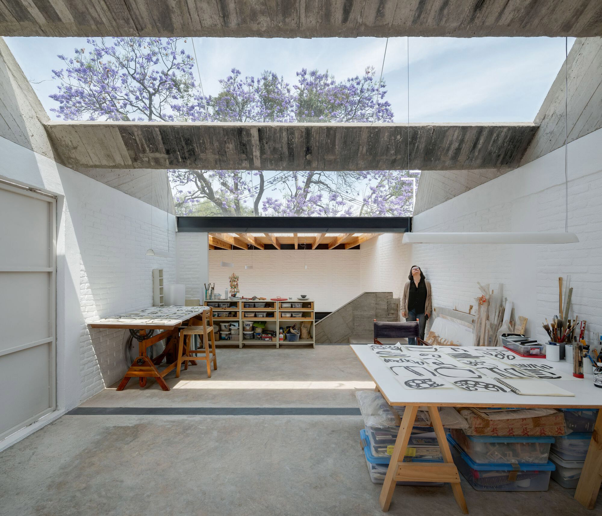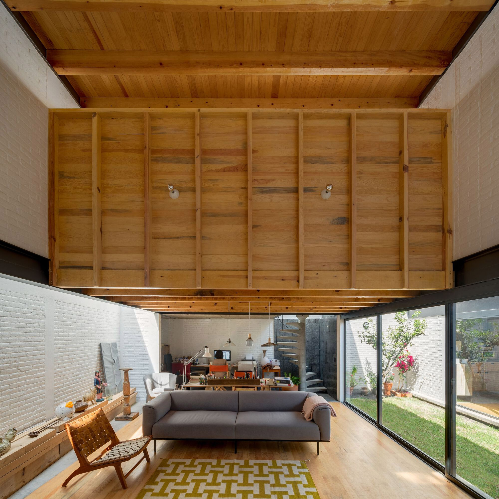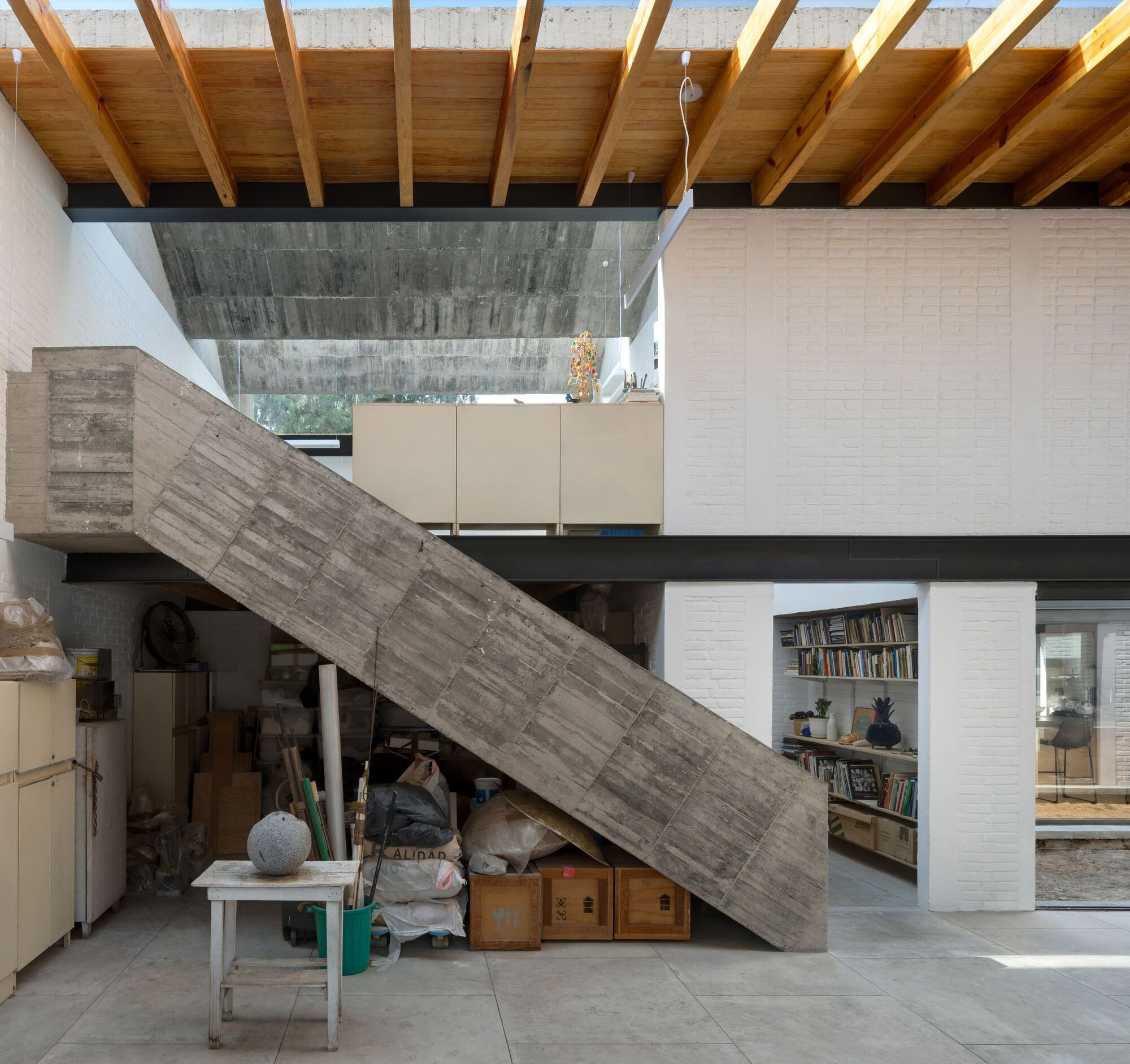 The drawing studio features an eye-catching, brutalist-style concrete roof designed with angular elements that remind of industrial saw teeth roofs. Apart from concrete, the studio also used red brick for the load-bearing structures and wooden beams that provide support to a mezzanine. Both the courtyards and the skylights fill the interiors with natural light. Warmer than the workshop areas, the living spaces feature more solid wood; from the flooring to the large mezzanine module and the kitchen furniture. Photography © Rafael Gamo.