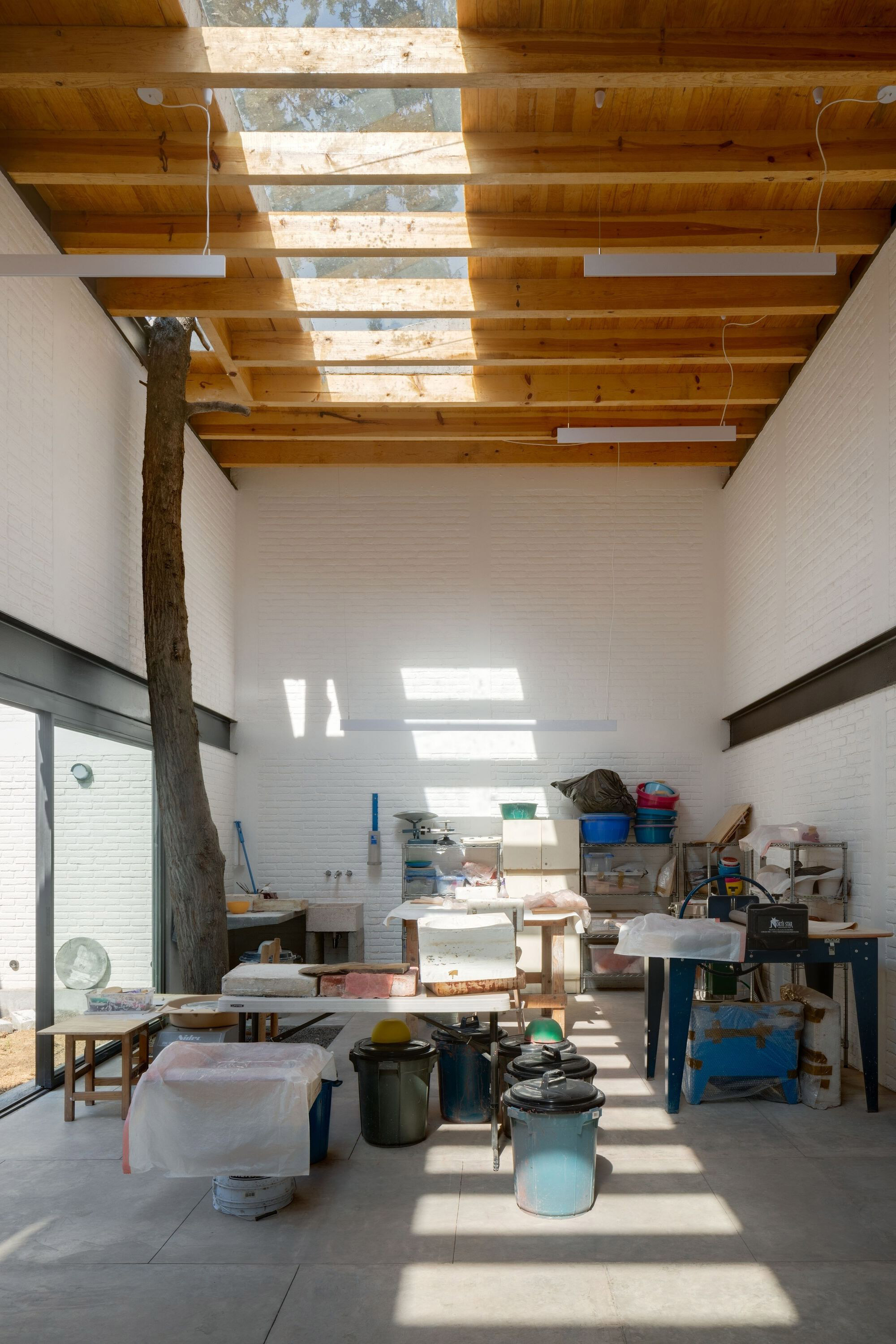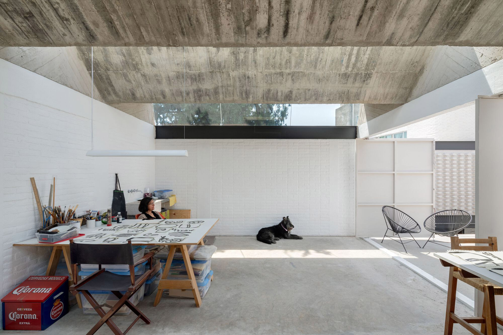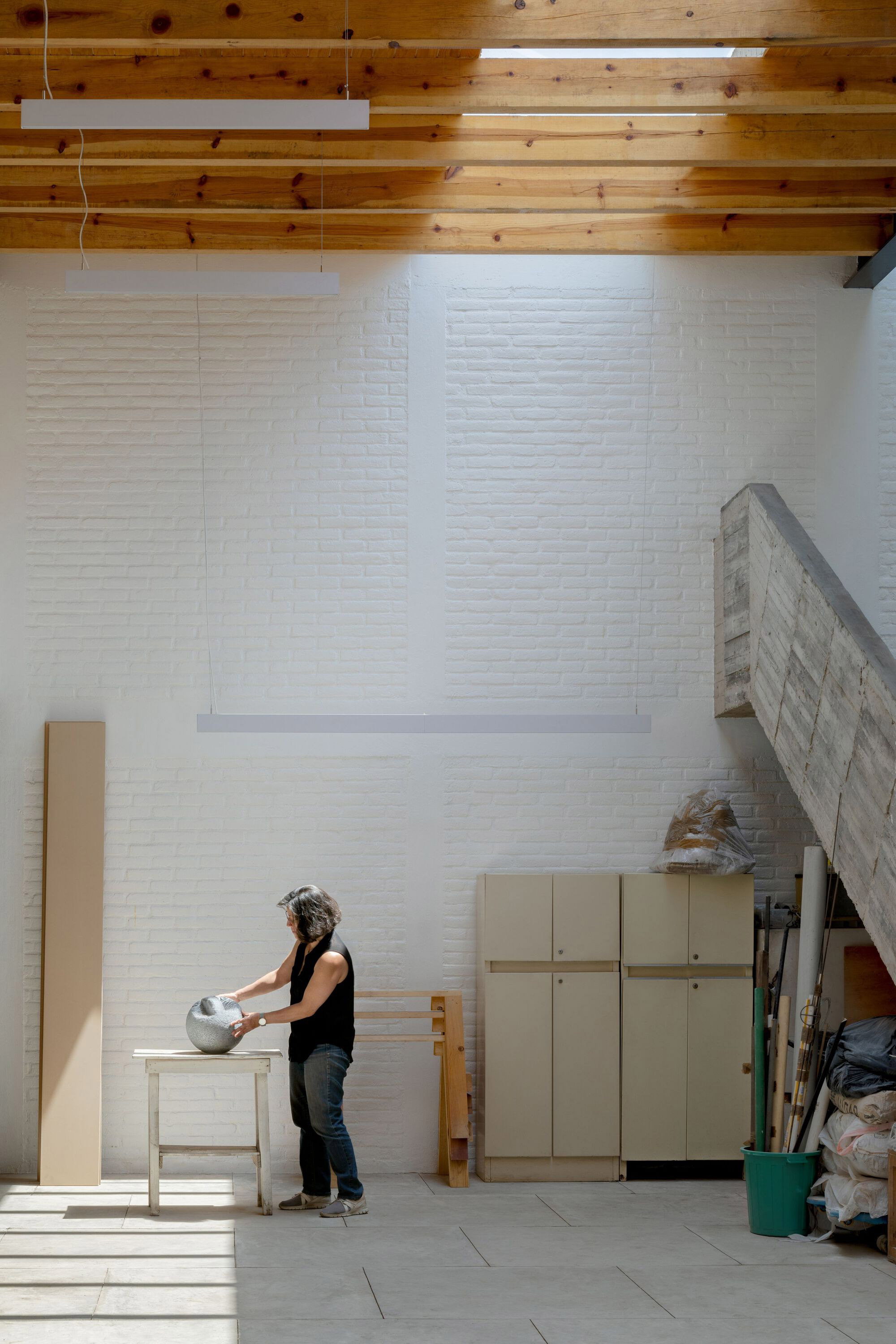 The drawing studio features an eye-catching, brutalist-style concrete roof designed with angular elements that remind of industrial saw teeth roofs. Apart from concrete, the studio also used red brick for the load-bearing structures and wooden beams that provide support to a mezzanine. Both the courtyards and the skylights fill the interiors with natural light. Warmer than the workshop areas, the living spaces feature more solid wood; from the flooring to the large mezzanine module and the kitchen furniture. Photography © Rafael Gamo.