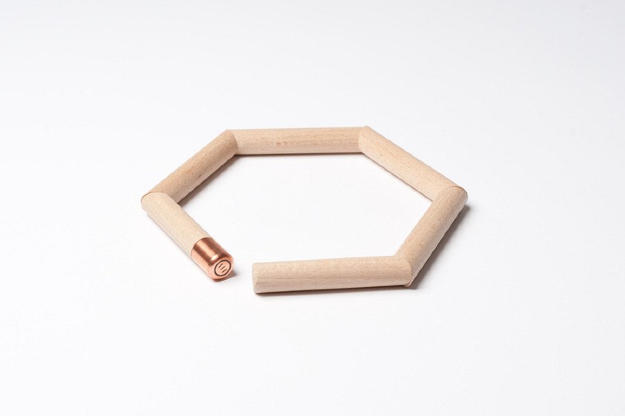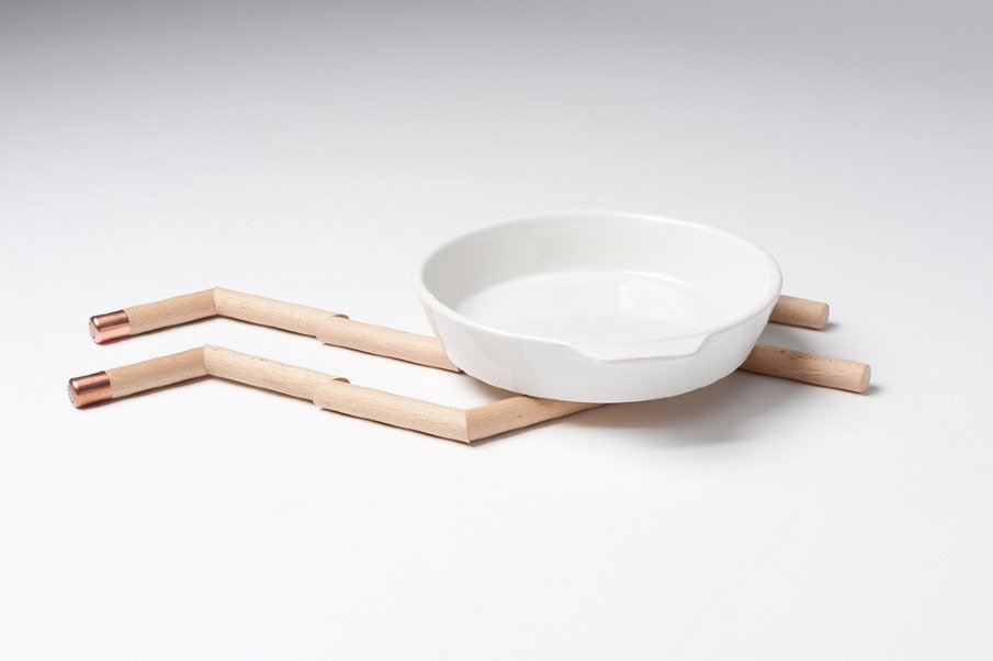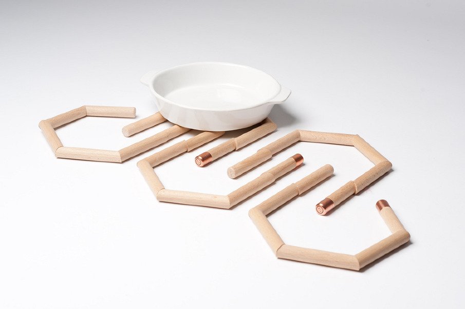 A perfect tool for the holiday kitchen, Pantin is a modern rendition of the traditional trivet. Designed by Jean Couvreur for Les Élémentaires, the wooden piece is a chain of short bars strung together by an elastic cord and finished with a copper cap at one end. The individual beech wood segments elevate hot dishes from delicate surfaces, but their unique connection and angled shape allow the string of six to be reconfigured from a single linear form into a perfect hexagon. The flexibility of Pantin’s design makes it easy to use as well as easy to store for even the most apprehensive bakers and chefs.+