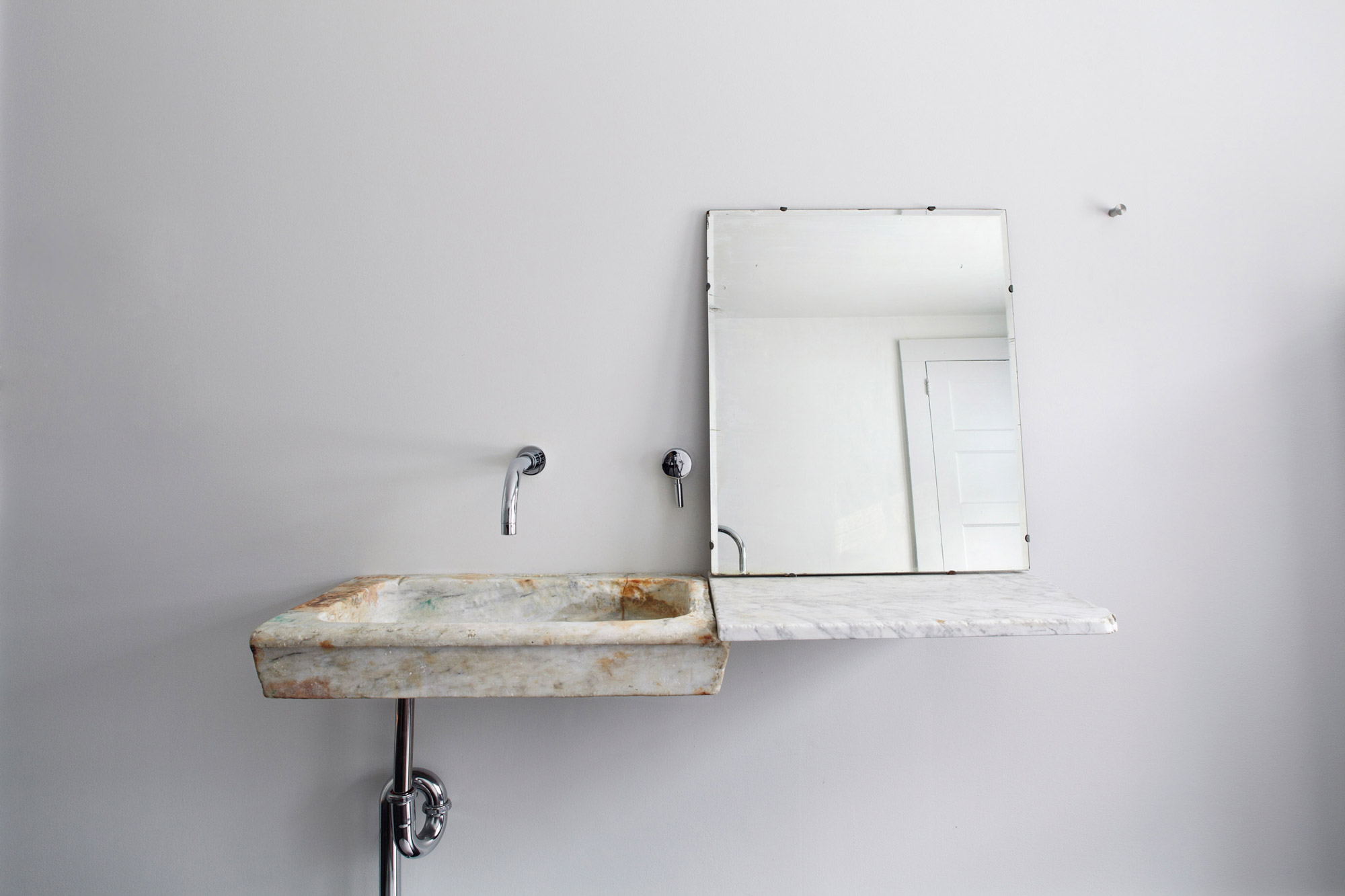 To show so in brief I will call attention to some of the finer examples present in the work, starting with the siting and massing. The home’s original position near a waterfall that flows into a quiet river already lends it an otherworldly quality, but through an cantilevering addition over the river Givone brings the most out of this facet. In creating this massing he maintains the pitch of the home’s original roof but covers the exterior with a large glass curtain-wall to identify it as new and also give it the weightless feeling modern construction practices can create. The cantilevered part of this massing then features a porch finished in the style of the original home (and even featuring antique rocking chairs) to build this contrast of new and old within even a part that is solely new. This stunning porch extending over the river is one of the main reasons the project is named the “Floating Farmhouse,” but examples are seen of this even in the tiniest details. The installation of an 18th century Italian marble sink in one of the bathrooms provides a good case, as it’s floating nature is accomplished thanks to a modern support system hidden in the wall, akin to some of Scarpa’s work in the renovation of the Canova Museum in Possango, Italy. Across from the sink is a 19th century wood and zinc tenement bathtub that has been wrapped in stainless steel, feeling as if the room’s original flooring has been extruded to make a tub. The final point of contrast I’d like to highlight is in the wonderful space of the addition; a large kitchen featuring supporting roof beams salvaged from a dairy barn in Pennsylvania. Though the addition is a new construction, these beams provide a feeling of comfort in the new space by linking its charm to the originals. This pursuit of new features to mimic and match old ones makes this project more than a historic renovation; it encapsulates within its walls features from such a broad range of places and periods that it transcends one particular time. Rather, this home is a contrast of the present and the past as vague concepts, showing that perhaps the things we take for granted now may become relics of an encroaching future, and it’s vital that we appreciate the beauty of our passing designs within the context of past designs.