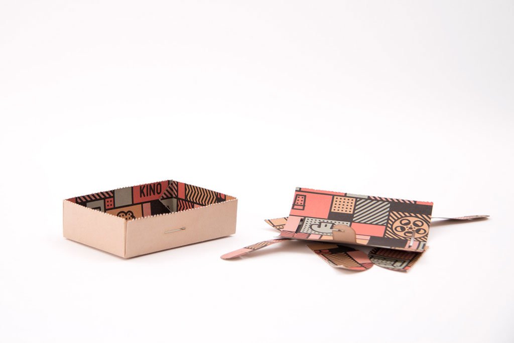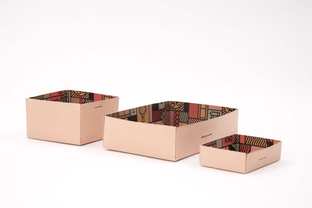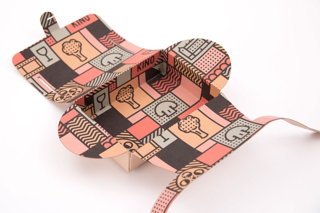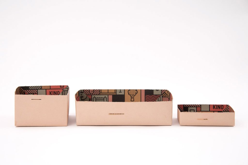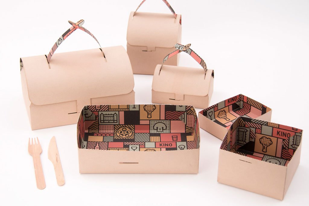 A playful accessory by Swedish designer Gustav Karlsson, the Kino Lunchbox folds up like a paper box to form trays and carriers of various sizes. The exterior is minimally decorated, while the interior is printed with symbols of food, drink, and culture. Three take away boxes, with integrated handles. One for the main course, one for soups and stews and one for salad/bread. Inspired by vintage camera bags, the packages are made of  sustainable sourced paper board with a starch lining, 100% composable and microwave-friendly.