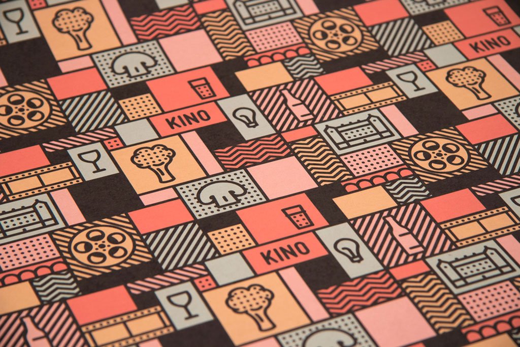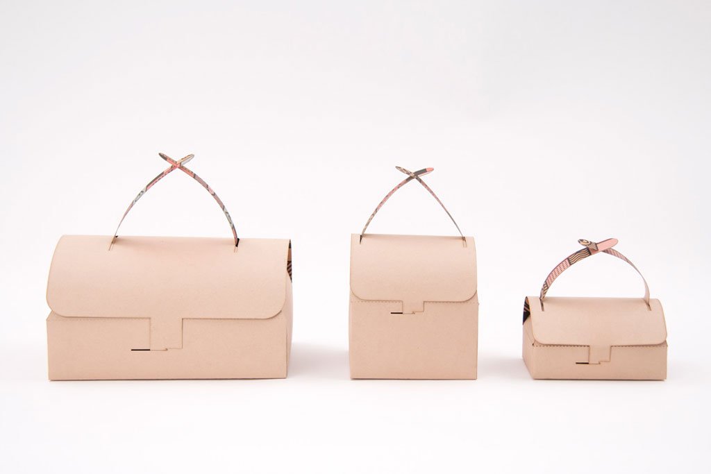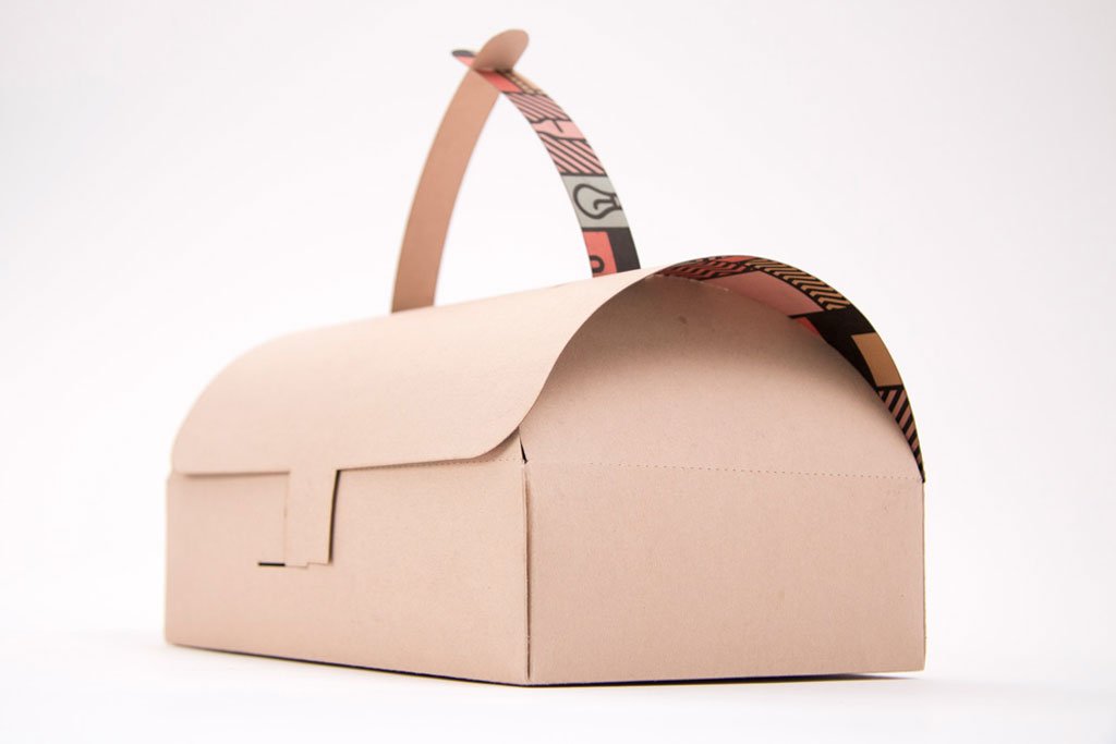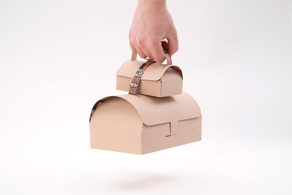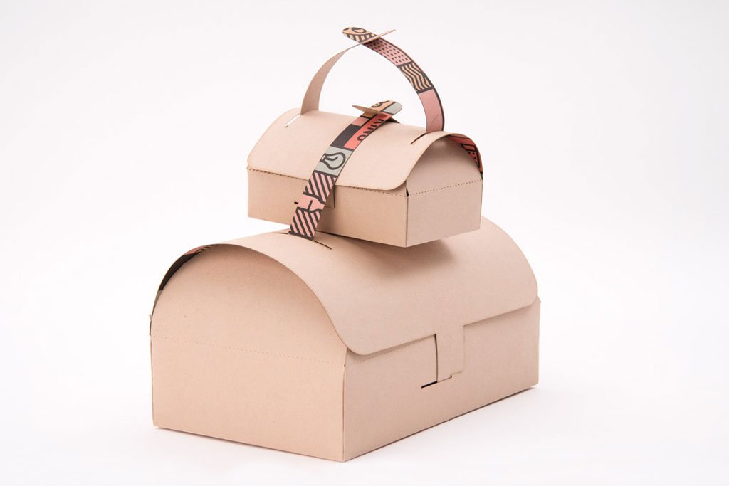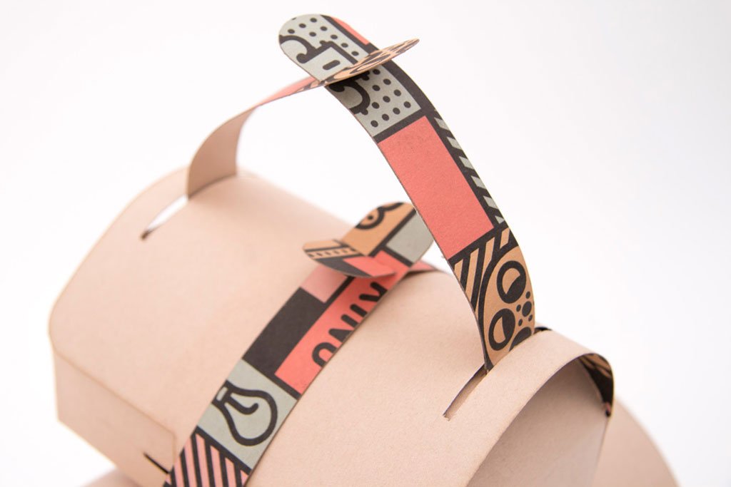 A playful accessory by Swedish designer Gustav Karlsson, the Kino Lunchbox folds up like a paper box to form trays and carriers of various sizes. The exterior is minimally decorated, while the interior is printed with symbols of food, drink, and culture. Three take away boxes, with integrated handles. One for the main course, one for soups and stews and one for salad/bread. Inspired by vintage camera bags, the packages are made of  sustainable sourced paper board with a starch lining, 100% composable and microwave-friendly.