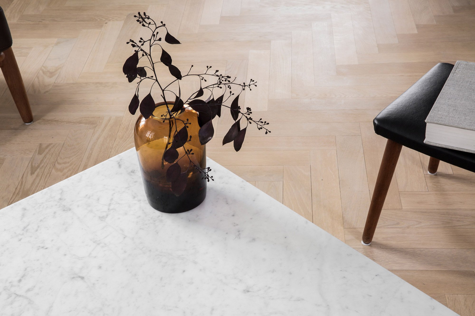A neutral palette enhances the refined interior design further. Concrete and marble complement rustic wood and white walls, while carefully chosen furniture and accessories give a stylish finishing touch to the minimal decor. The wooden floors and furniture boast colors ranging from light sand to black coffee, while black accents stand out in the predominantly bright interior. Wooden stairs lead to the upper level where skylights bring more sunlight into the dwelling.