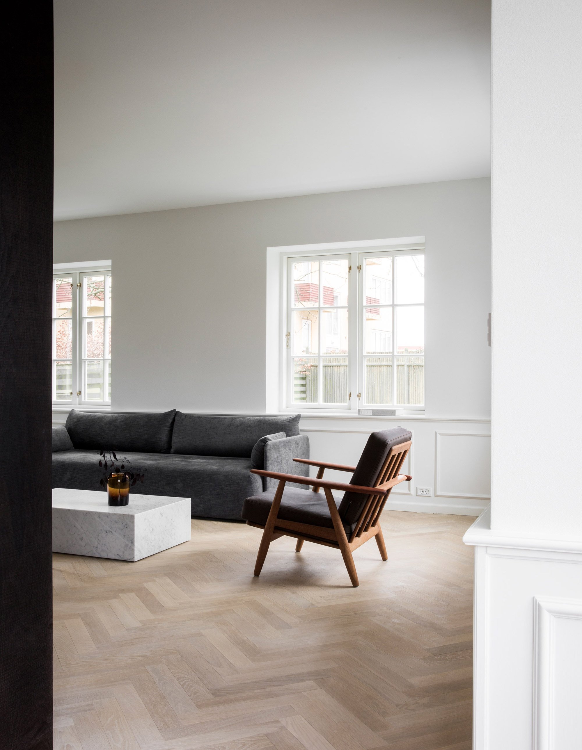 After a devastating fire almost destroyed this historic villa in Copenhagen, Denmark, renowned studio Norm Architects restored the building. And opened its new chapter, as a minimalist family home. Inhabited in the past by the iconic Danish architect, designer, and cultural critic Poul Henningsen, the villa has a rich past. One that the studio wanted to preserve. As a result, some of the original elements remain to remind the owners of the building’s history. The open-plan design creates a lofty feel, with large paneled windows on all sides also bringing plenty of natural light inside the rooms.