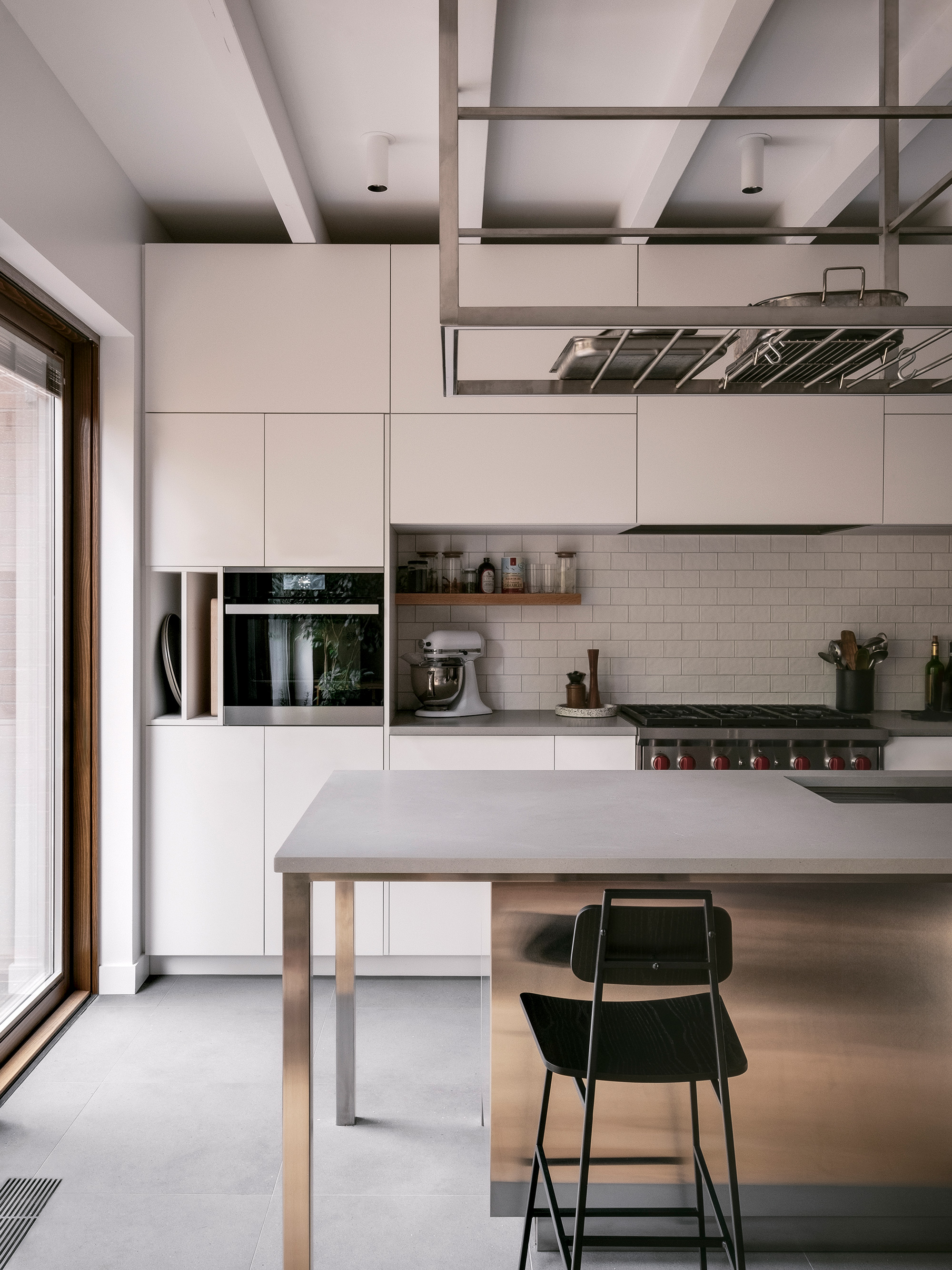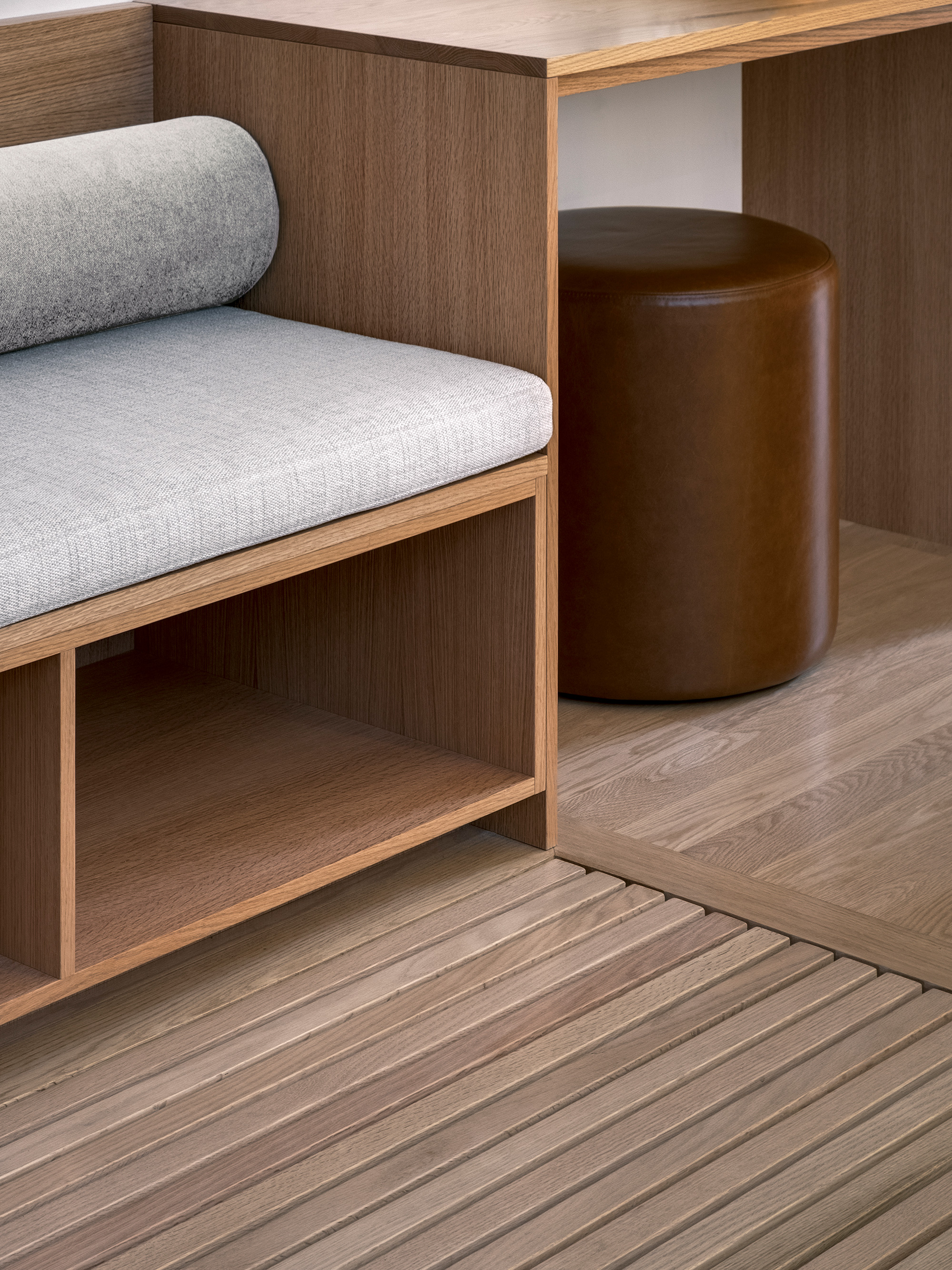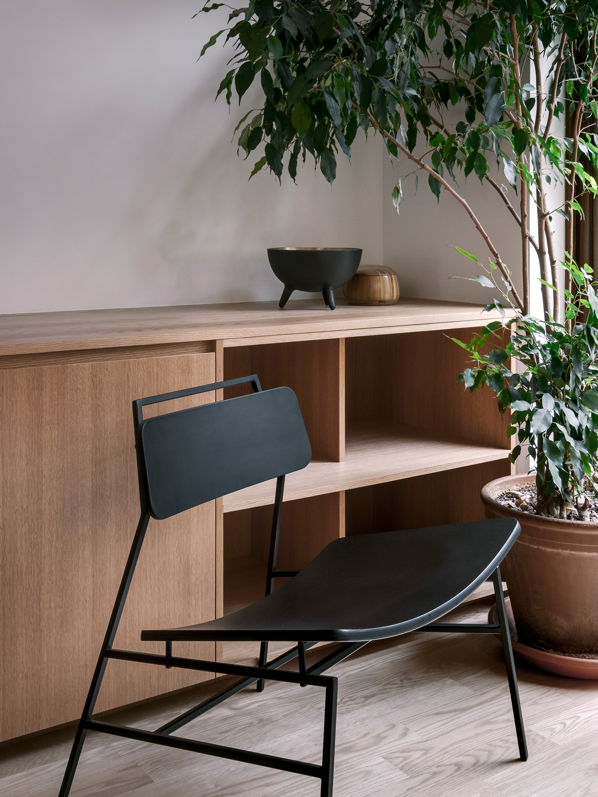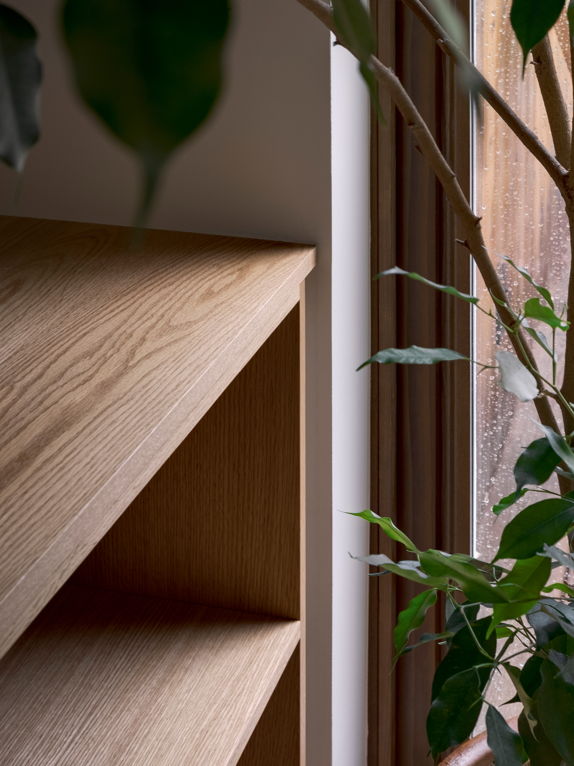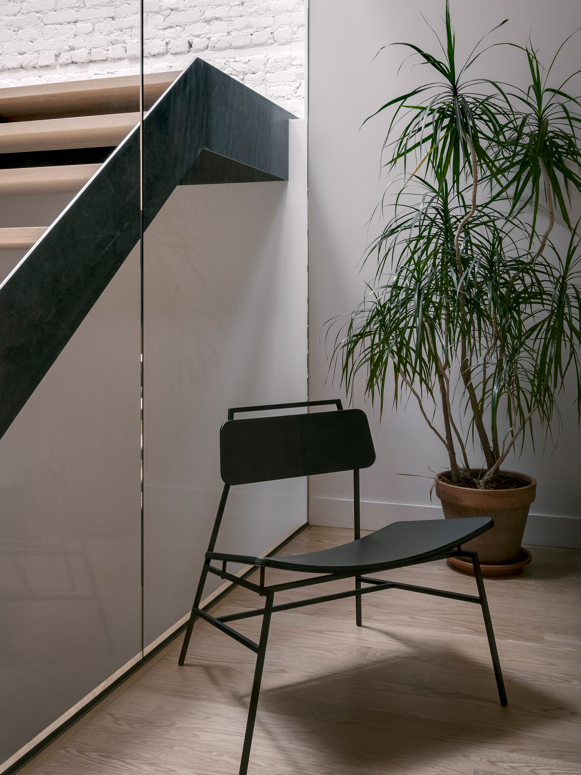 Every piece of furniture is bespoke. In the kitchen, the firm designed a sleek stainless steel island with an industrial aesthetic that complements concrete and wood surfaces. In the living area, the custom furniture includes a couch with integrated storage spaces and an office area. Like in modern Japanese homes, the designs optimize space but also have a clean, minimalist aesthetic. Darker wooden frames surround the windows and sliding doors that open the ground floor to the garden. Photographs© Félix Michaud.