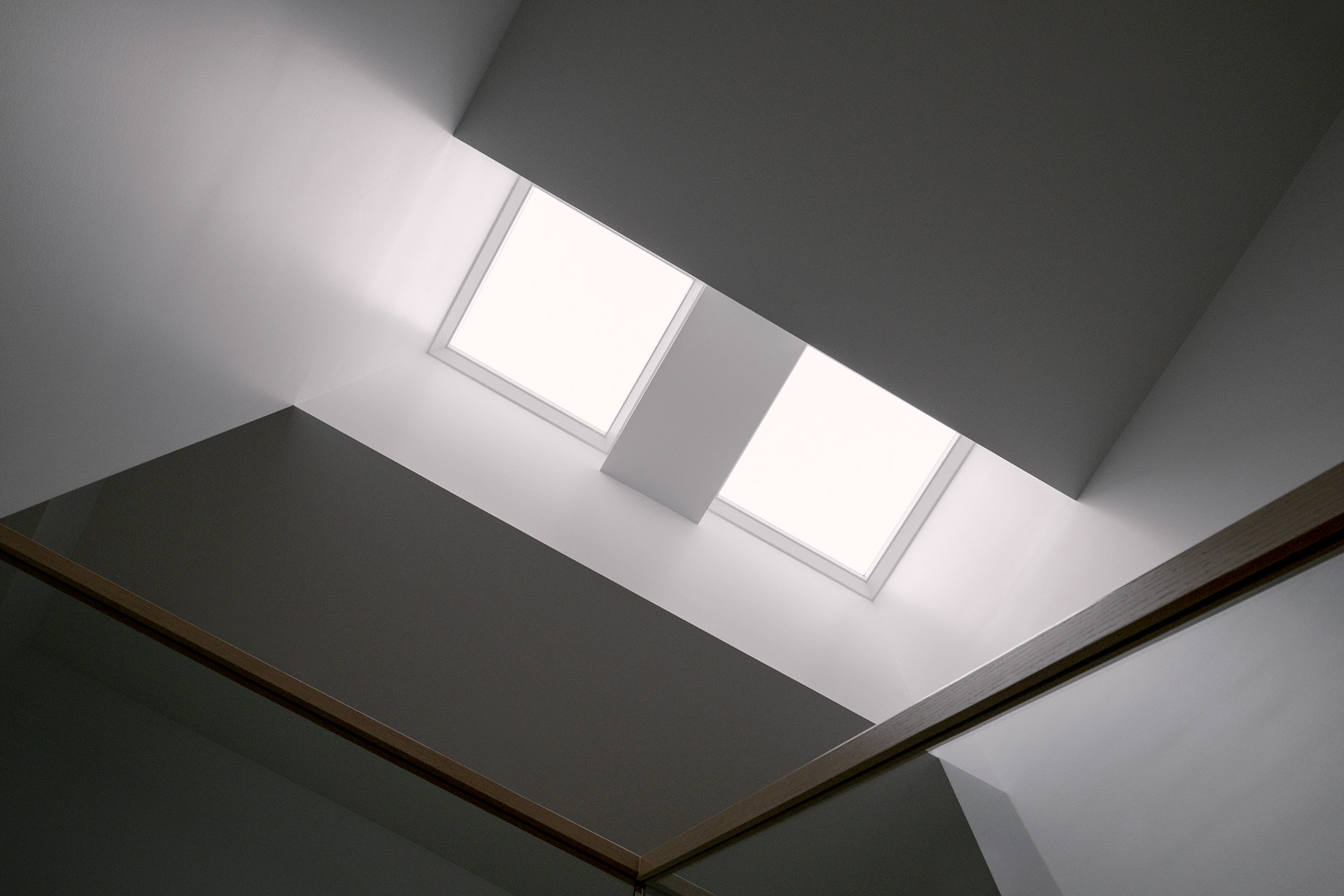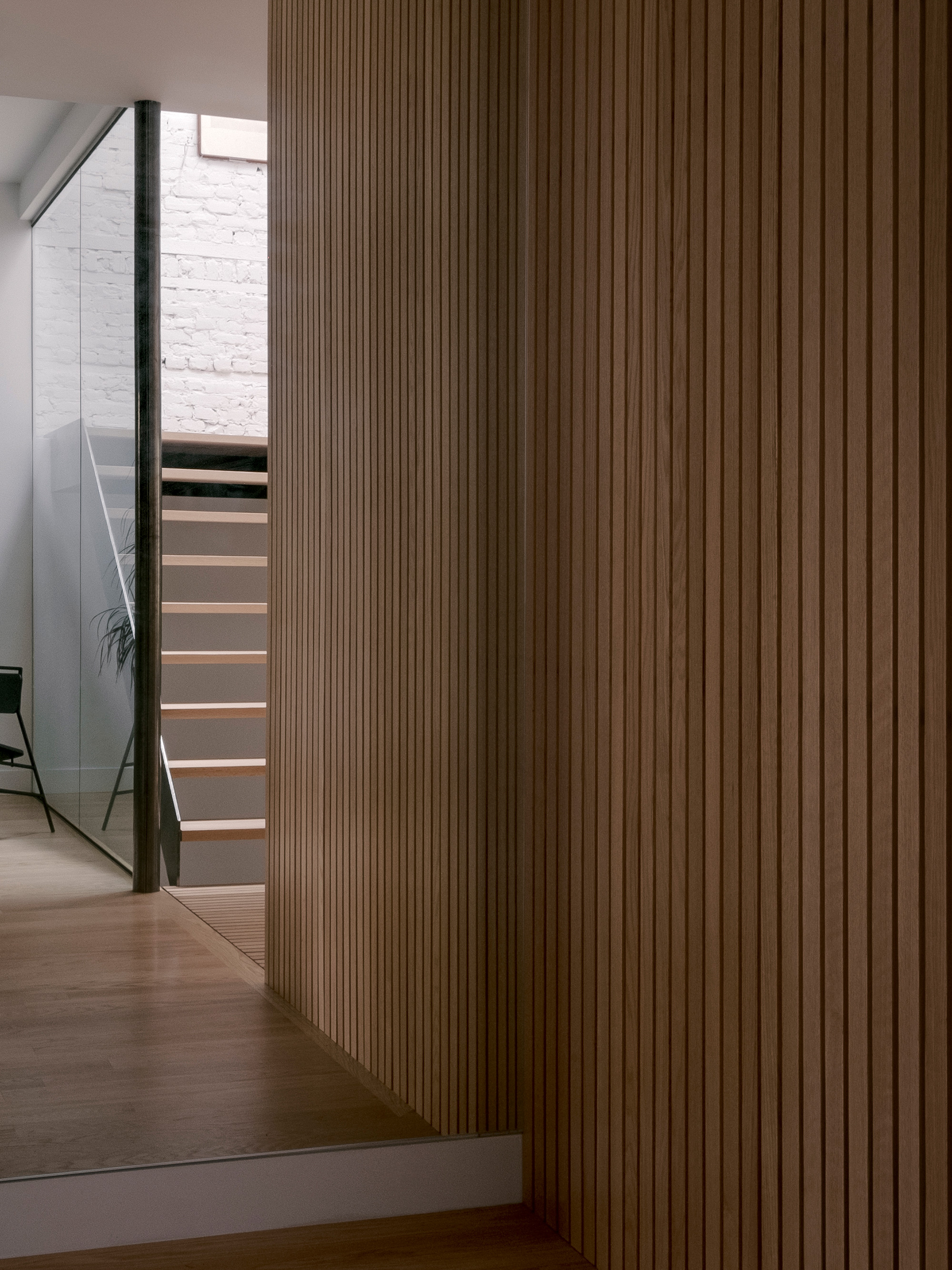 In the new home, the staircase becomes a connecting element that also segments different areas. The open design combines glass, wood and steel, allowing light from a skylight to reach the basement. On the ground floor, the studio created a natural flow between different spaces. Japanese-style wood paneled screens allow the clients to divide or open up areas with ease. Natural light also plays an important part in the interior, with spaces between the wooden slats on the vertical panels and the flooring creating a play between light and shadow.