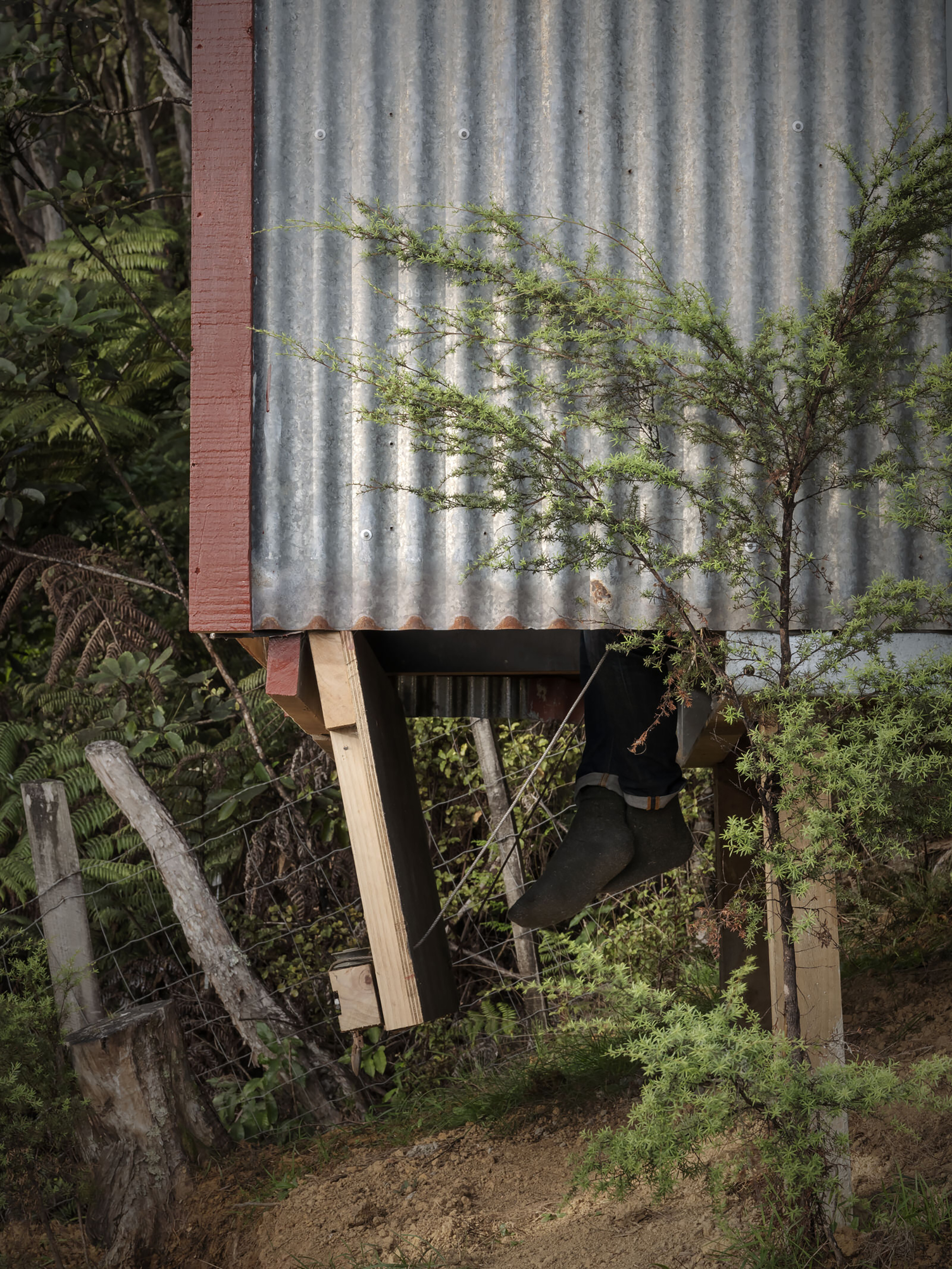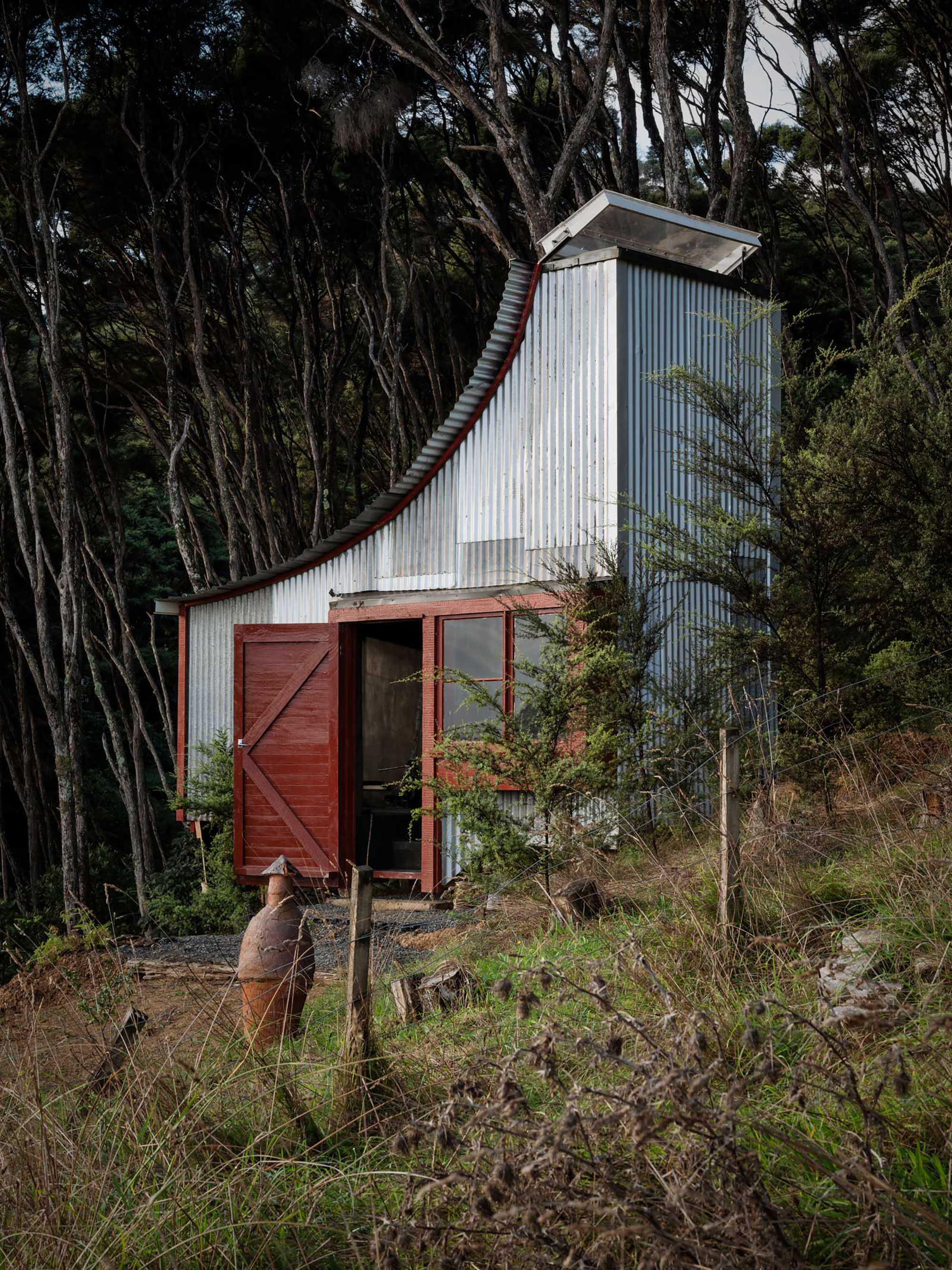 Located on the outskirts of Coromandel, on New Zealand’s North Island, the cabin is nestled underneath a kanuka canopy. The small plot inspired the architect to design a cabin that immerses the resident into nature. A previous photo project completed in skate parks informed the project’s concept: a curved structure reminiscent of a half-pipe. An old steel frame from an abandoned zipline platform provided both the footprint and the stair recess.