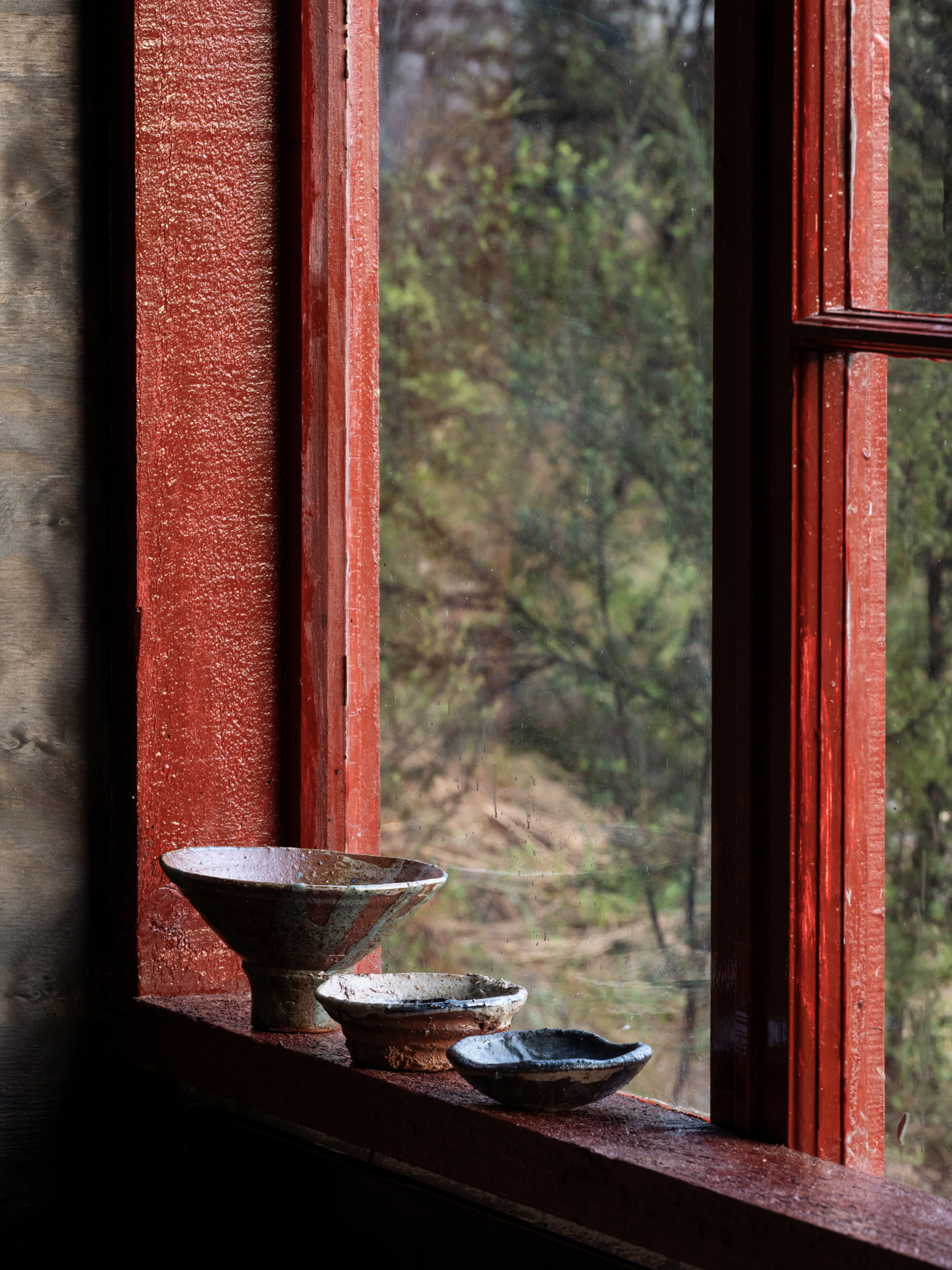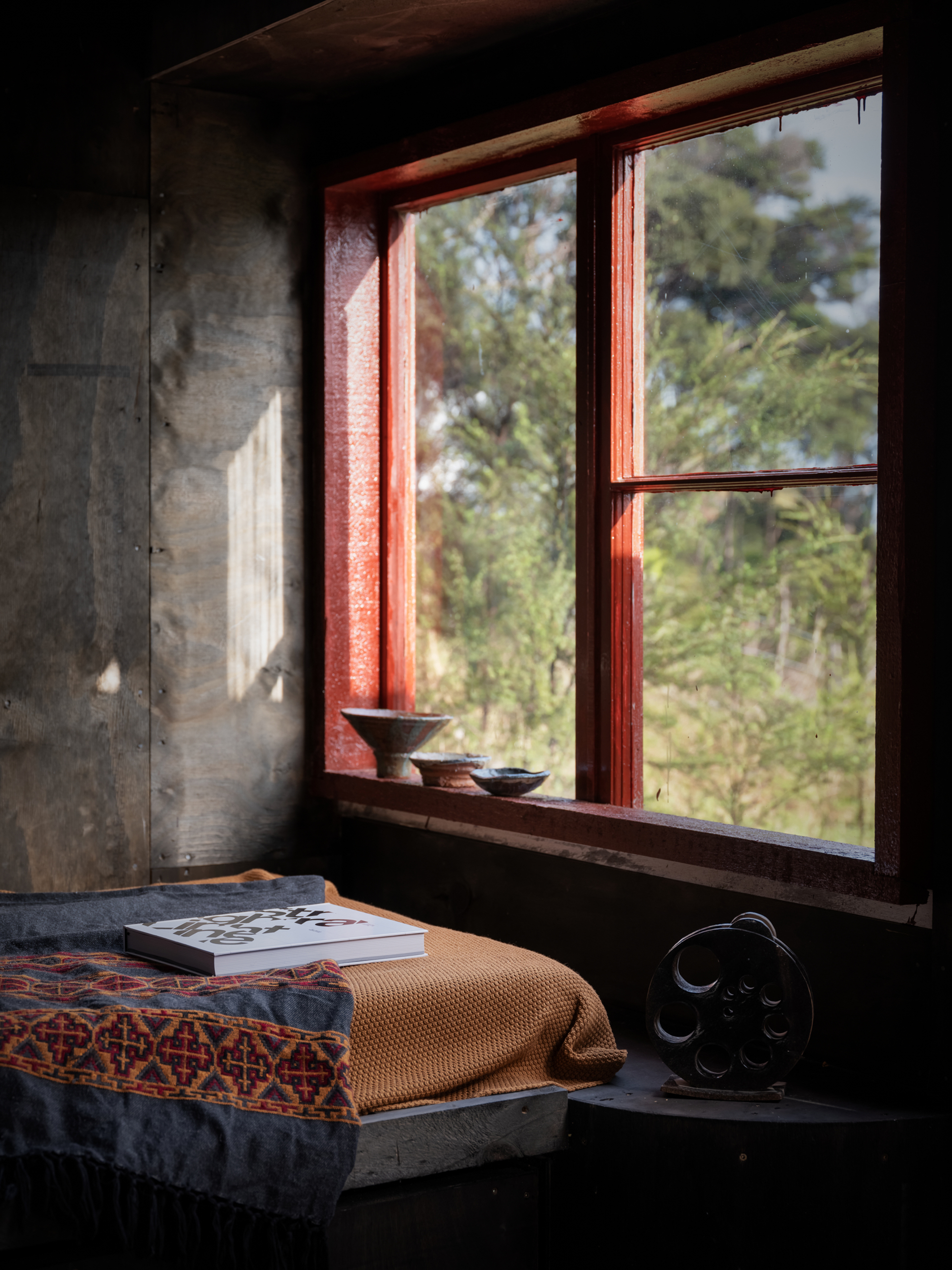 Inside, there’s a concrete floor with a beautiful rough texture. One side of the room has a desk while the other a bed with integrated storage. A window that overlooks the trees transforms the desk into an inspiring workspace. Right above the pillow, the architect placed a skylight that frames branches as they sway in the wind. Finally, a solid wood side table and a few vessels and decorative objects complete the simple hut. With the help of locals who donated old materials, the architect finished the entire hut in just over three weeks. Photographs © Samuel Hartnett.