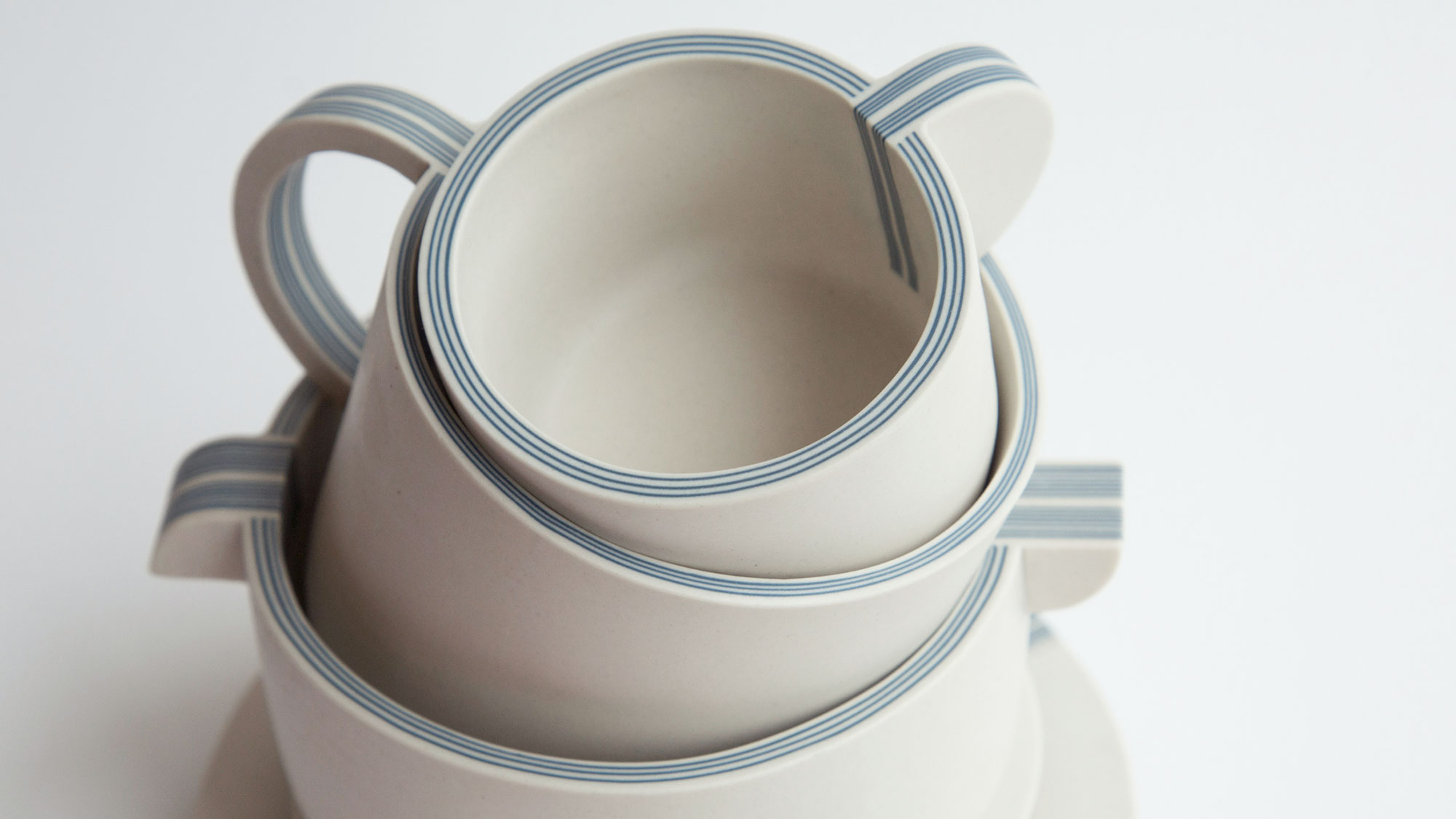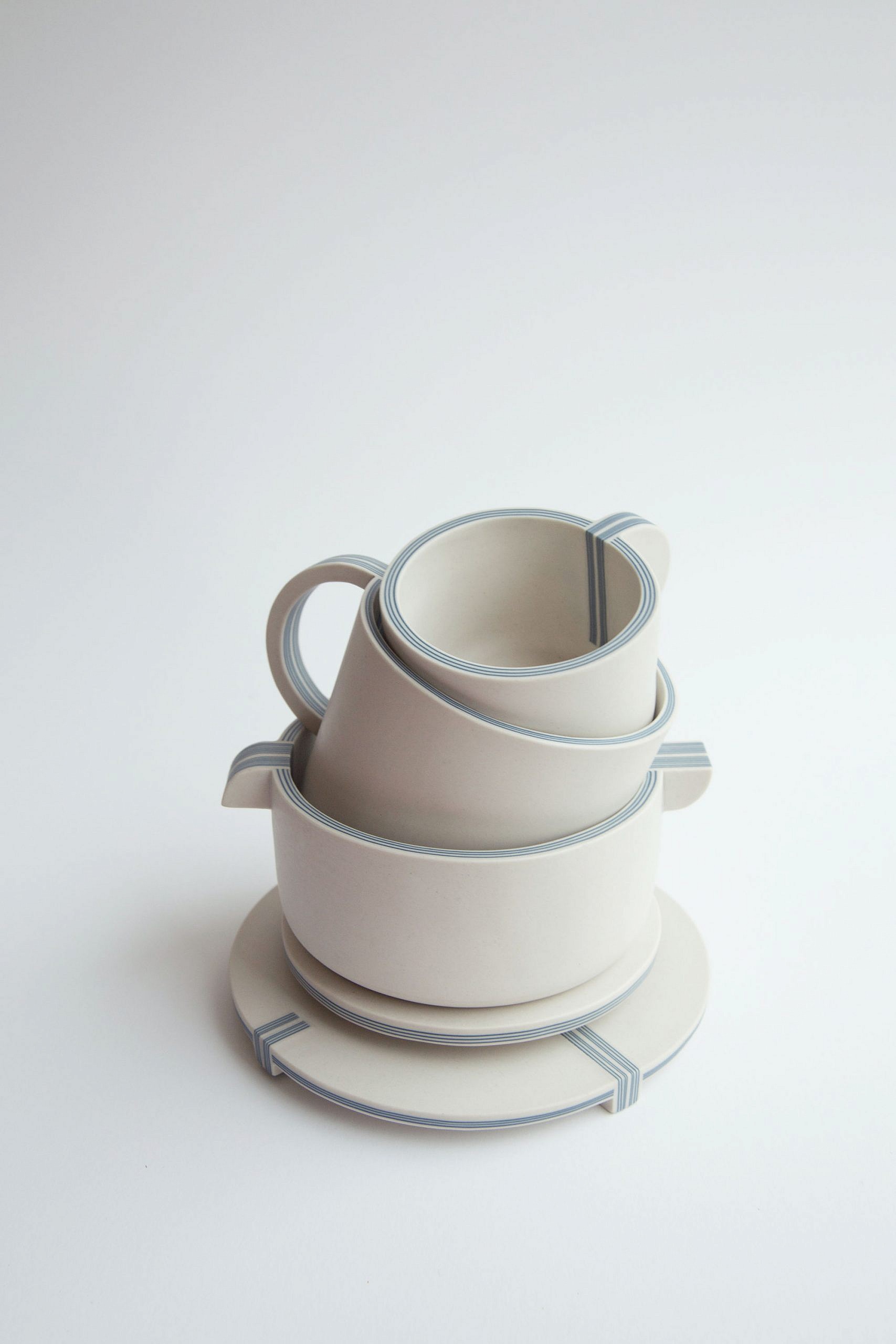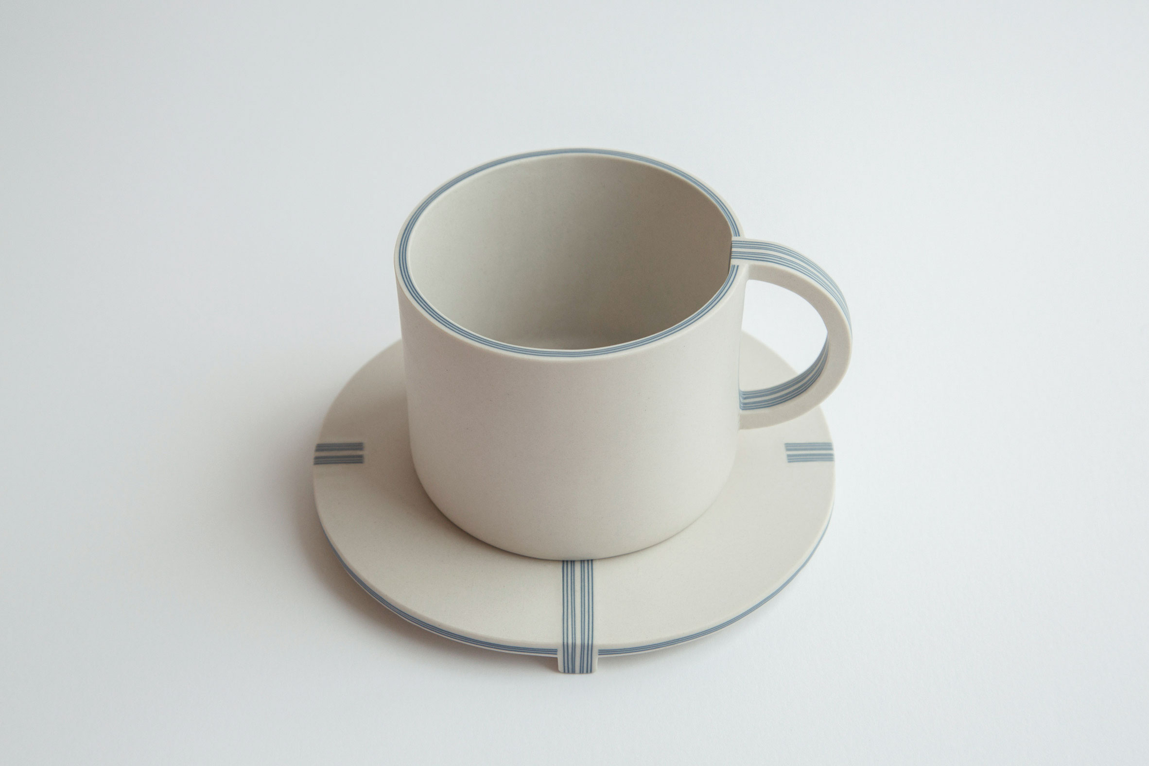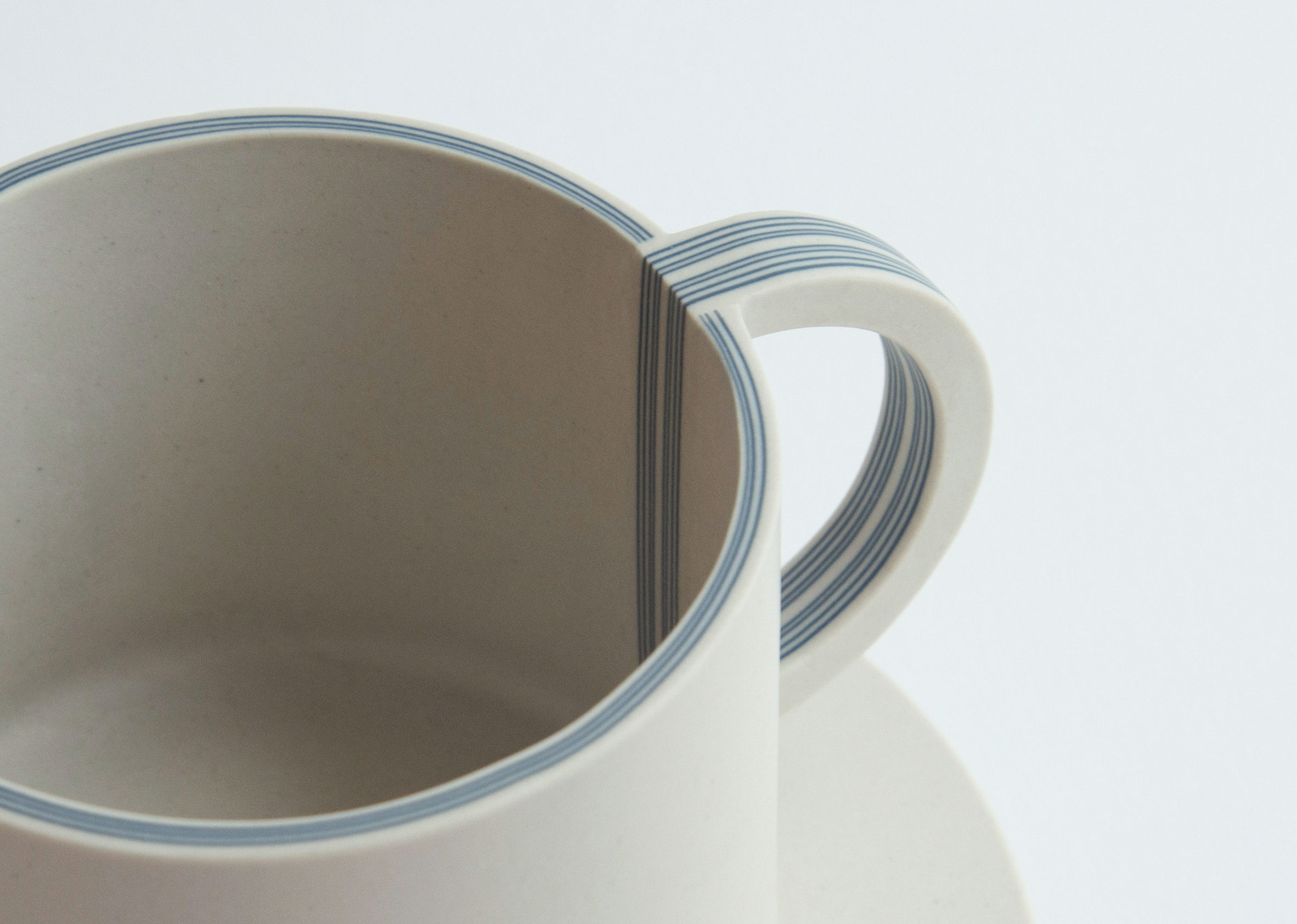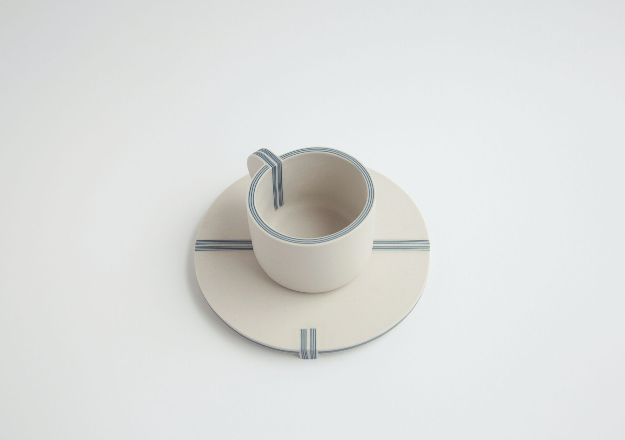 Using multiple layers to build each product, the designer created objects that reveal line patterns on cut sections. Alternating blue and cream colors come to the surface on the rims, plate edges, and handles. Resembling the structure of plywood, the pattern gives a distinctly contemporary charm to the fine porcelain pieces. The Plycelain collection comprises several items. Apart from a mug and espresso cup with a saucer, the line also includes a plate and a bowl. Made with care using a combination of modern techniques and artisanal methods, every product displays a balanced blend of refined style and craftsmanship. At the same time, this manufacturing process offers a new way to create porcelain items. Here, mass-production techniques complement the character and individuality of handmade objects. Photographs© Yuting Chang.