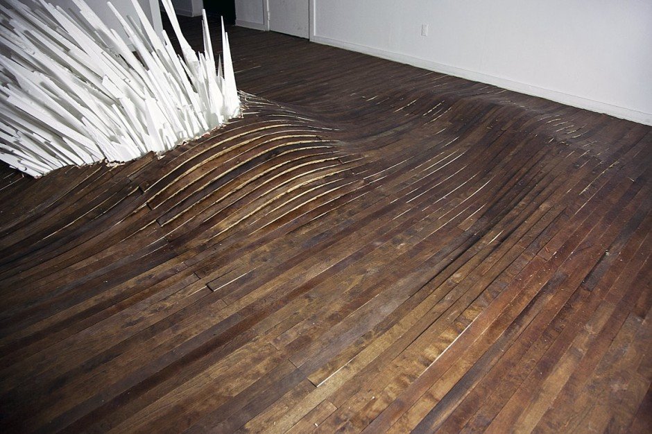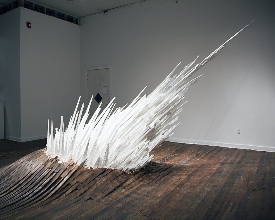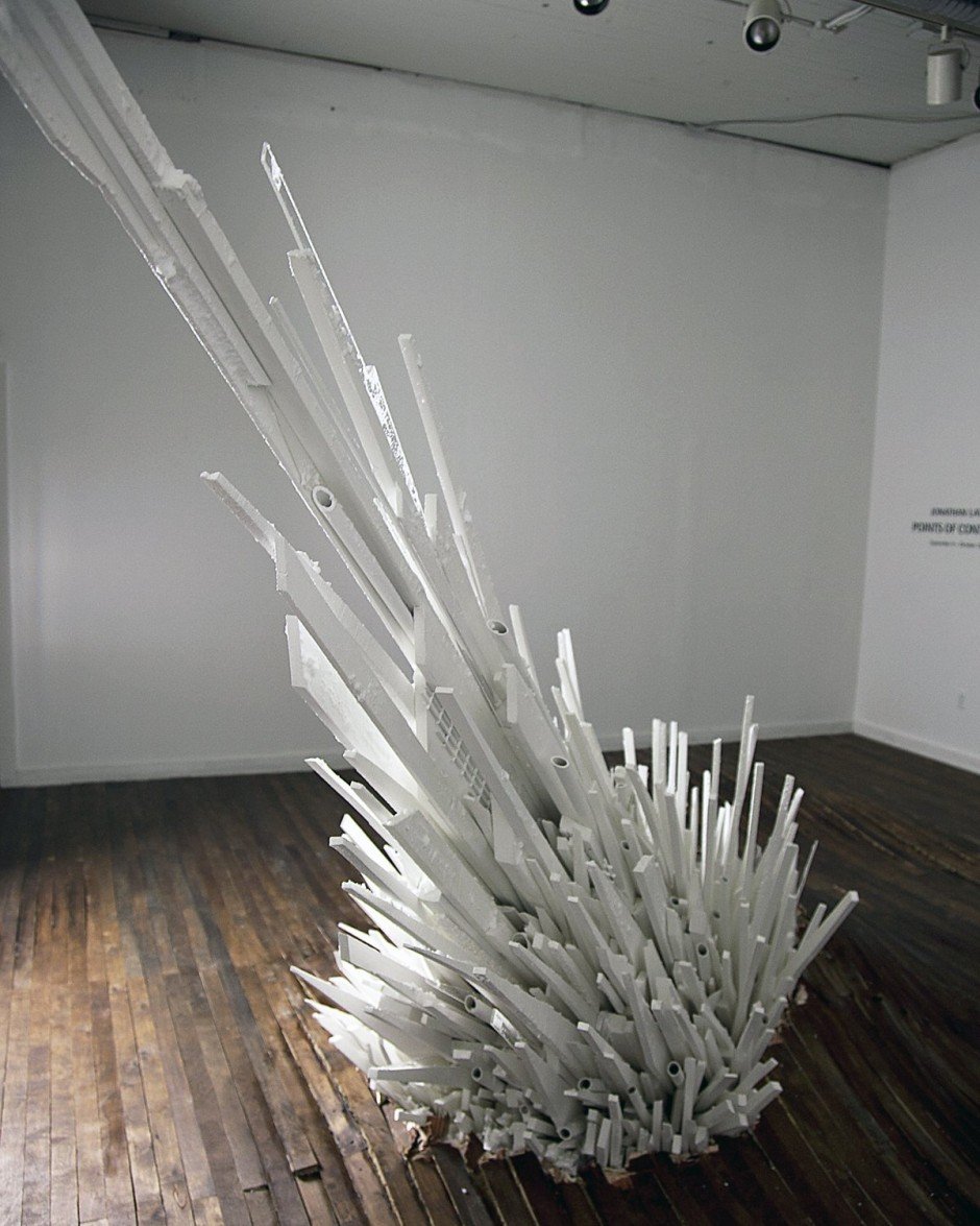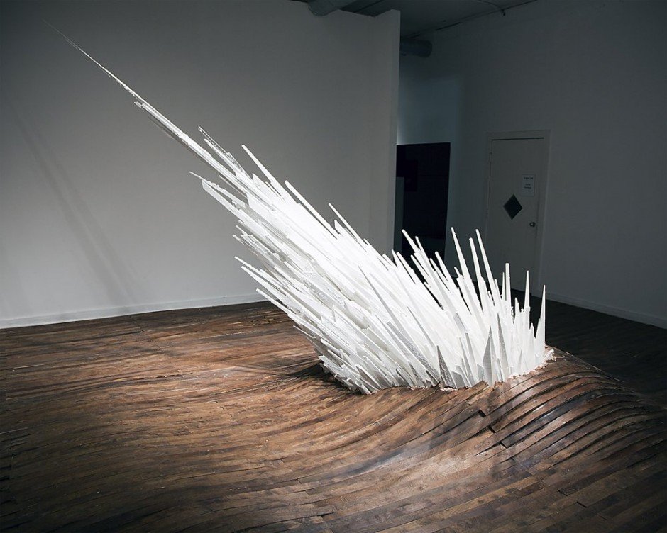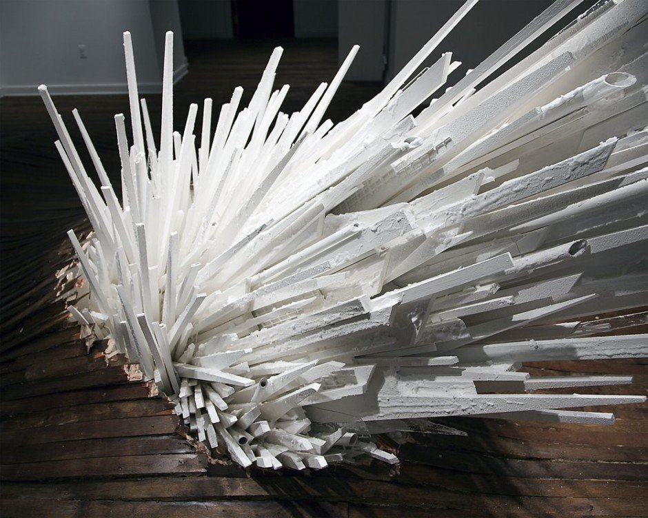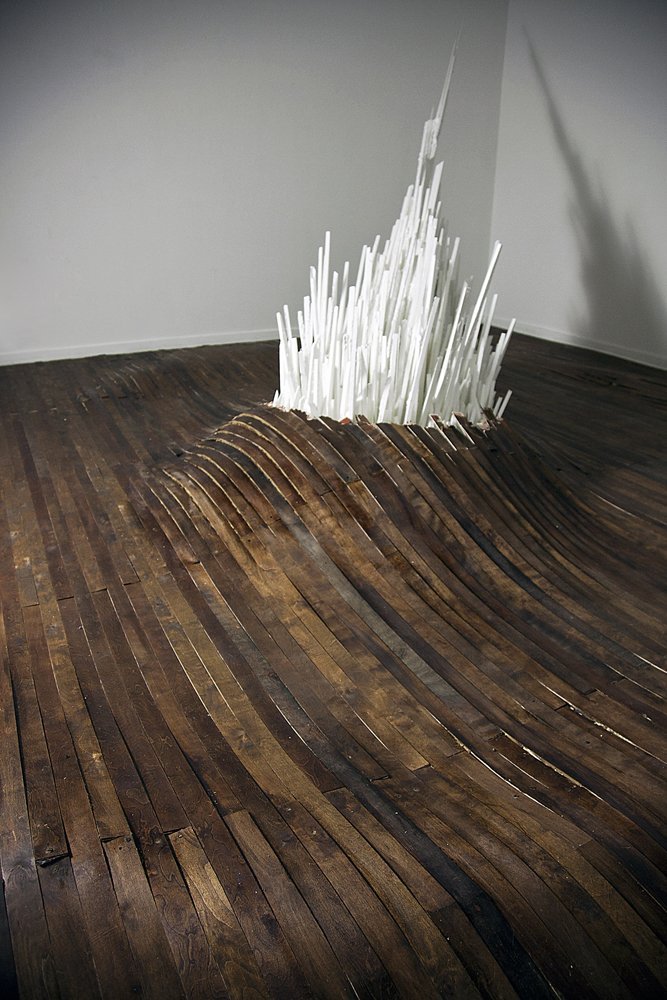 Jonathan Latiano has created a thoughtful sculpture called Points of Contention to encourage us to think twice about the future affects of our world’s use of plastics, styrofoam, and other man made mutant products. The ripple affect in the floor suggests a movement whereas the negative reactions to these inorganic elements becomes our world’s future norm.
