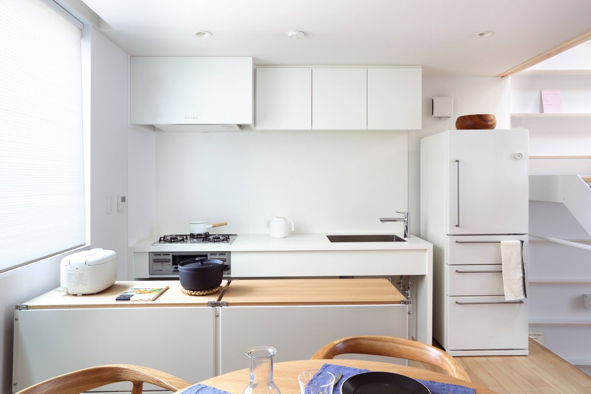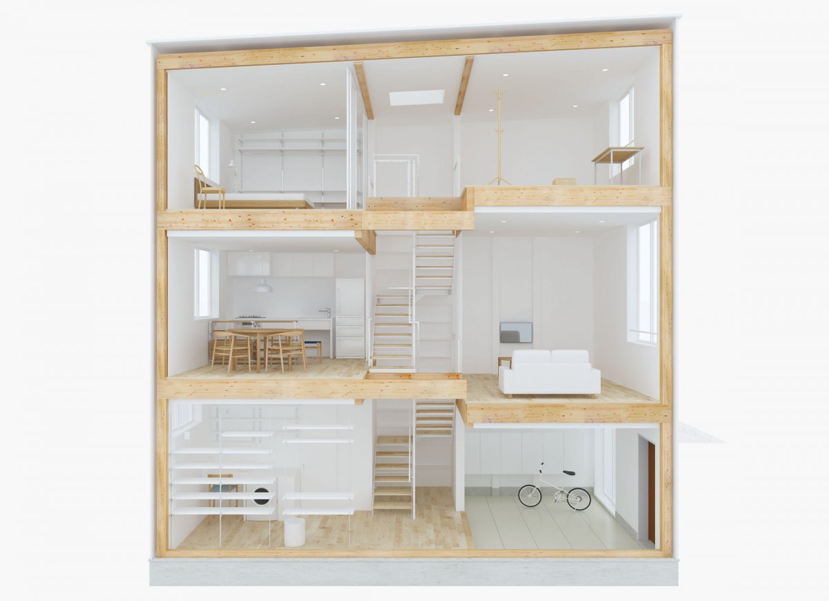 Muji’s latest prefab architecture project, the Vertical House, is a three-story townhouse made to fit small spaces in Tokyo, Japan. Following on the heels of Muji’s Window House (2008), Tree House (2009), and Furniture House (2013), the new design is a minimalist urban home. The wood-framed structure has interior doors or walls, instead dividing the kitchen, dining area, den, bedroom, and bathroom among the three floors. On each level, there is a large front-facing window and white walls and natural wooden floors to reflect the sunlight. Altogether a small and easy-to-maintain space, the Vertical House is ideal for a single resident or a couple.