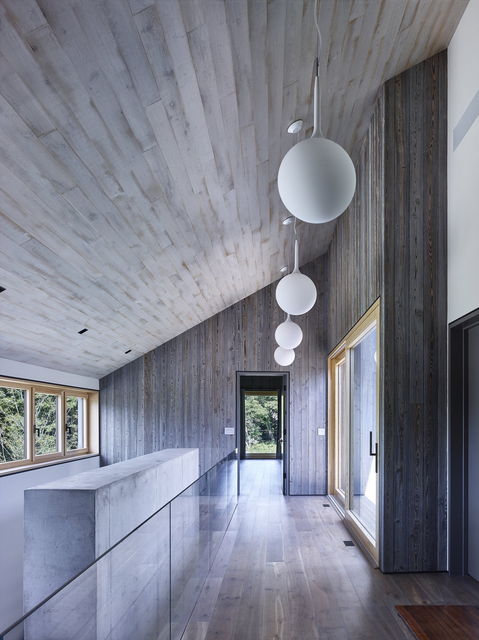 Since the clients wanted a maintenance-free house, the studio used hard-wearing materials as well as simple volumes without detailing. On the exterior, concrete gives way to charred cypress that resists damage, while the roof features zinc panels. As a result, the house’s facades will weather and patina over time in a natural way. The blend of concrete and wood continues throughout the interior. Inside, warm, lounge spaces boast wooden surfaces, while concrete appears in the anchoring walls. The ground floor contains the main social spaces as well as a guest bedroom. The living room features an elongated steel box embedded into a wall, housing the owners’ vintage vinyl collection. The size of the windows and the style of the overhangs create a comfortable, private feel while also connecting this area with the outdoors.
