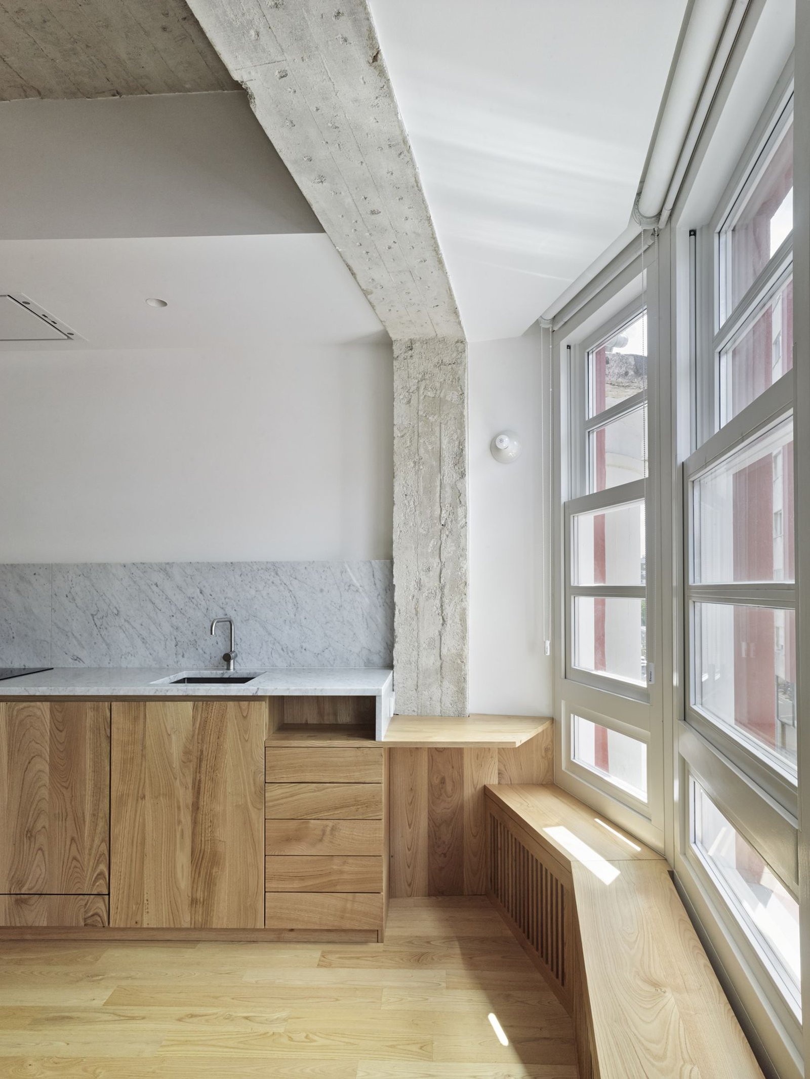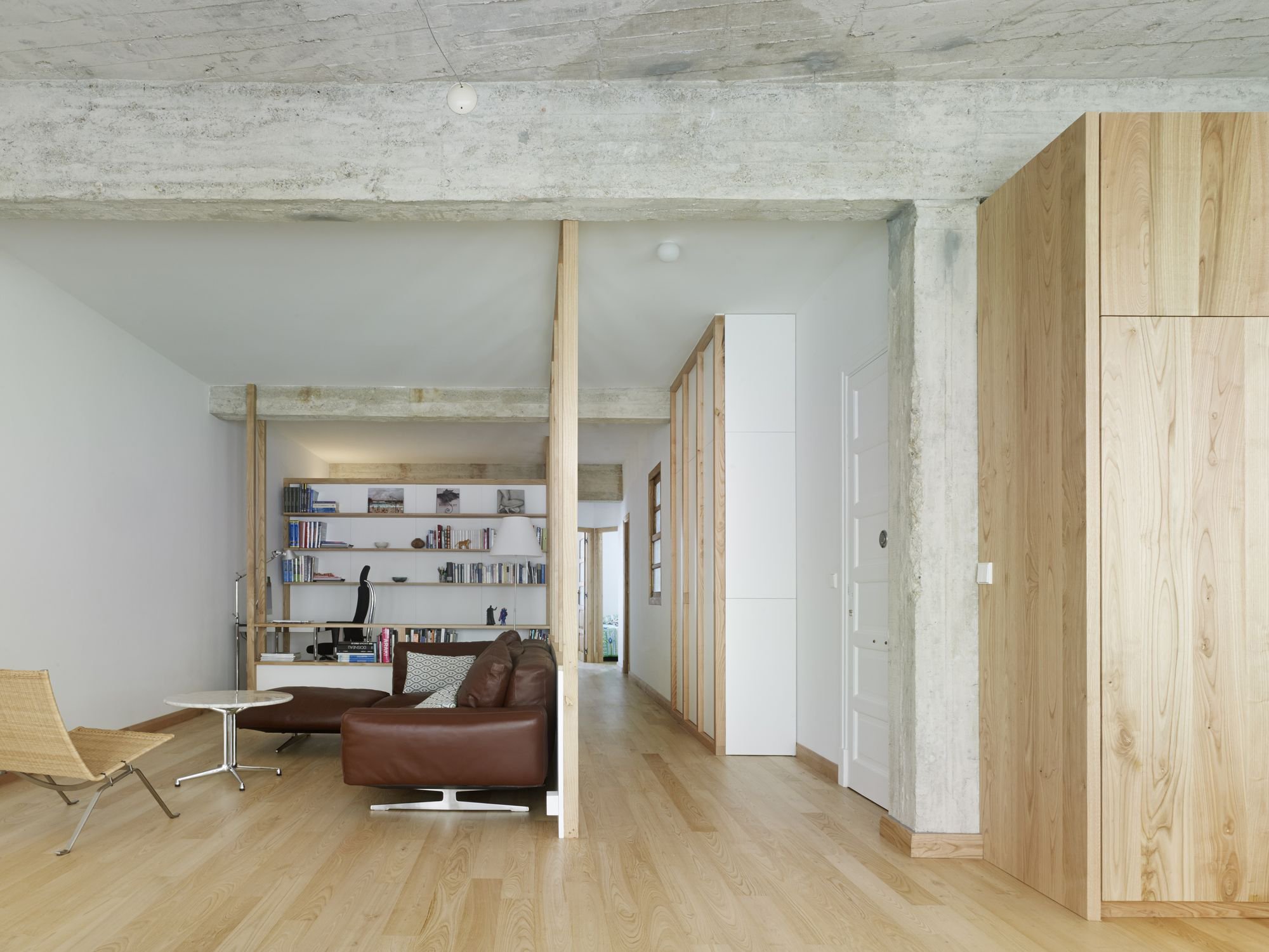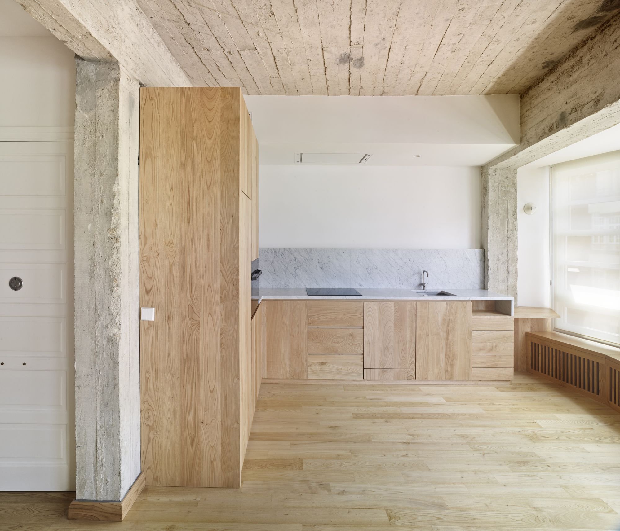 The studio recovered and restored various elements, from the concrete roof to the original doors. Carefully chosen materials complement the wooden and concrete surfaces in a refined way. The new additions include solid chestnut and lime plasters as well as hexagonal tiles in the bathroom and a Carrara marble countertop in the kitchen. Rough textures complement refined surfaces, with minimalist furniture used sparingly to enhance the airy feel of the rooms. Throughout the interior, the combination of rustic wood and white walls creates a bright, welcoming atmosphere. A new, contemporary chapter in the history of this ‘60s apartment. Photographs© Héctor Santos-Díez.