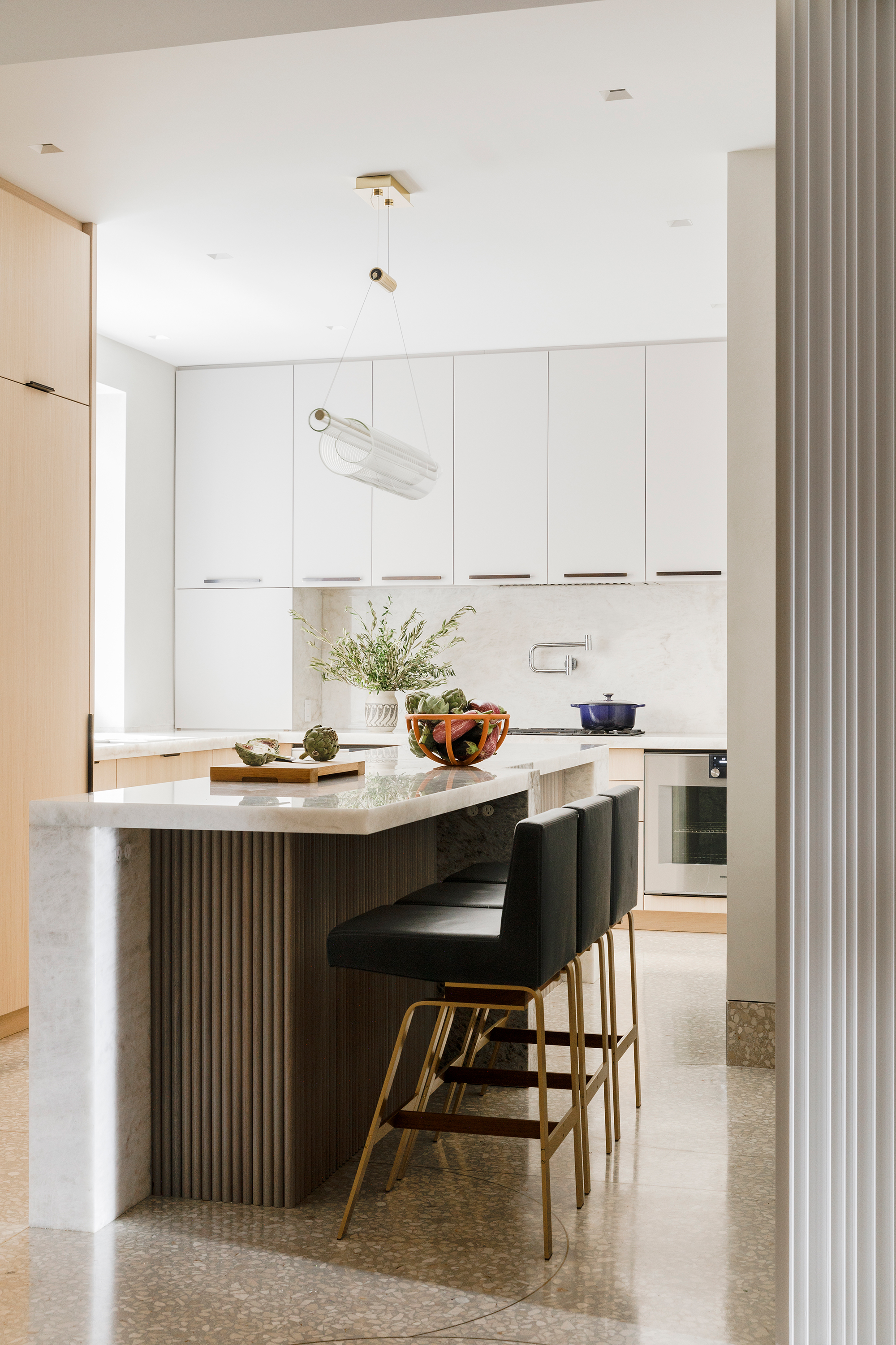Located on Park Avenue on the Upper East Side in Manhattan, NYC, this sprawling 4,000-square-foot apartment was transformed completely by architecture firm Michael K. Chen Architecture (MKCA) who designed a refined but playful home for a family of five. The clients’ brief focused on a need for flexible, open spaces where the family can come together or entertain guests. The architecture firm also received the task of creating a home with an expressive, distinctive aesthetic. Reorganized to establish a more natural, fluid transition between different areas, the apartment now features a central pinwheel-shaped circulation zone. This area comprises the elevator landing, entrance gallery, and kitchen. “The regulated fluidity of circulation allows for sprawl across multiple rooms, while also celebrating and activating the formal gallery space, which is such a hallmark of a classic Park Avenue apartment,” says Michael K Chen, principal of Michael K Chen Architecture.
