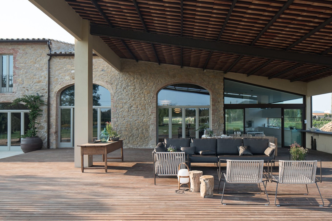 Inside the house, the past and present coexist in perfect harmony. Rustic meets modern in a living space that oozes comfort and style at the same time. Ancient stone walls and arches alongside wooden beams complement sleek glass surfaces, black steel and minimalist furniture. Flooded with natural light and illuminated by designer lighting, the open-plan spaces provide a relaxed, welcoming atmosphere. In the living room, a painted carbon steel Bubble fireplace designed by Antrax IT adds warmth to the elegant setting, while also bringing inhabitants together. Outside, a covered terrace doubles as an outdoor dining room. Here, guests can admire the gorgeous garden that includes a beautiful pond, local vegetation and a modern pool area, all surrounded by green fields. Photography by Miquel Coll.