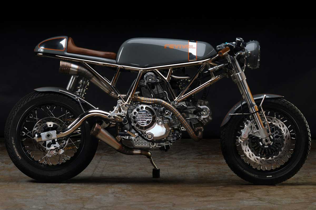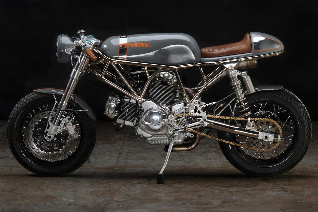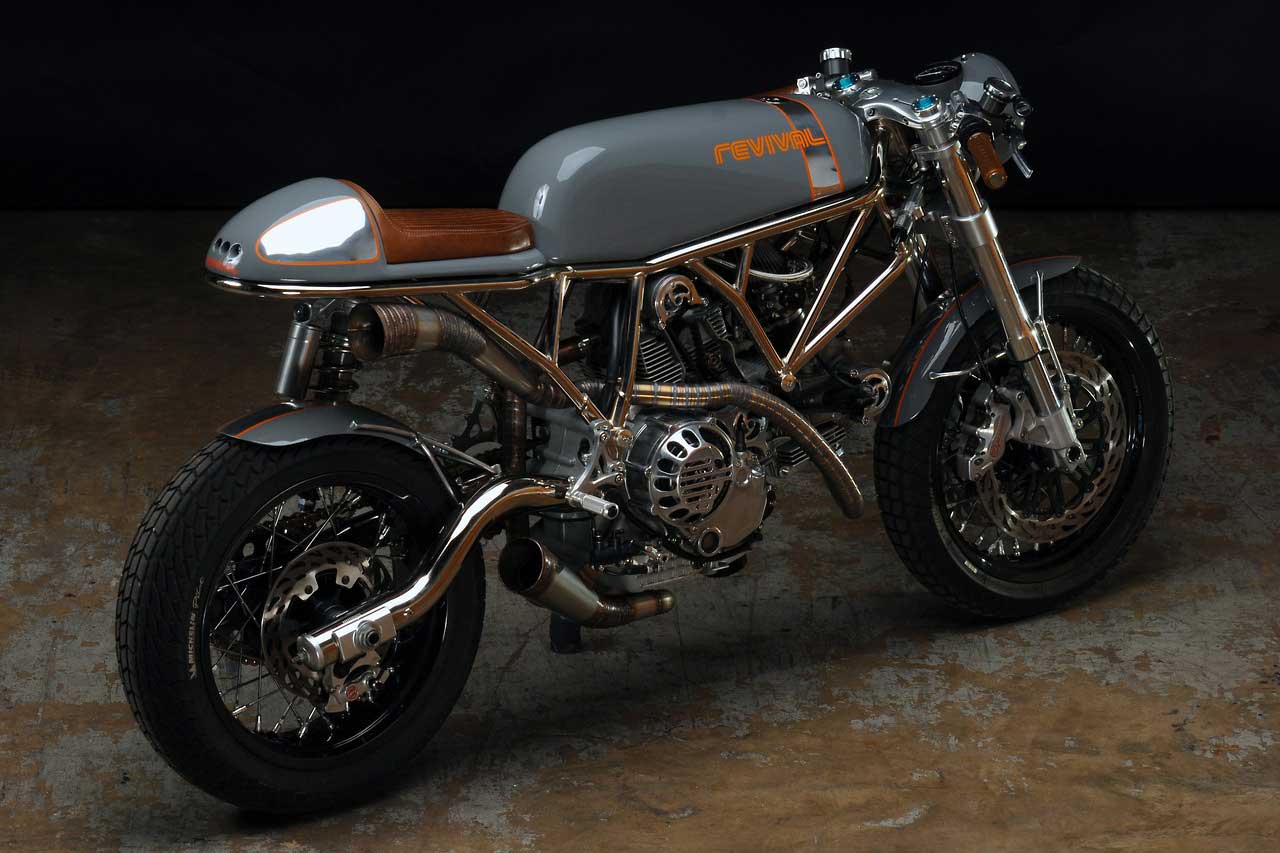 The Ducati SportClassic is a dream makeover by Revival Cycles. The client wanted the bike to work better for his height and also to work better. “It came to us a bit battered and bruised,” remembers founder Alan Stulberg. Although taken in stride the end result widened the body, exposed the sexy tank, and finished it off with a rich coffee tone tint throughout. A flat charcoal cover and luxurious leather finishes on the saddle and handle bars classify this project top notch. With a few tweeks the rear subframe was modified 6” thinner, the seat was moved back over 5?, relocated the steering damper, new alloy fenders added, and the frame and swingarm warmly nickel-plated. The wheels are Alpina carbon fiber with new Michelin Pilot racing wet-weather tires; the Discacciati braking system is legit from JC/Pakbikes. Electronically stocked being rewired around a Motogadget M-unit and including a custom ECU. No better way to testify to the awesomeness of such a machine than a classic story that goes like this, “I like to say the bike sounds like it is about to kick someone’s ass in a bar fight,” says Alan. “The cops that pulled us over the other night for speeding said the same thing and let us off with a warning because they loved it so much.”