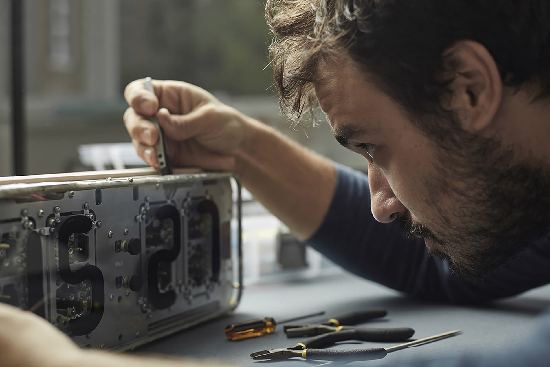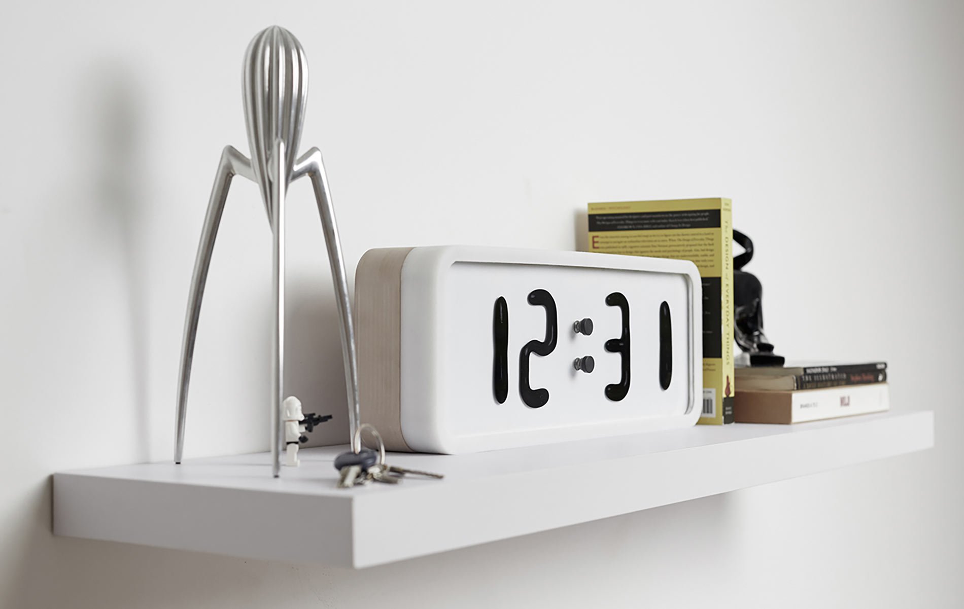 Void of ornamentation and color, apart from the exposed natural wood backing, the aesthetic focus and creative novelty of Rhei is in its fluid time display. The curved number display is further accentuated by the smoothed edges of its well-crafted container, and similarly contrasted being juxtaposed directly against the boldly protruding colon hour and minute separator. The practical expression of this kinetic sculpture contrasts mechanical horology with the sensory notion of time twofold, first as the dark numbered forms float, constantly changing within their whitened void container, and secondly as the viewer watches the object’s mechanical performance move in organic resonance.