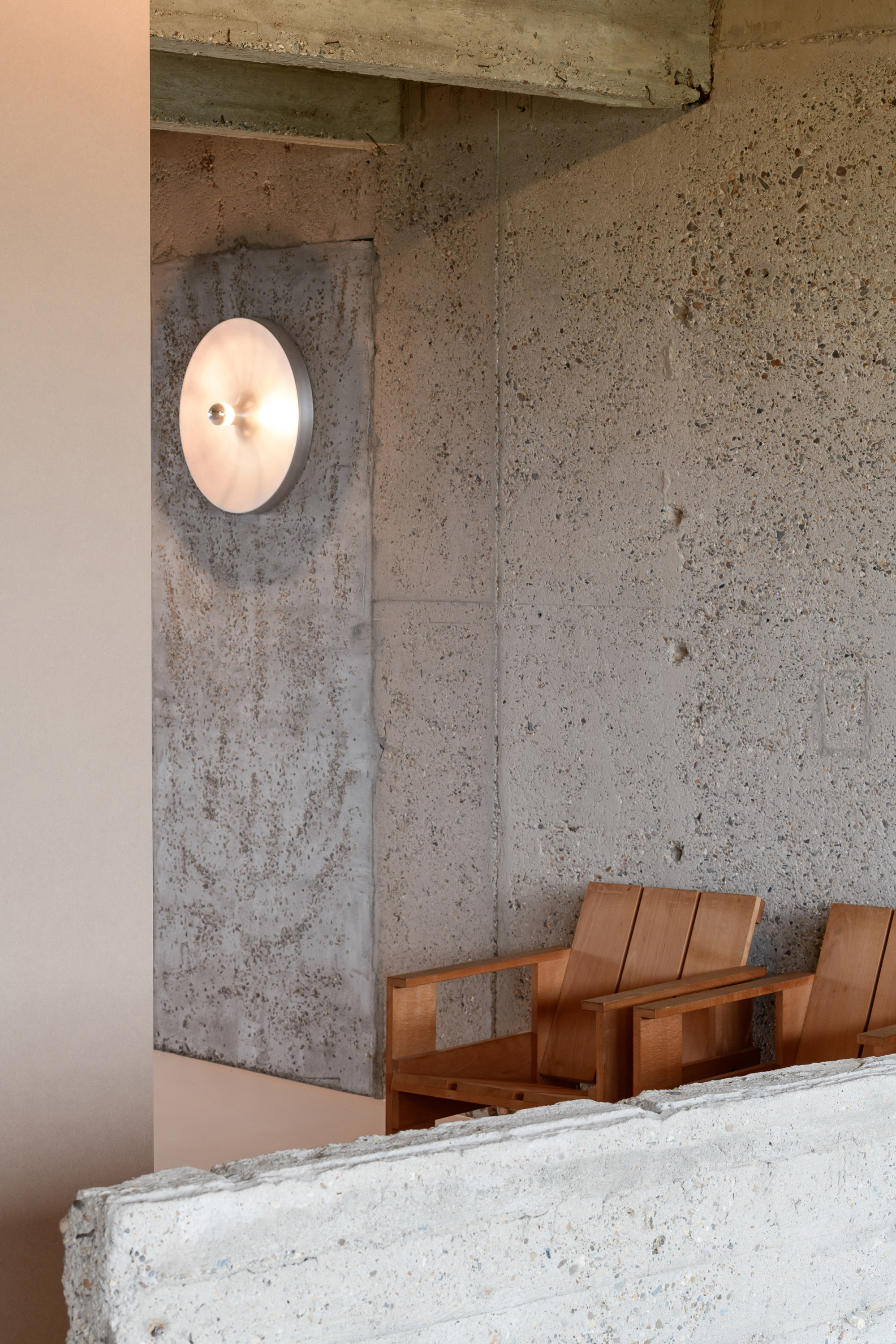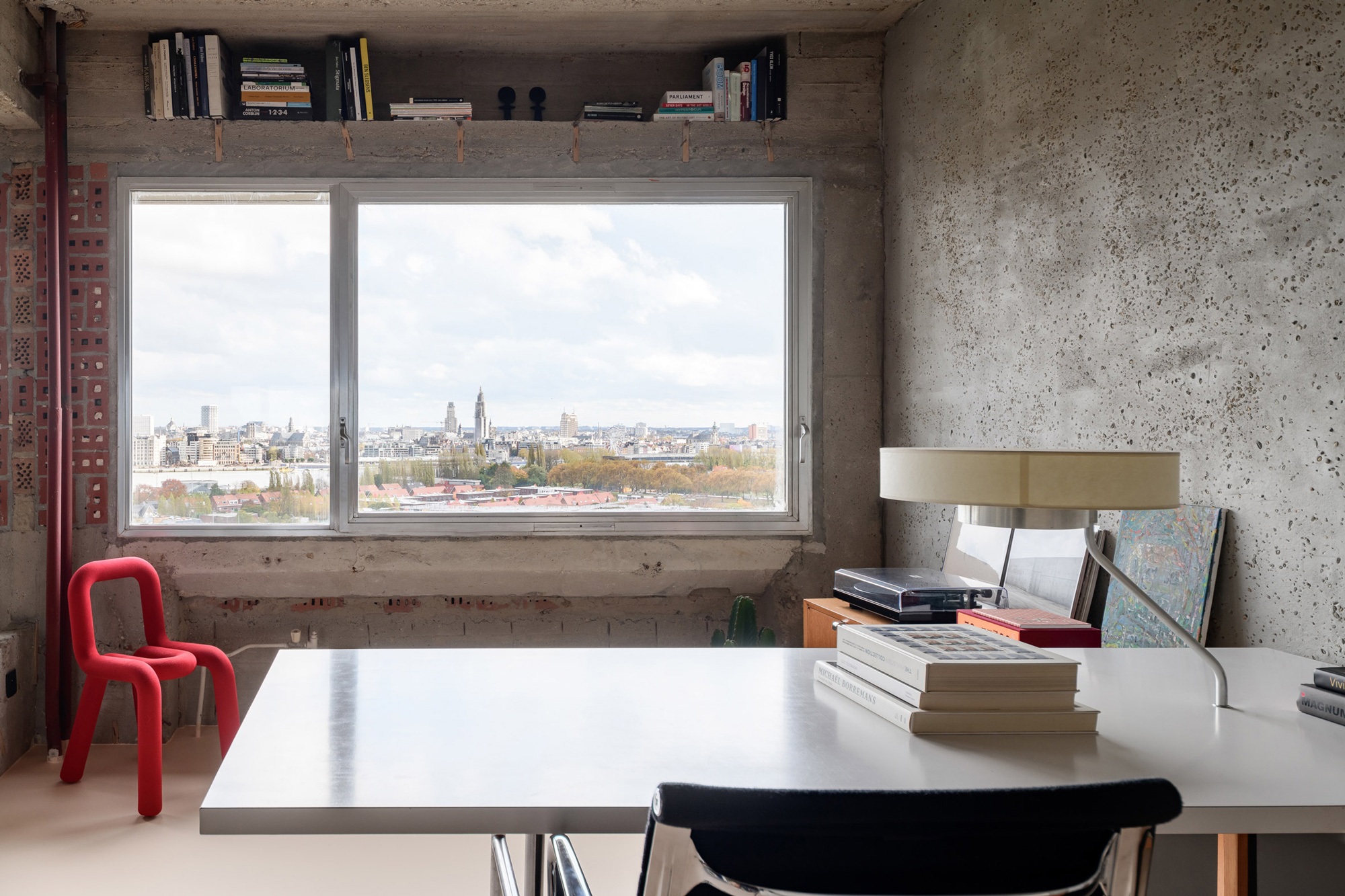 Located in the Riverside Tower building in Antwerp, Belgium, this duplex is the home of Bram Van Cauter of Studio Okami and his partner, art collector Doris Vanistendael. The 20-story brutalist-style building also houses the architecture firm’s office and Vanistendael’s art gallery. Renovated by the studio, the apartment features raw concrete walls with rugged surfaces. Removing all wall coverings allowed the architect to highlight the brutalist character of the space and to also give the home an industrial aesthetic. The studio also took down some walls to create open-plan layout on the two levels. While originally the apartment had five bedrooms, it now contains airy spaces and one master bedroom.