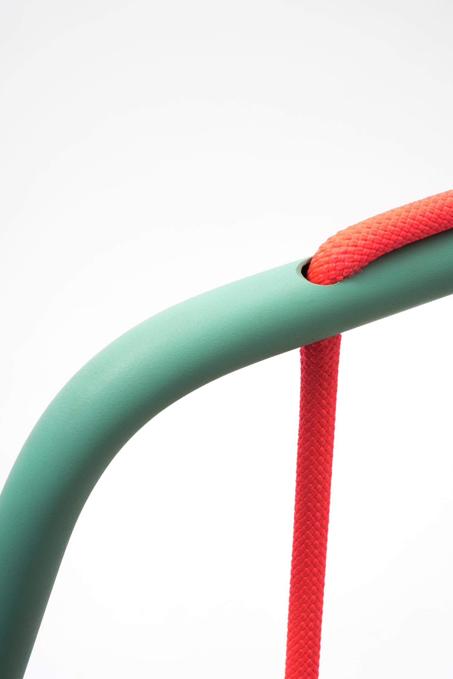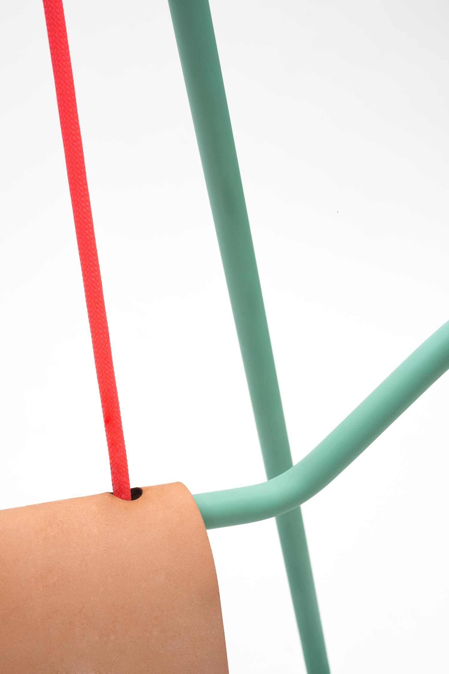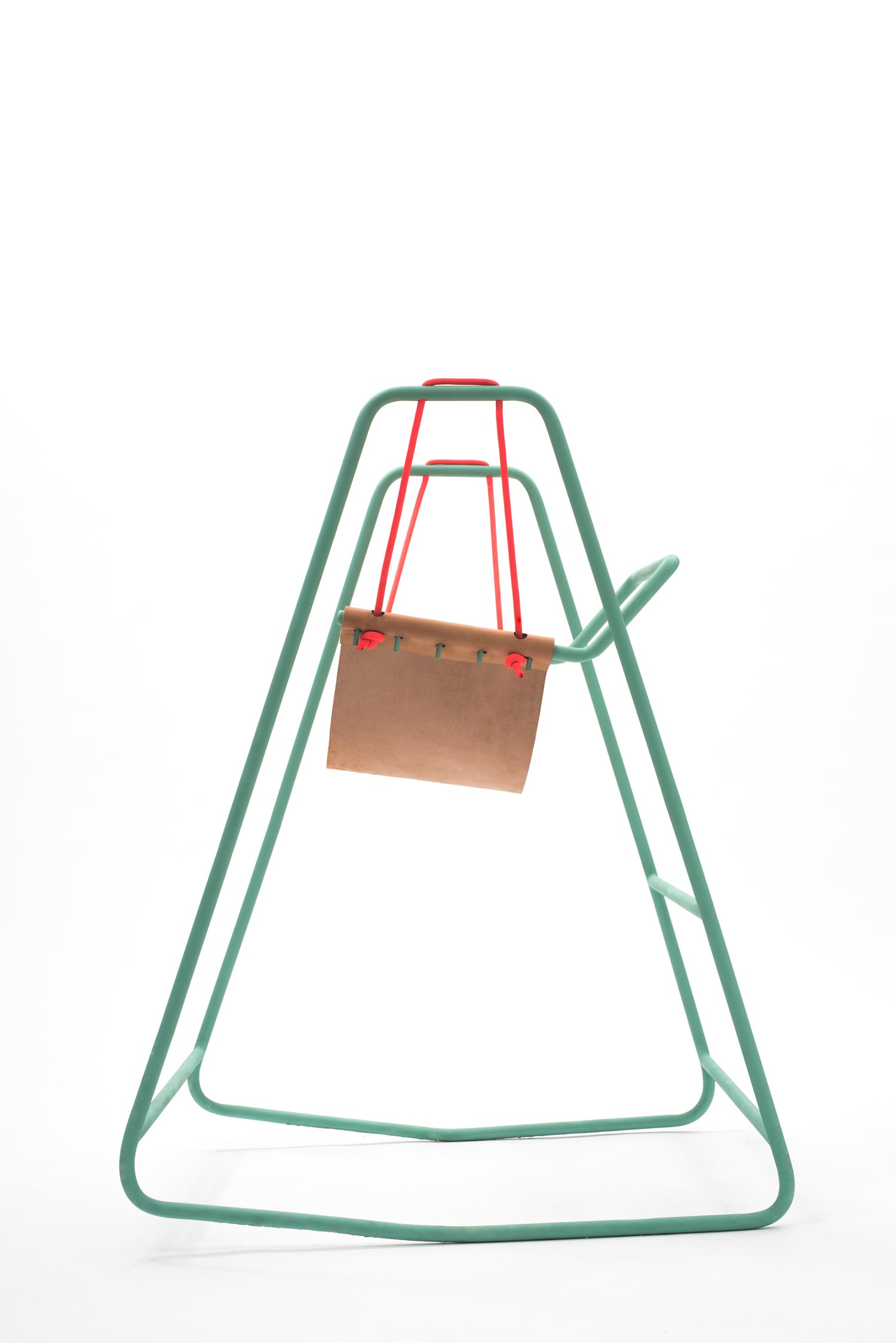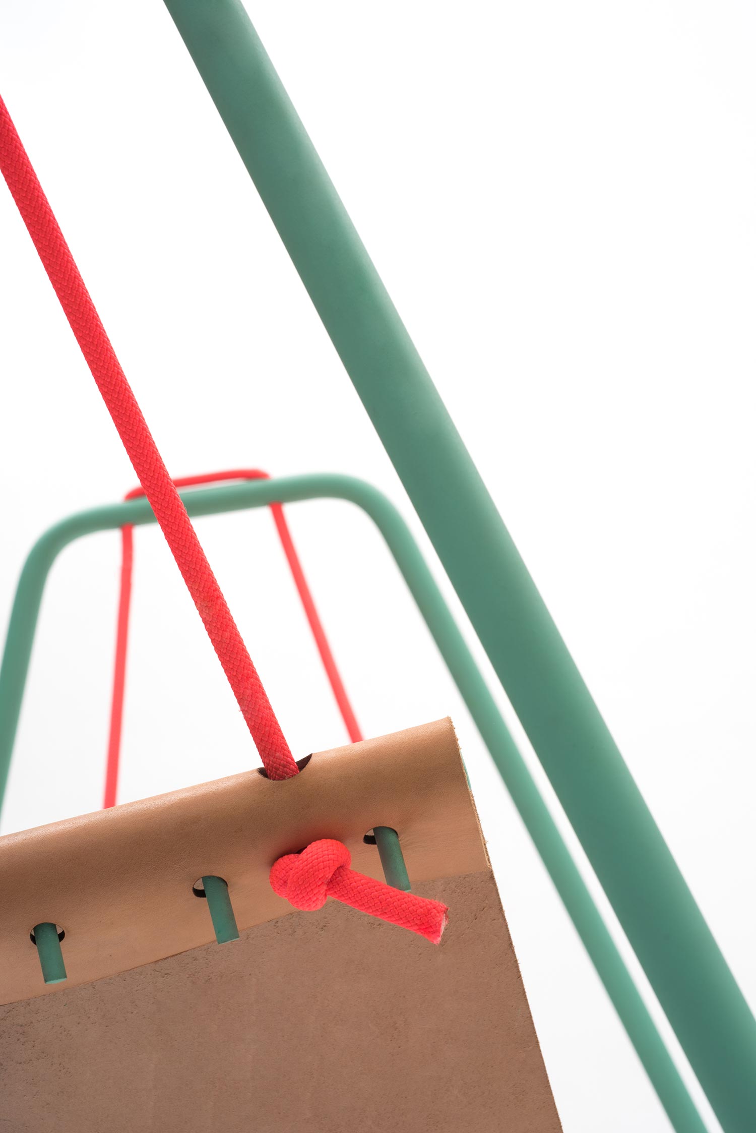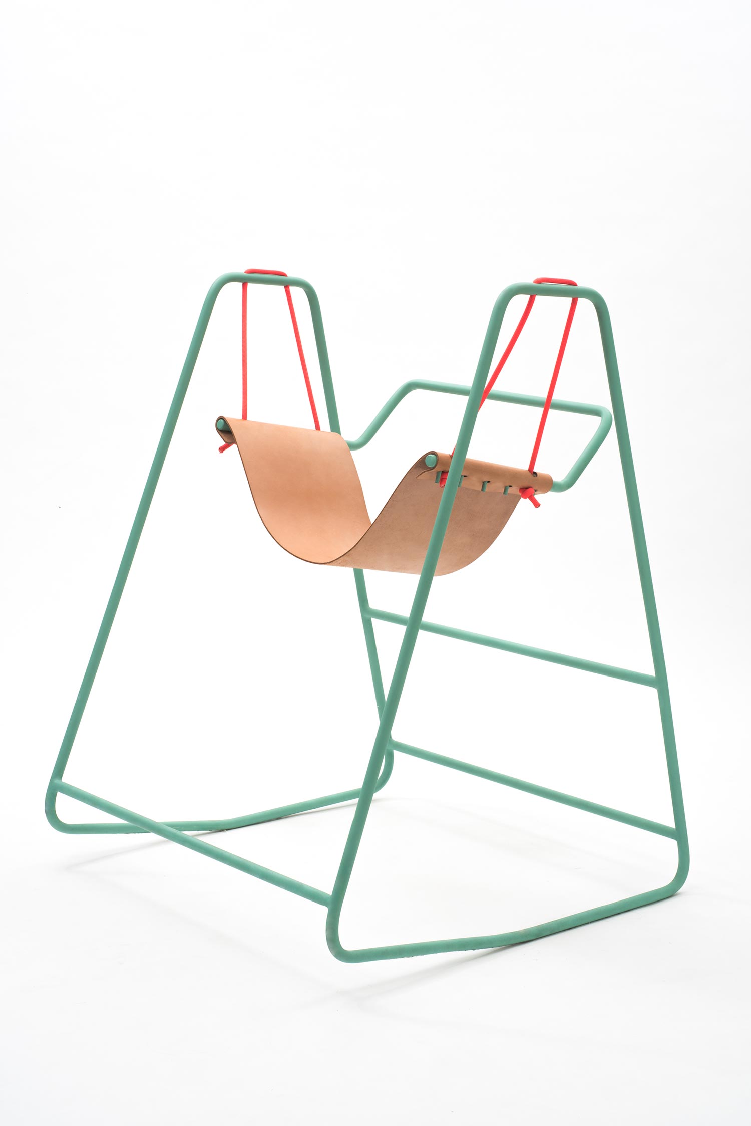 We sit more than we realize: at work, during meals, on the phone, in the car, while we chat with family and friends. But in reality, our lives aren’t so static – and neither is Rocking Swing, the chair by Industrial Designers Tobias Nickerl and Clara Rivière that merges young and old, action and repose. Created for both in- and out-door use, the piece subtly draws on two familiar archetypes, a child’s swing and a grandparent’s rocking chair, for a reduced design with a whimsical “double movement;” a leather seat hangs from the metallic main frame which meets the floor with angled blades. Clean connections tie the playful product together, as seen in the striking orange rope that comes to a knot at the edge of the seat and its cheerful linear turquoise frame. Simple, engaging, and remarkably intuitive, Rocking Swing brings “intergenerational fun.”