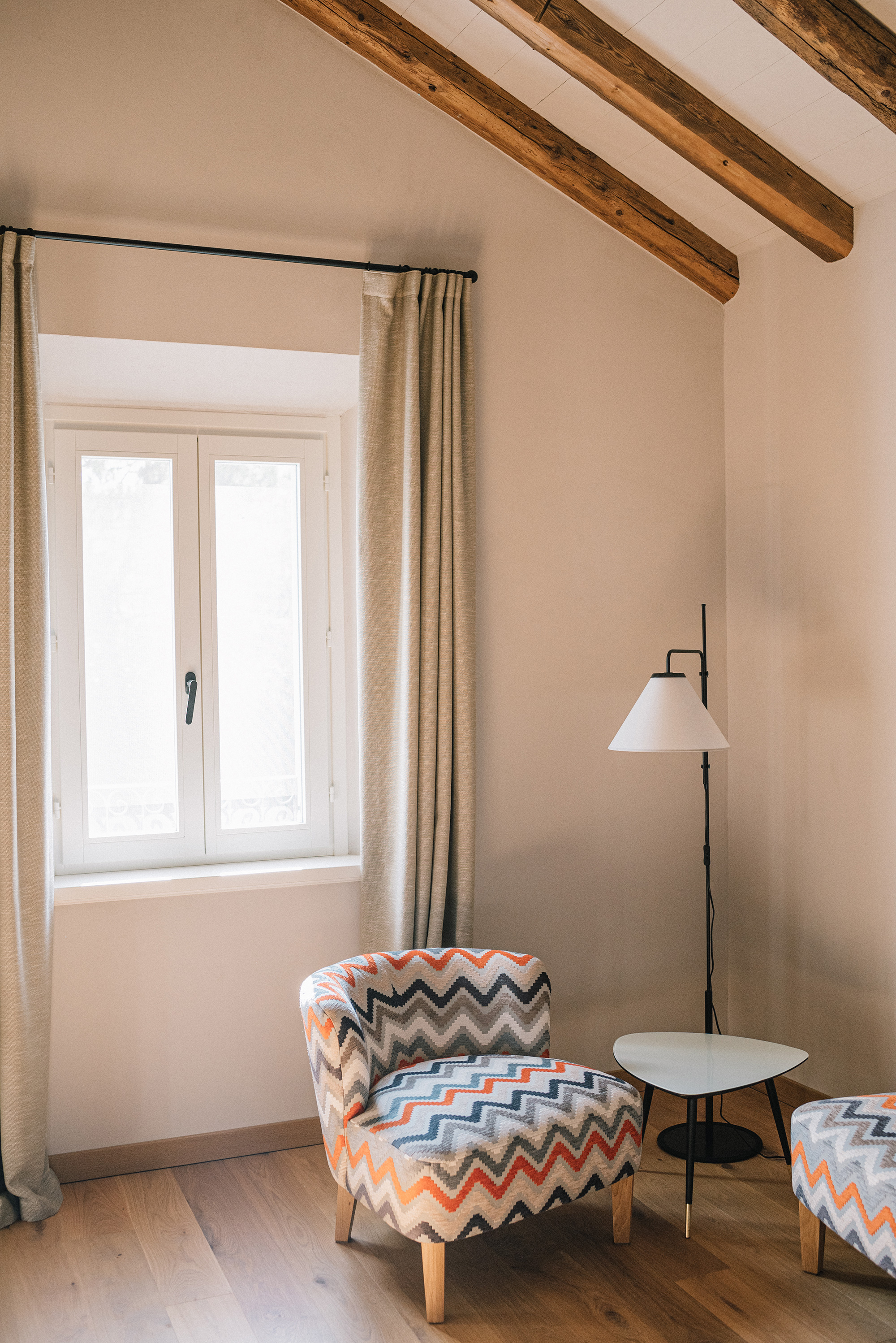 This high-end bed and breakfast has 9 double bedrooms and two double bedroom suites. The rooms boast a blend of original rustic touches and contemporary design. Wooden beams, traditional tiles, and beautifully crafted furniture appear alongside blue and green colors, bold patterns, and minimalist lighting. The larger suites feature lounge areas with eclectic furniture, while the dining room boasts stone flooring and wood furniture. Windows provide great views of the picturesque area, from the garden and vineyards to the natural park of Roncolo.