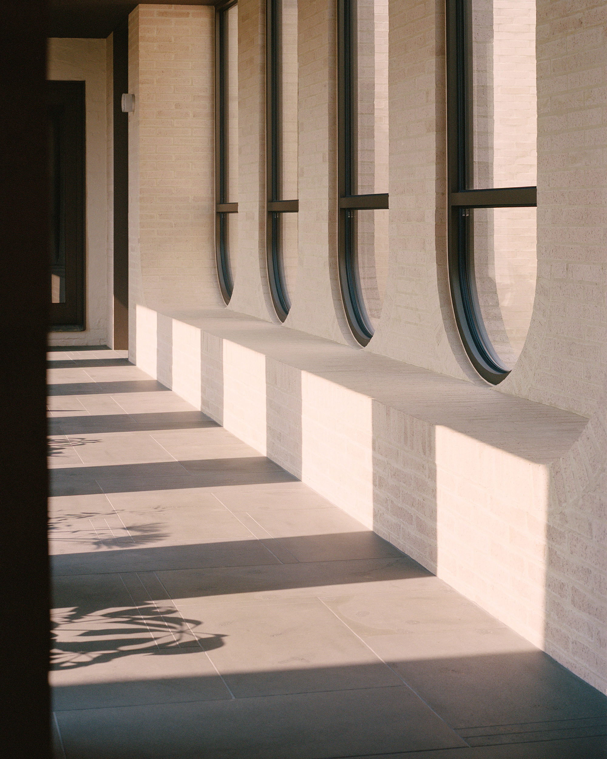 Inspired by Roman aqueducts, a brick volume connects the extension to the old house. Inverted arches double as sitting and playing areas for the children. This connecting element also features a stained glass window created by artist Nadine Keegan who used different motifs that reference the city, the Greek and Italian heritage of the families living in the neighborhood, and the Wurundjeri people, an Aboriginal Australian nation. Inside the aqueduct-like bridge, there’s a long swimming pool. Thoughtfully anchored to the site, the property also features concrete exterior walls that remind of the neighborhood corrugated iron fences. The studio also implemented green systems like solar panels and extra-efficient hydronic heating. Photographs© Rory Gardiner.