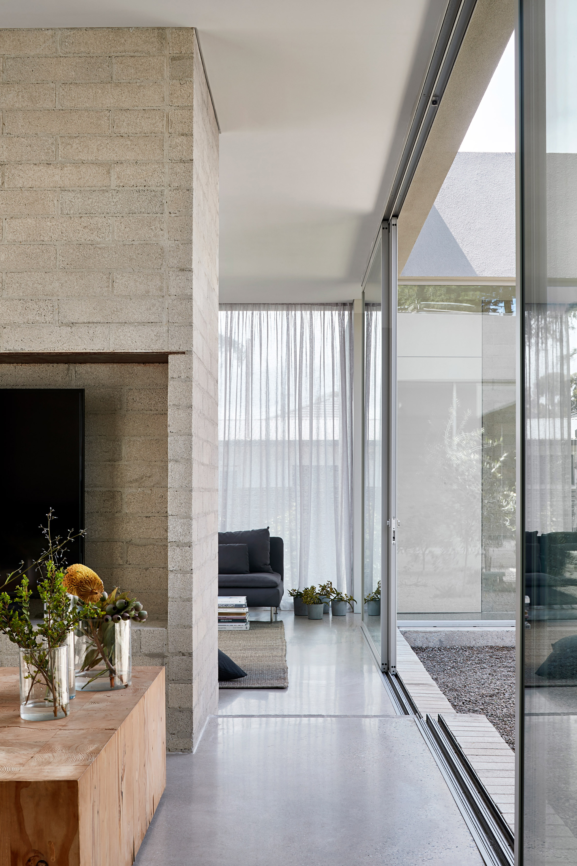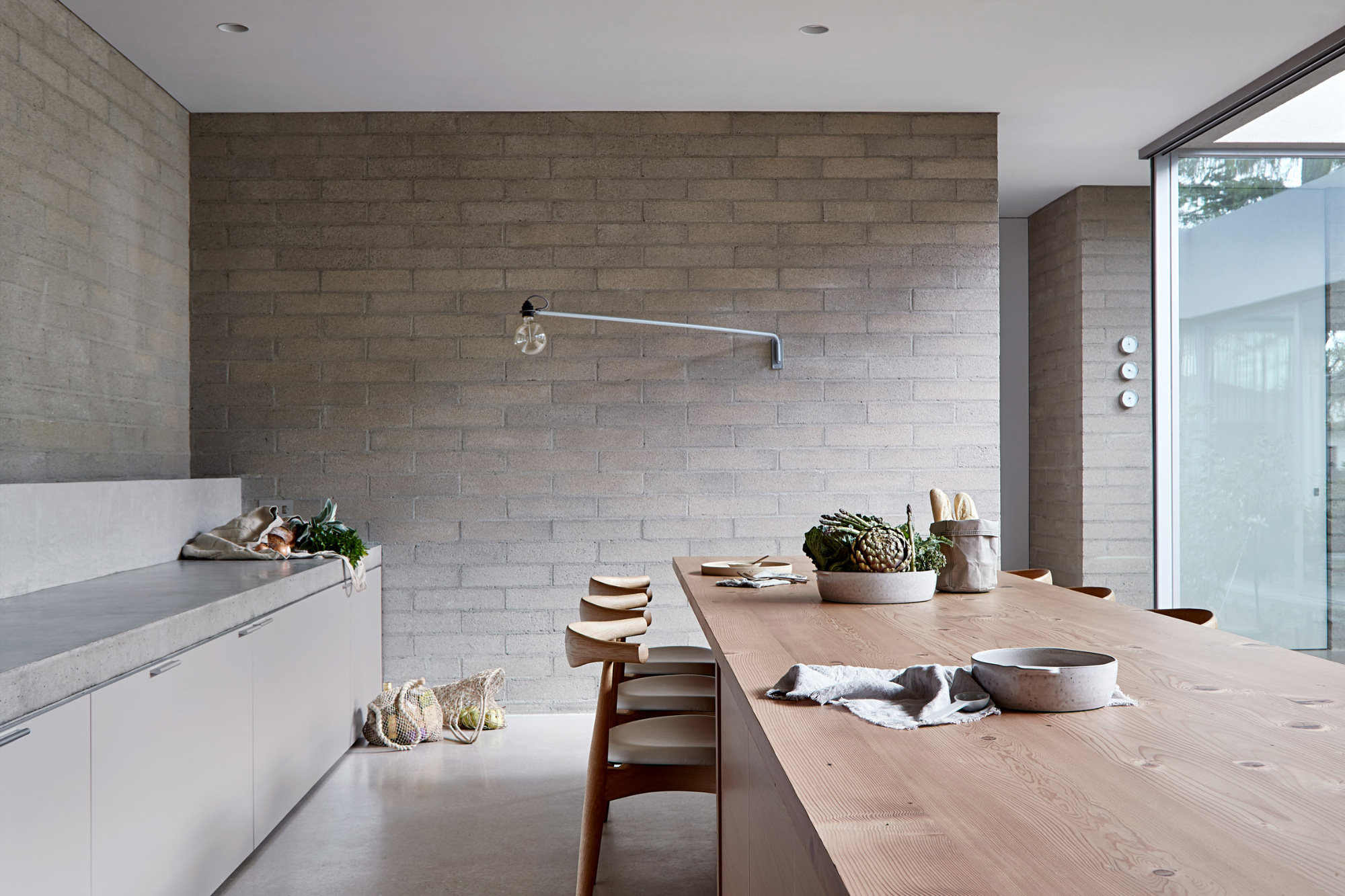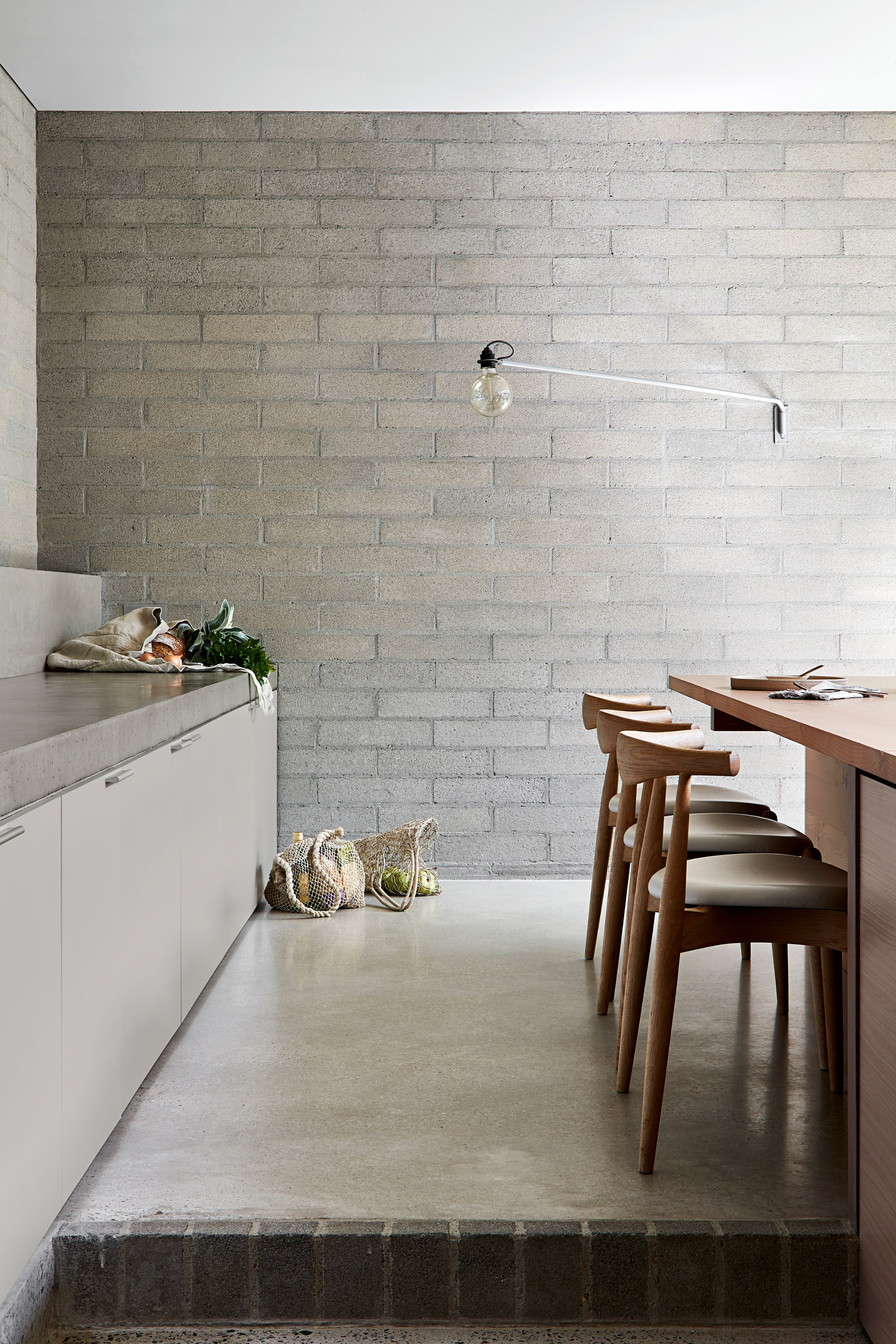 Without any superfluous details, the simple living spaces put the focus on slow living and mindfulness. The studio used a minimal material palette as well as light hues. Gray brick and solid wood complement woven rugs and concrete surfaces. Cozy armchairs and a plush sofa enhance comfort further. In the modern bathroom, the studio used concrete bricks along with tadelakt, a Moroccan lime-based plaster. Bathed in natural light, the serene living spaces showcase the studio’s thoughtful approach to design. Photography© Shannon McGrath.