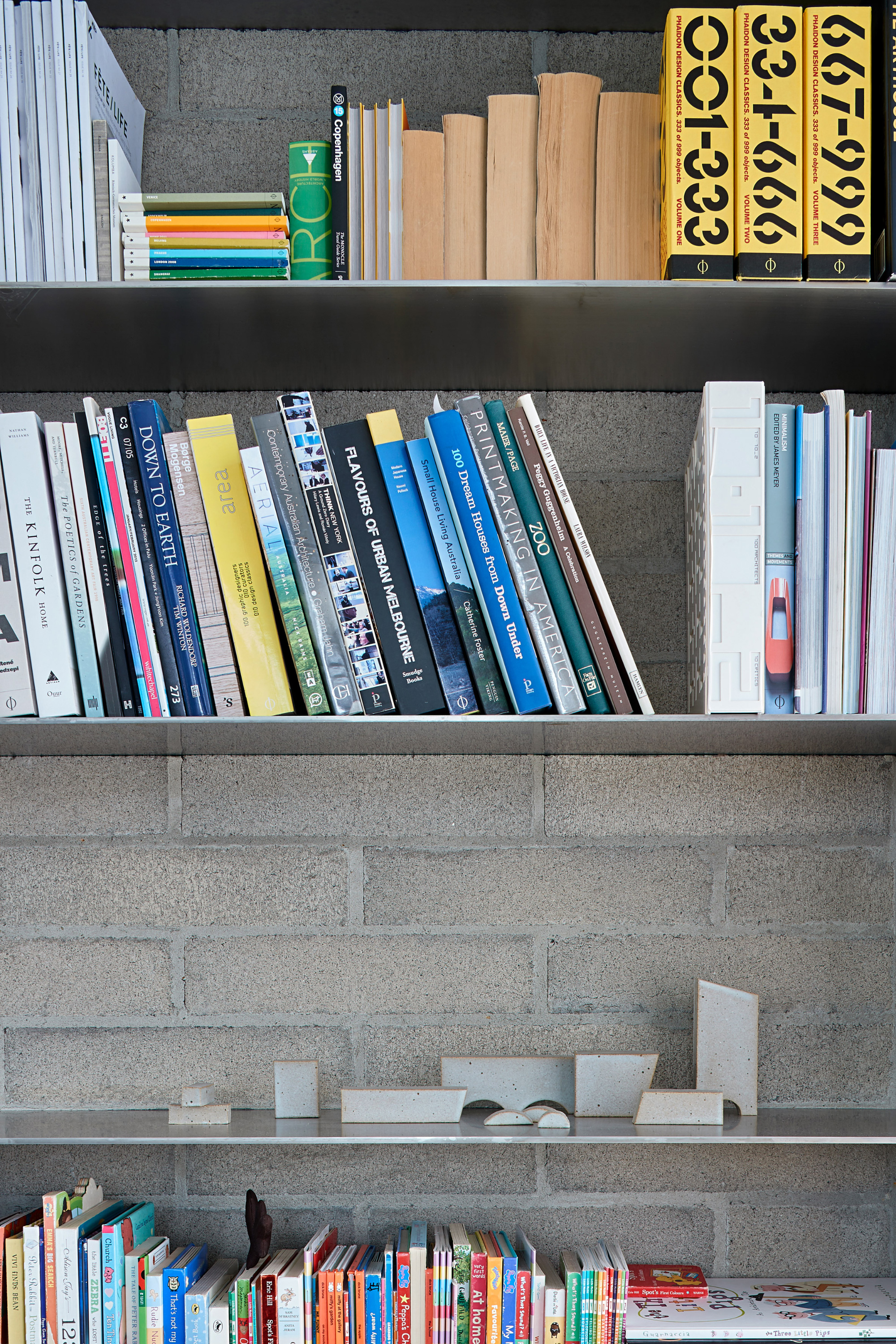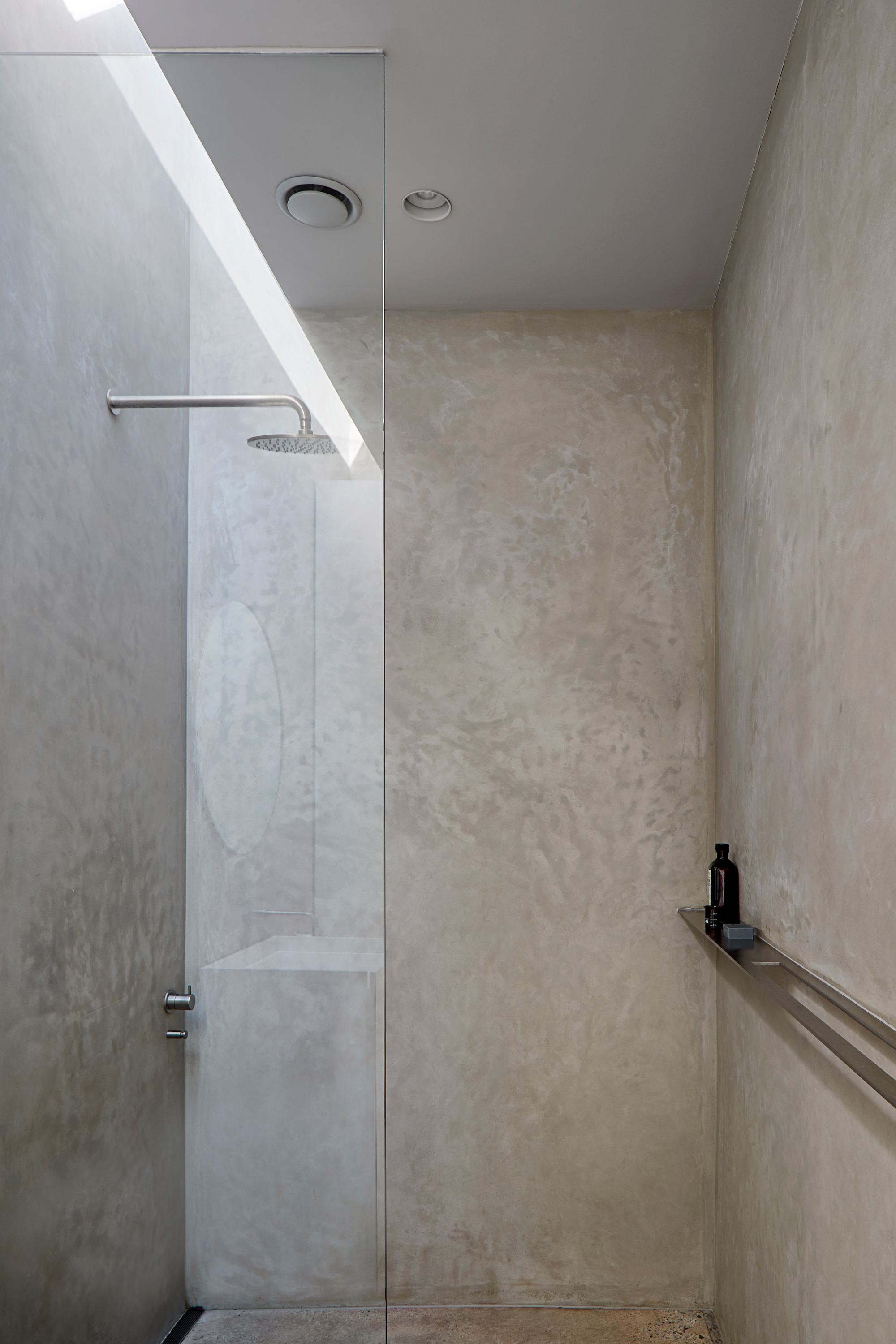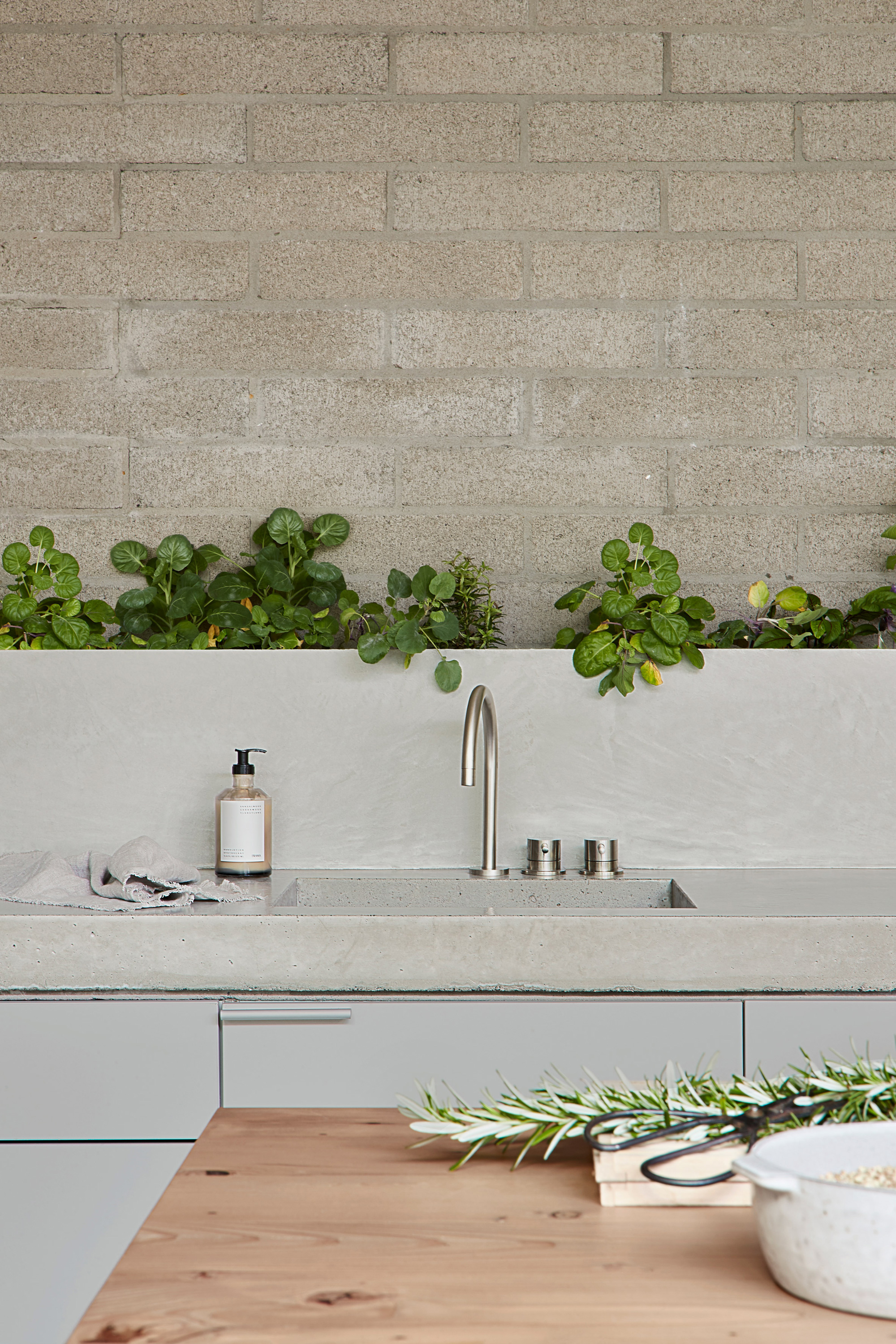 Without any superfluous details, the simple living spaces put the focus on slow living and mindfulness. The studio used a minimal material palette as well as light hues. Gray brick and solid wood complement woven rugs and concrete surfaces. Cozy armchairs and a plush sofa enhance comfort further. In the modern bathroom, the studio used concrete bricks along with tadelakt, a Moroccan lime-based plaster. Bathed in natural light, the serene living spaces showcase the studio’s thoughtful approach to design. Photography© Shannon McGrath.