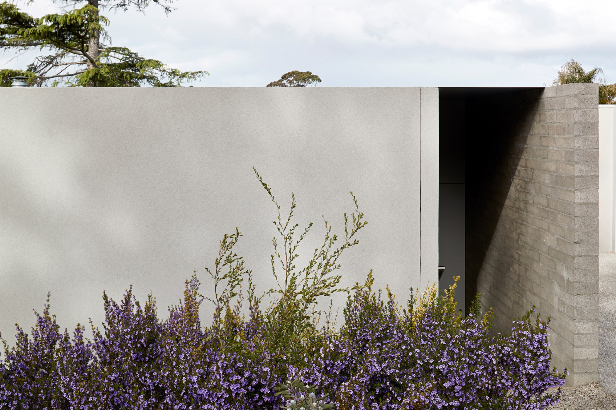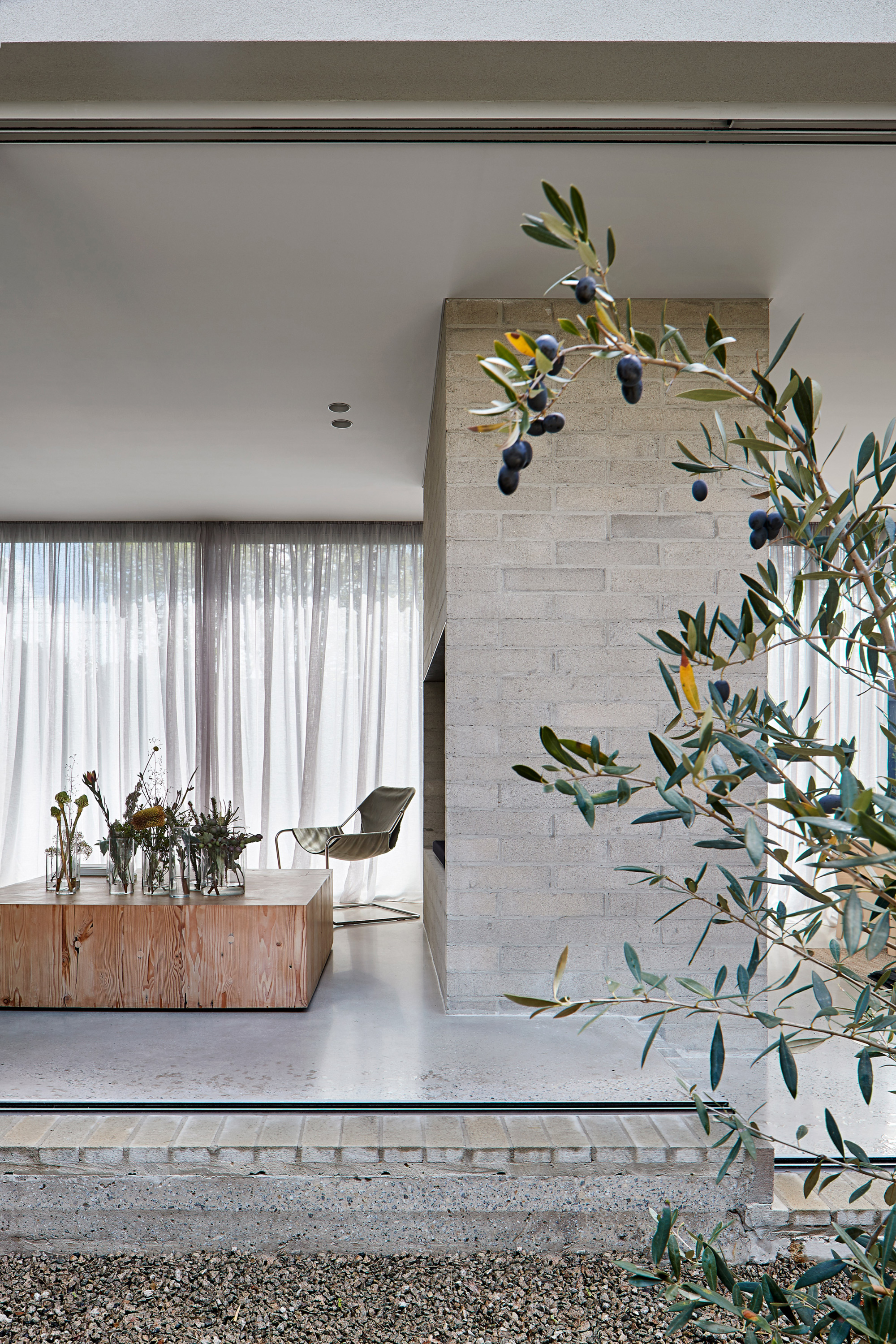 Melbourne-based Studiofour completed Ruxton Rise Residence for the architecture firm’s co-director Sarah Henry. Located in the Beaumaris suburb, the gray brick dwelling stands on a greenfield site among the neighborhood’s mid-century houses. Designed to encourage slow and simple living, the residence features understated interiors and a minimalist aesthetic. Humble materials and light neutral colors enhance the dwelling’s tranquil atmosphere further. While built from brick with a gray plaster finish, the volume offers a contemporary take on the area’s mid-century typology. A central courtyard with olive trees becomes the heart of the home as well as the connecting hub for the different social and private areas.