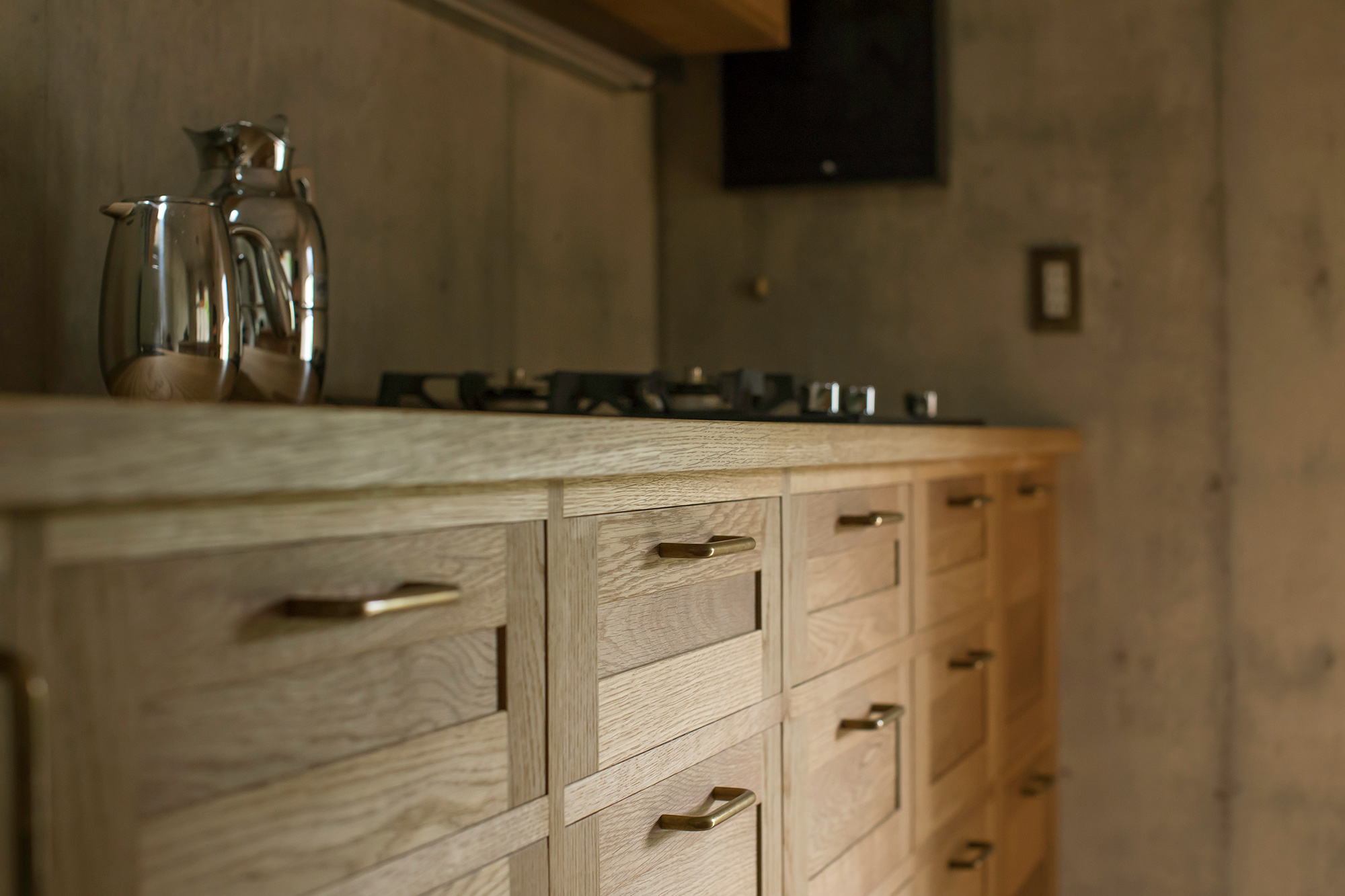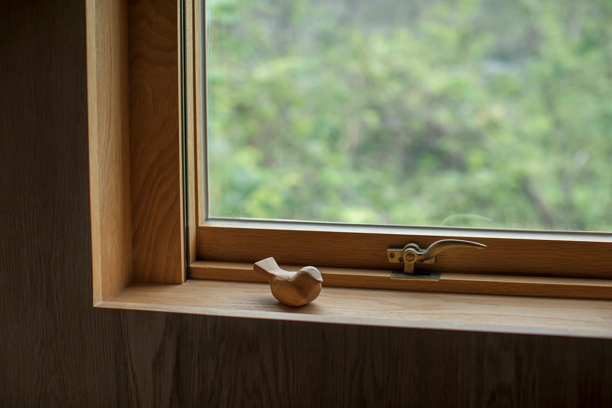 Minimalist furniture and lighting enhance the understated, airy rooms further. Apart from wooden cabinets in the kitchen, the decor also features a tan leather sofa and lounge chairs. In terms of lighting, the studio chose a simple pendant with a rich, dark copper patina for the kitchen and a creative design for the living room. Through the east facade, the lounge area overlooks the lush surroundings via a glazed wall. Featuring wood edges, these windows frame the views like an artwork; one that always changes – throughout the day and through different seasons. Photographs© Hiroshi Tanigawa and Yasuko Okamura.