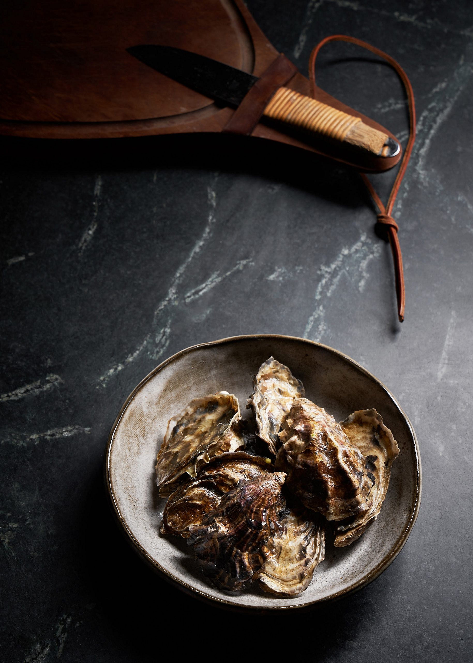A multi-level oven and grill becomes the heart(h) of the space – the fire that beckons people to gather around it. The central location of the wood-fired grill also gives guests a direct view of the food preparation process. The 38 seating includes a mix of chairs at tables with recycled wood tops, a leather banquette, and counter seats. Chosen for its connection to cooking, copper cladding wraps a section of the grill, while handmade Danish brick with embedded fused glass surrounds the oven. The copper and glass reflect the light of the wood-fired oven. “I liken the atmosphere to a Dutch still life painting. It’s rich and moody with an elemental simplicity,” notes Saul Becker.