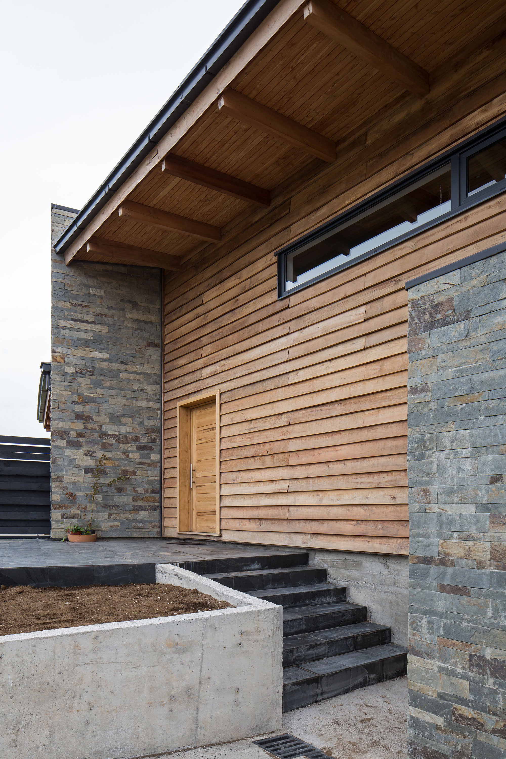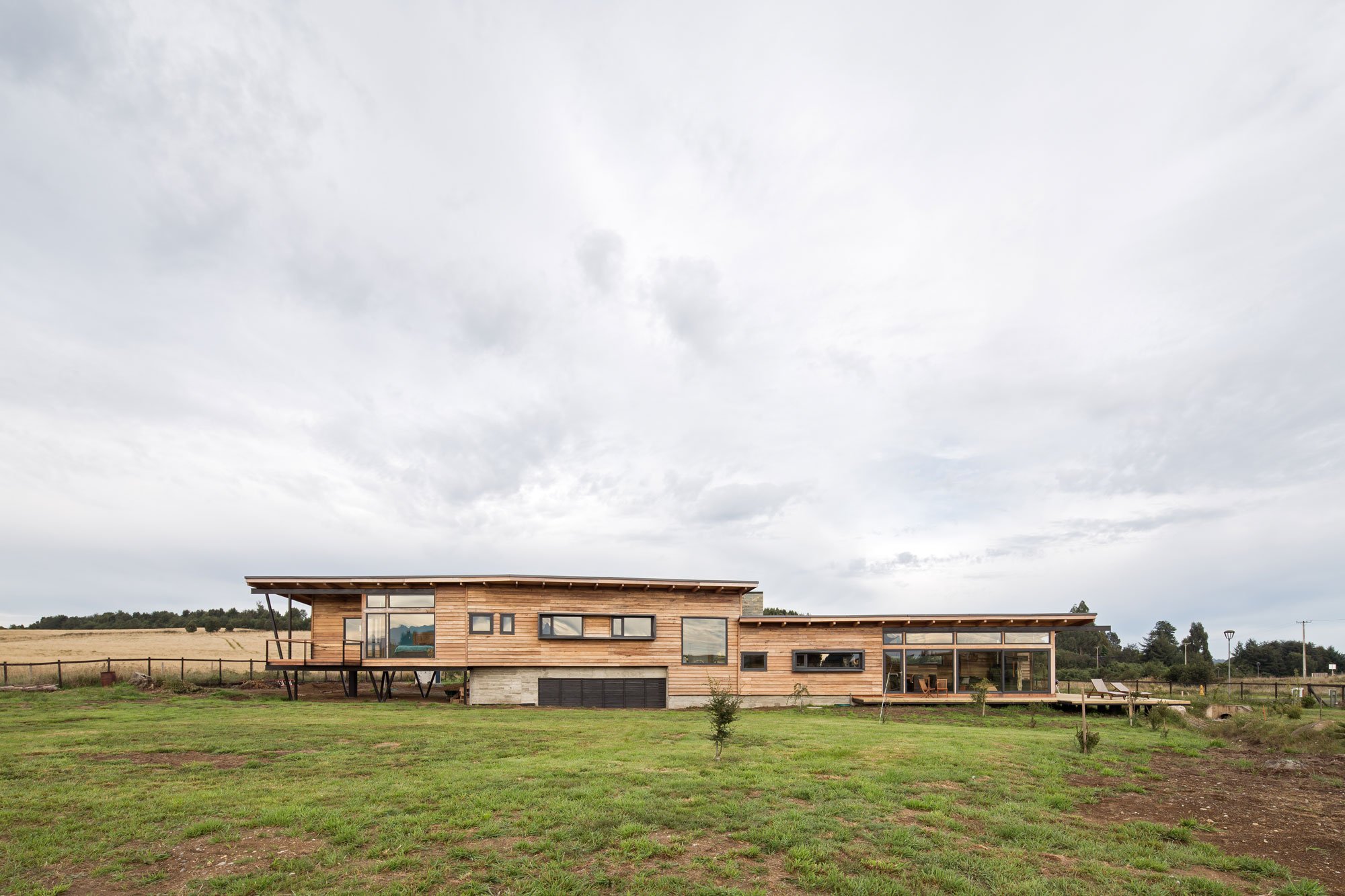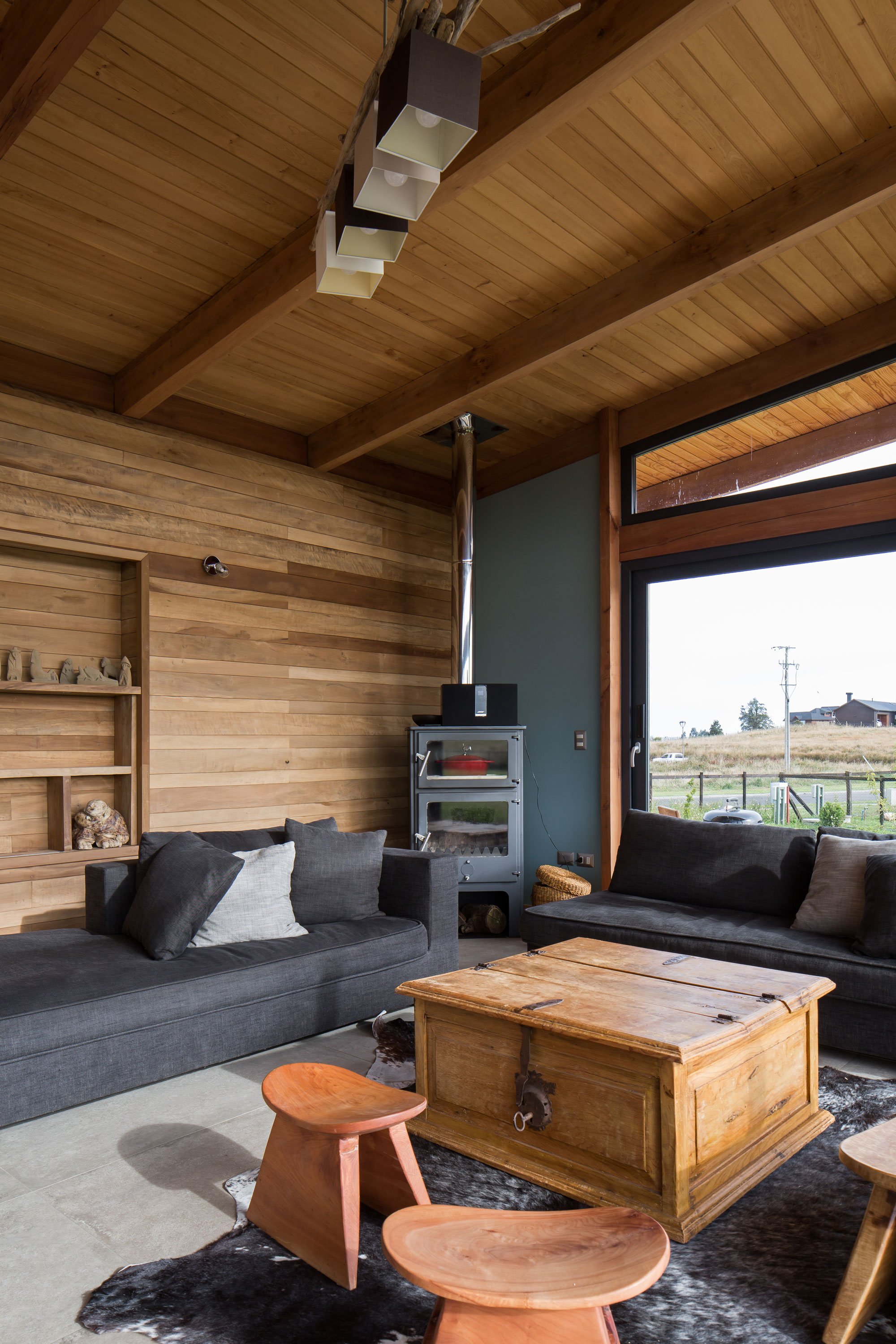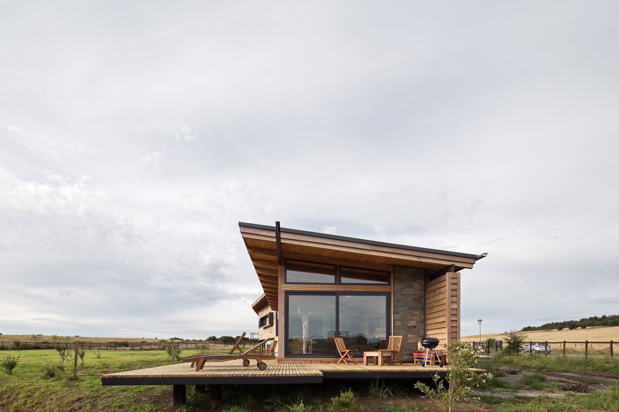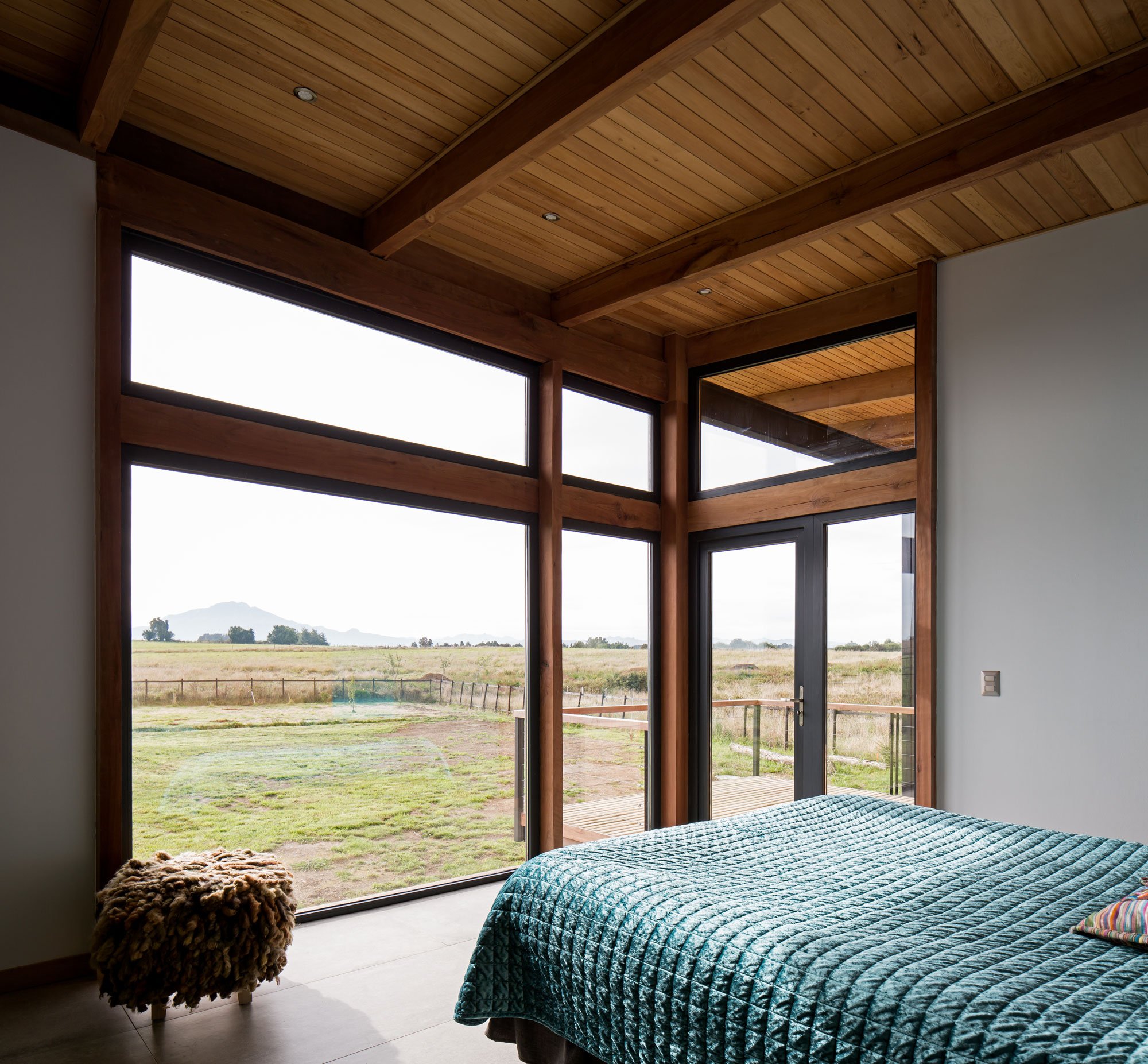 The elongated volume guides guests from the public rooms in the northern side to the south section that contains the bedrooms and private areas. Both sides of the house have their own elevated terraces which offer access to different, but equally stunning views. On the exterior and as well as throughout the interior, the studio used native wood, including oak, ulm, and mañio. Natural stone complements the warmth of the timber surfaces, anchoring the contemporary ranch house in its setting at the same time. Photographs© Nicolás Saieh.