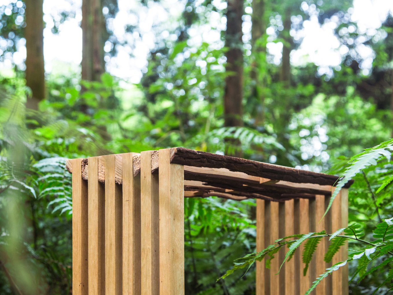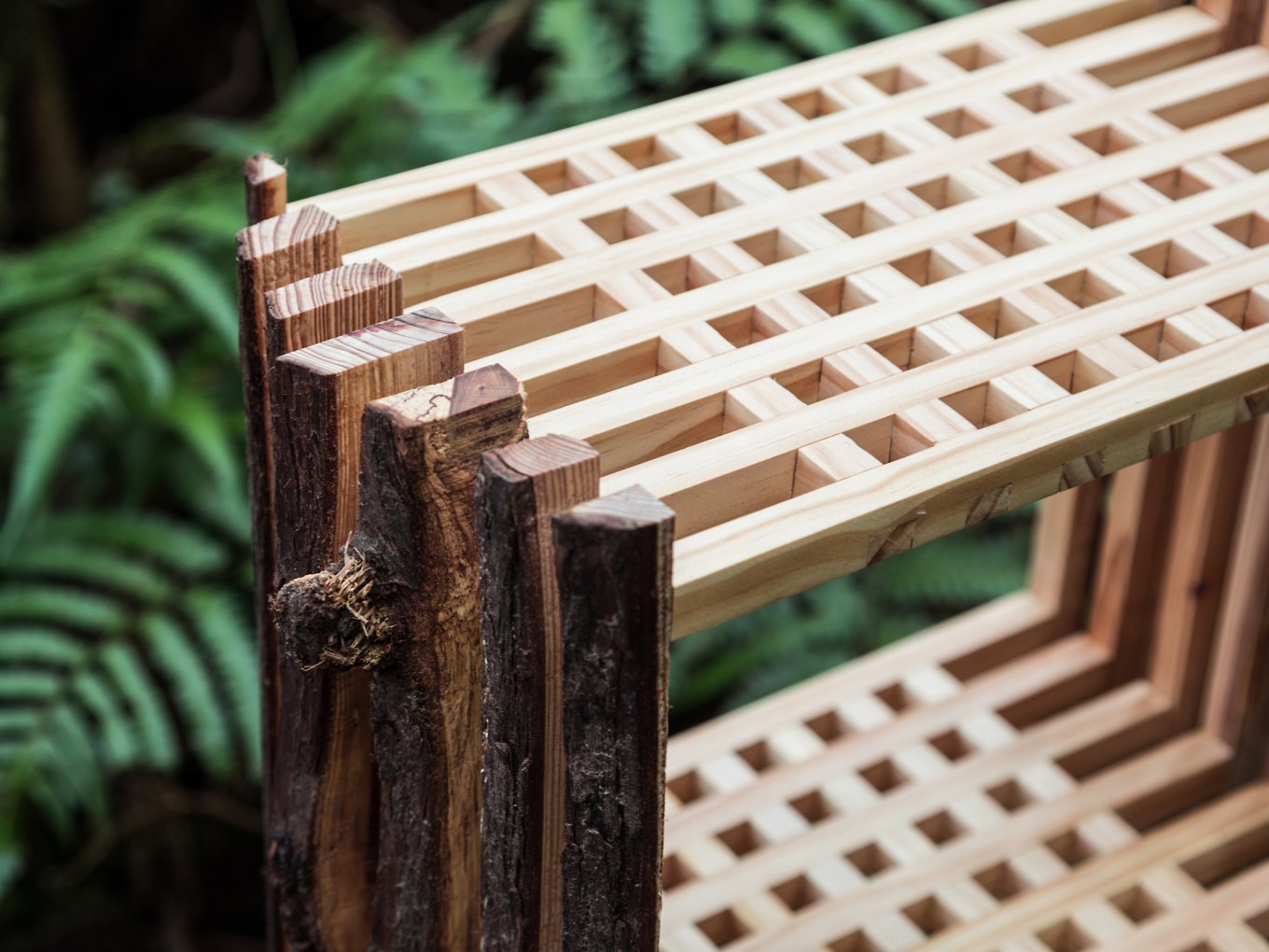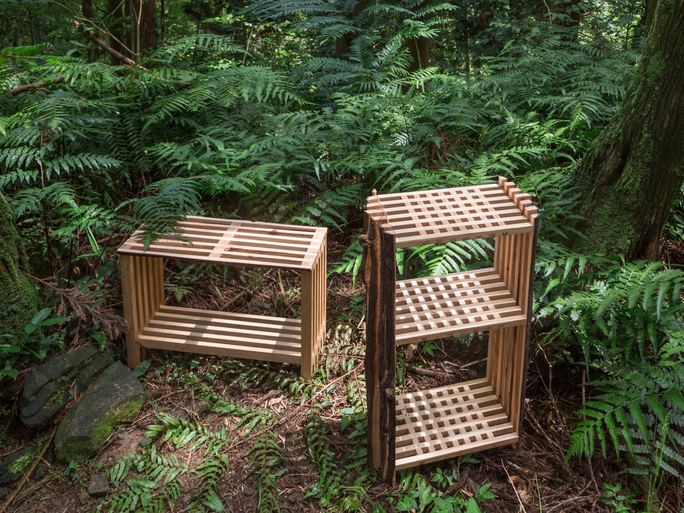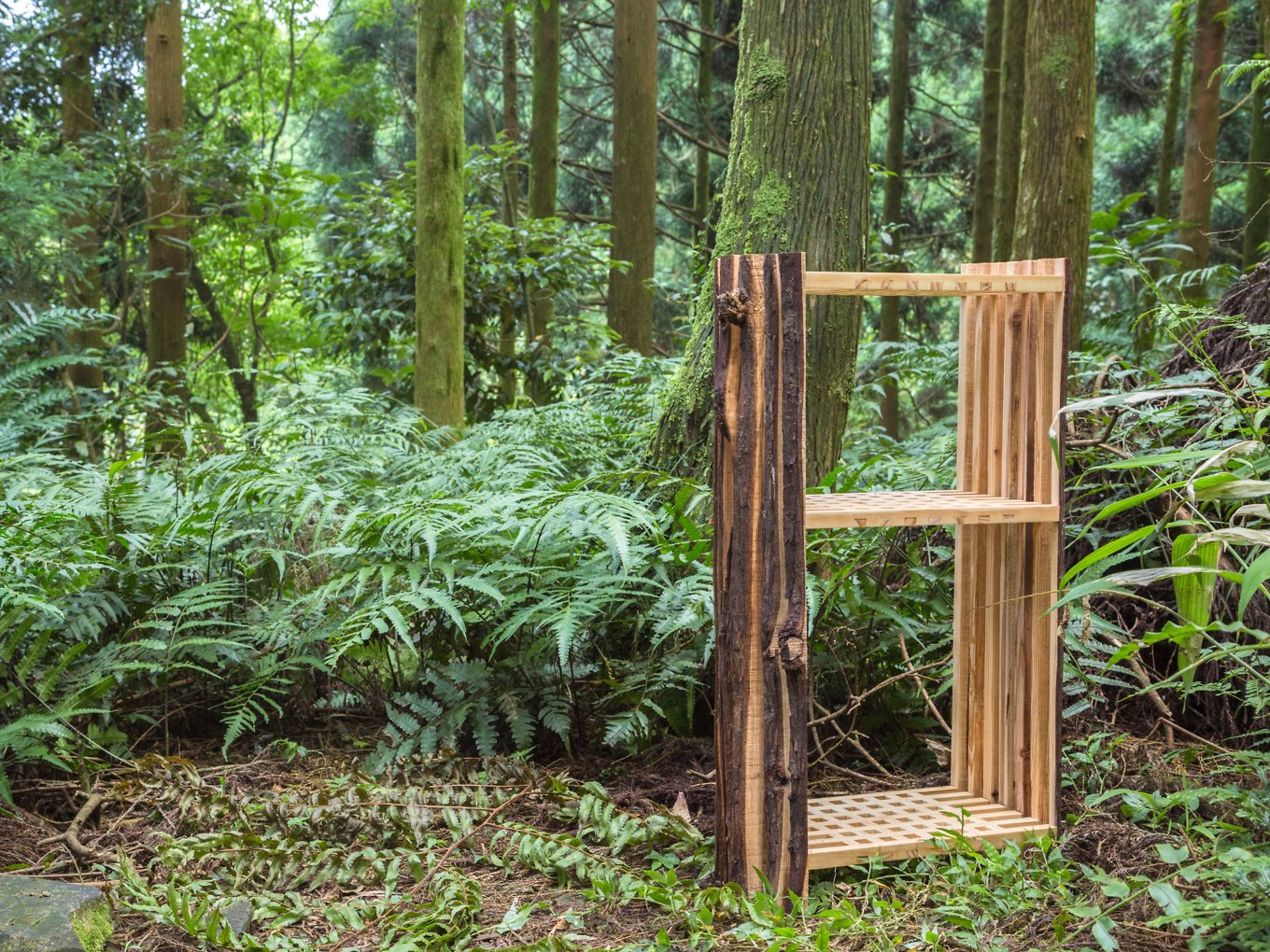 Using hand-picked bark and sapwood, Chang put together the objects in a puzzle-like fashion, assembling the long slabs in an arc or in a reinforced grid structure to create the desired effect. From a certain angle, the shelf looks like a tree, while from the side, the stool reveals the shape and organic lines of a trunk’s cross section. Thought-provoking and elegant at the same time, Second Nature explores the potential of waste as building material. But it also gives new life to the discarded pieces of wood by referencing the purity and beauty of the source material through the use of its divided sections. Carefully assembled, they become new objects with a new purpose. Photography by Tzu-Chiao Chiu.