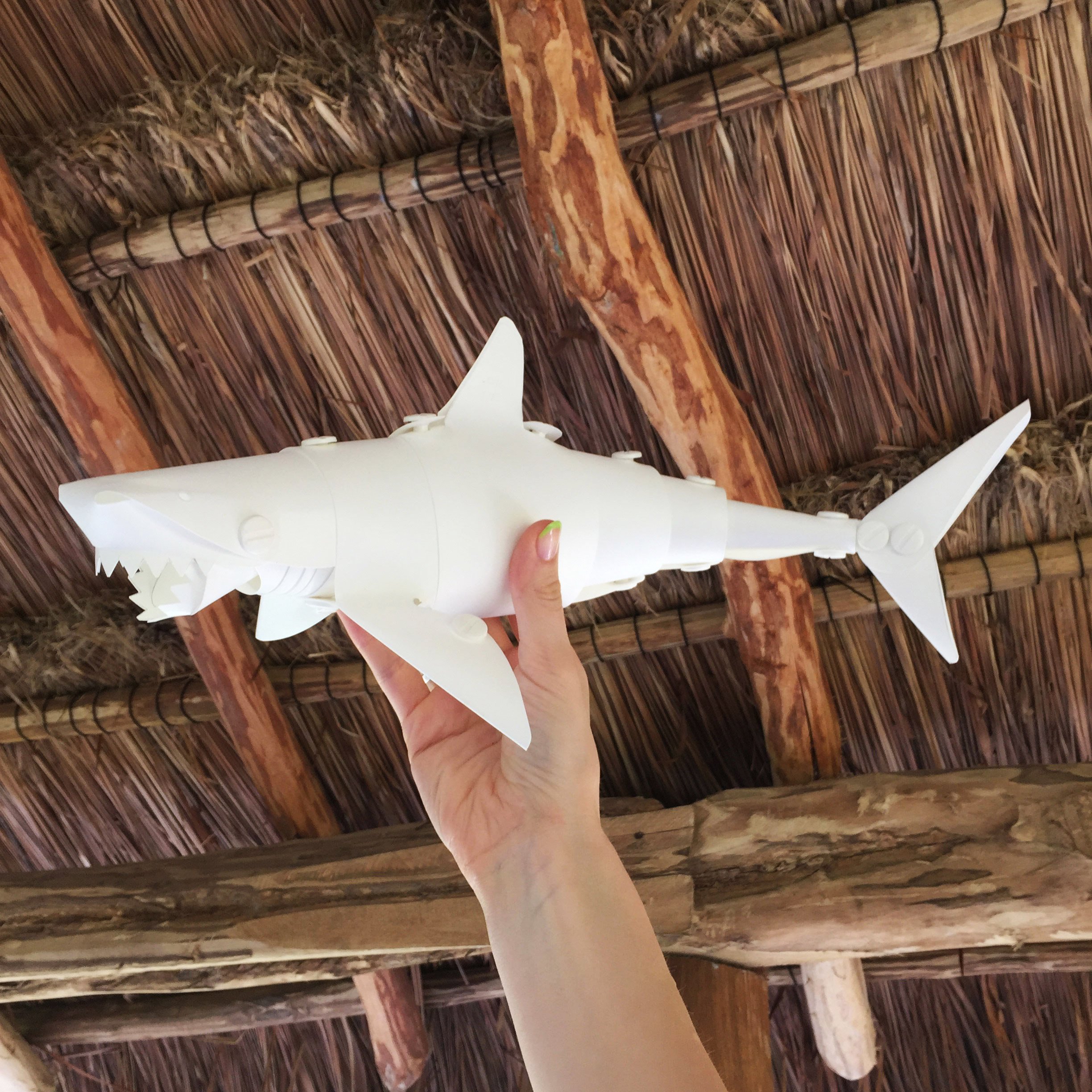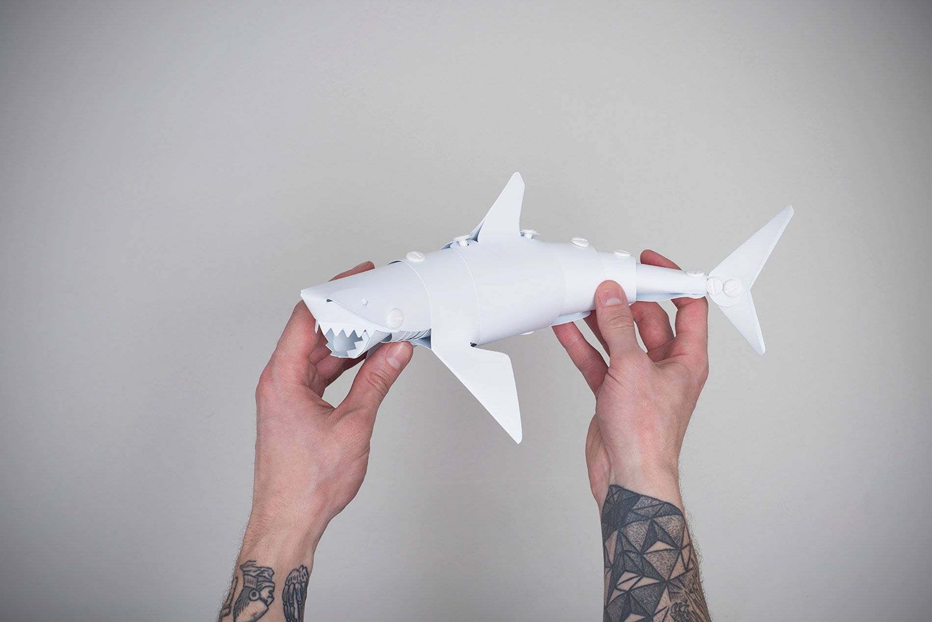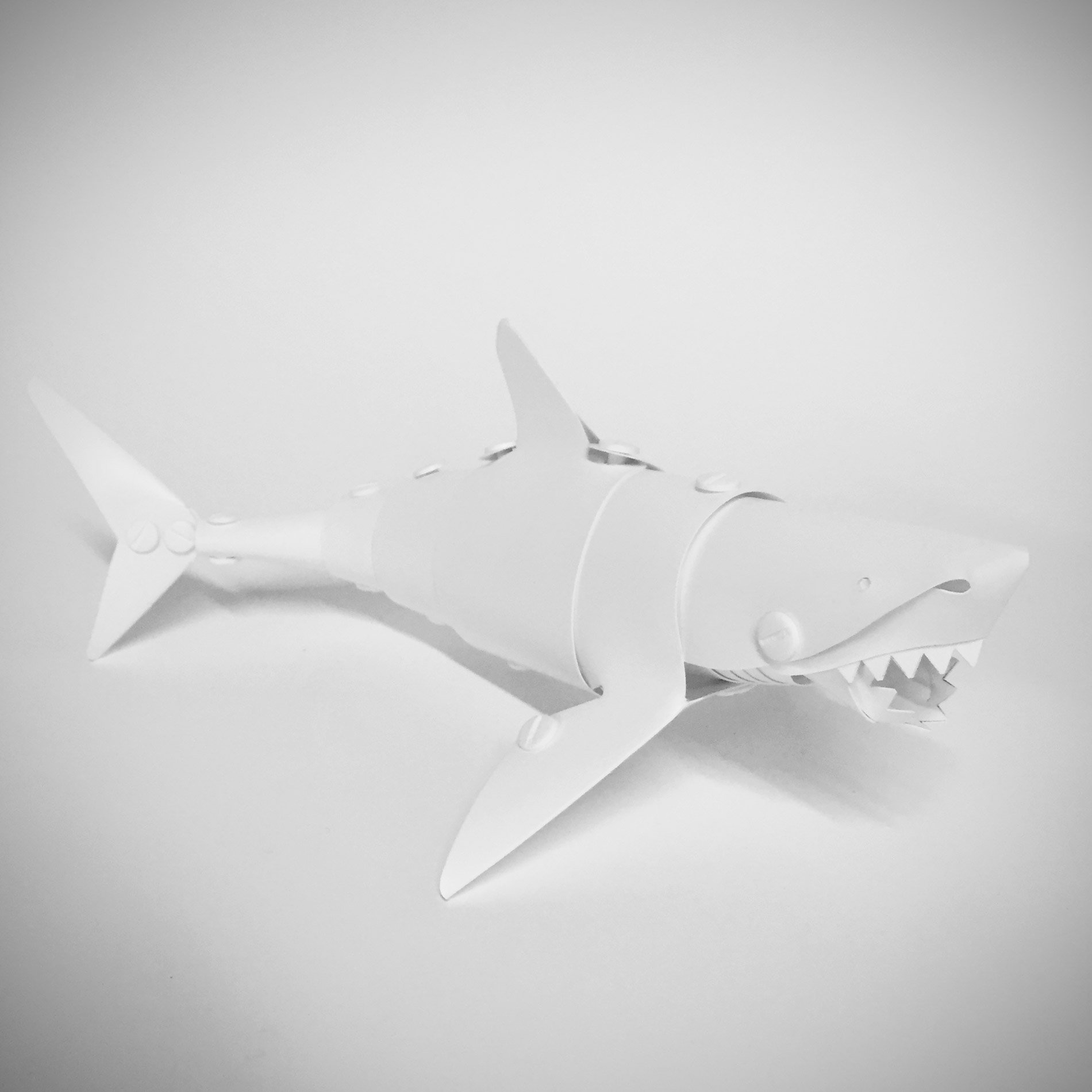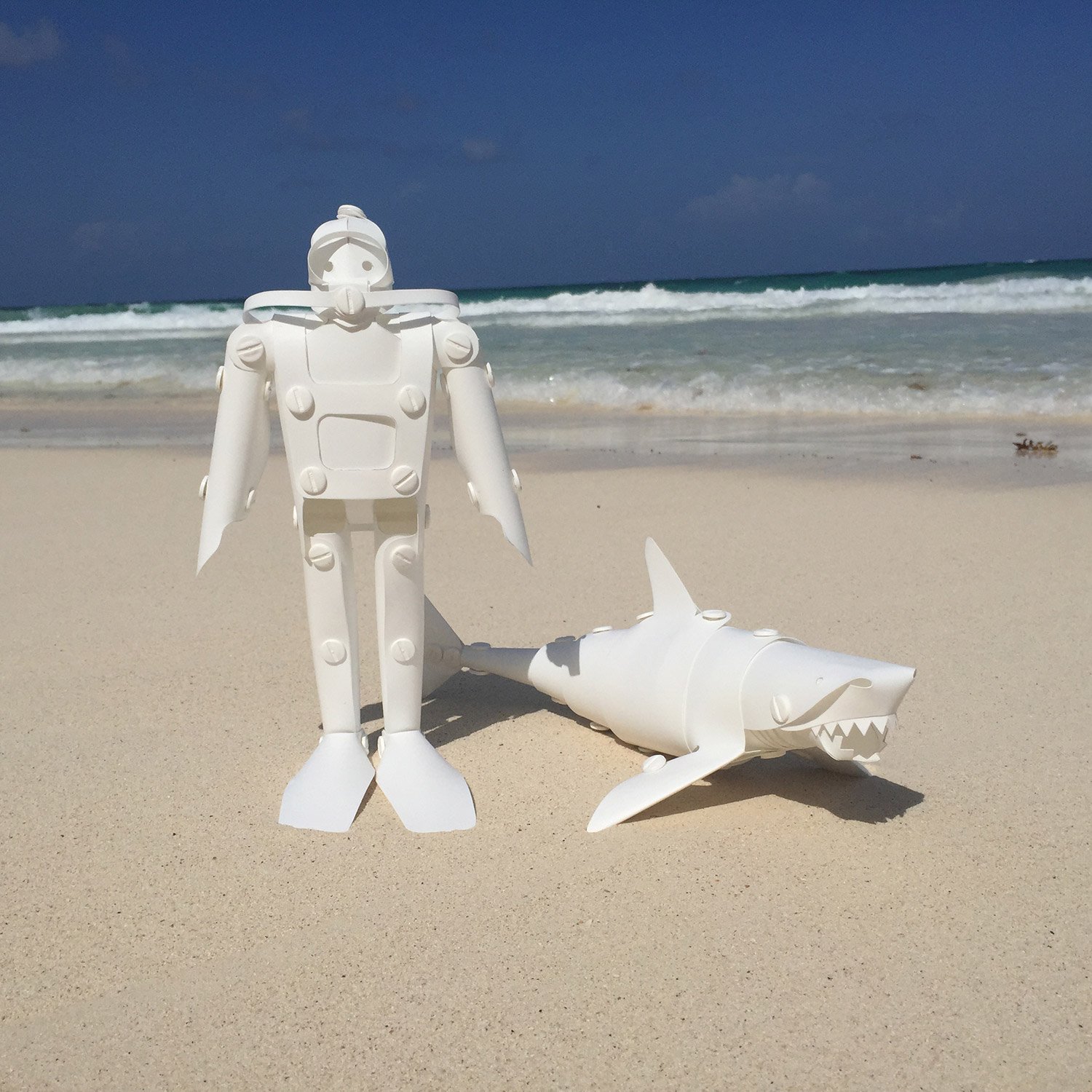 When we talk about design, we often ask what purpose the object is serving or is meant to serve, and look to this as the sole driver of the creative process. But every real designer knows that the fastest way to discover new and innovative products, no matter the field, isn’t to brainstorm around a specific problem but to constantly experiment in an unstructured, unraveling way. Some may call this fidgeting, doodling, screwing around or even killing time, but the most accurate descriptor is a term many of us are (wrongly) conditioned to grow out of after early education; the notion of play. This notion not only led Brooklyn designer Matt Cavanaugh to create two fascinating and whimsical puppet-like objects, it also is embedded deeply into how you interact with his creations, elevating them far above being mere novelties. The Shark and Scuba Diver kits Cavanaugh has designed in are difficult to describe because they transcend conventional product typologies. On one hand the two pieces are lovely minimalistic toys, made of flexible vinyl and incredibly articulable for children to play with (complete with razor-toothed jaw and flipping flippers). On the other hand though they offer an important lesson in creative thinking, as the user assembles each one from flat sheets and binding posts in a way that retraces the steps Cavanaugh took to create them. The way the planes of each object gracefully define an image of a shark and scuba diver respectively recall the joy of origami, and ask the all important question of exactly at what point does the paper become a figure? When does the vinyl transform into a shark? The answer is whenever you open your imagination up to it, and the products joyfully show the kind of deft moves one can make when they aren’t afraid to tinker risk and inevitably fail, only to try again in the pursuit of a great idea. Playing with ideas lets a designer or artist tweak and try out things that a strict prompt or assignment may inhibit, and throughout history has been the catalyst for some of our most brilliant designs, from penicillin to the slinky. Cavanaugh’s Shark and Scuba Diver evoke an unseen world of play often lost on “serious” adults, and offers them a beautiful path back into it, for all ages to follow.