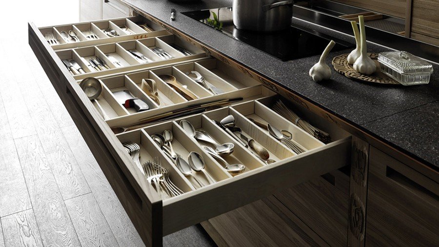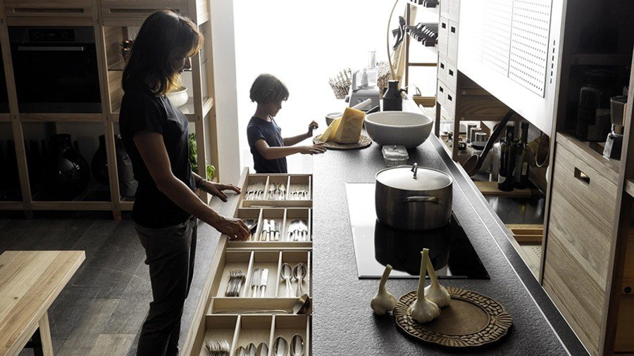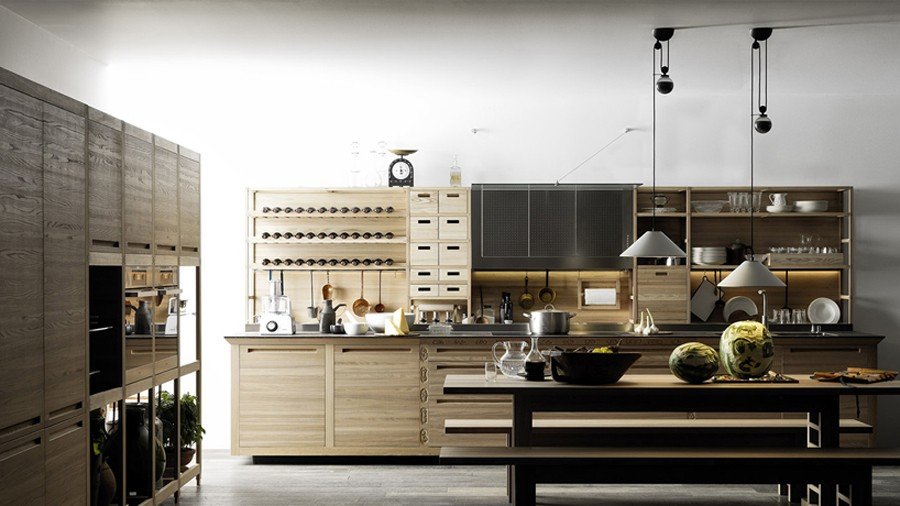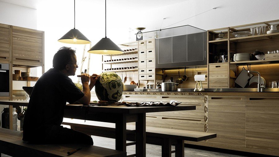 The kitchen is the heart of a home, and it is no wonder that designer Gabriele Centazzo chose to return to a caring, hand-crafted, traditional look for “Sinetempore.” Electing Valcucine’s emphasis on customization and handicraft workmanship as his anthem, Centazzo turns to detail in order to draw out a physical hominess and comfort that every kitchen possess by nature. Age-old techniques such as carvings, mosaics, and pyrography (burning parts of wood to create patterns, images, and different coloration) breathe life into the elm that composes the kitchen shelves, doors, and storage units. The smooth, shiny surfaces of a copper cooker and steel range hood reflect the intricately textured wood, which is also contrasted by the smooth porcelain kitchenware. Drawers with custom divisions keep and separate cutlery and cooking utensils, and the storage space hides the clutter from the kitchen counter so that attention is given to the beautiful wood inlays. The ambience is set; all that is missing is the food, the conversation, and the company.