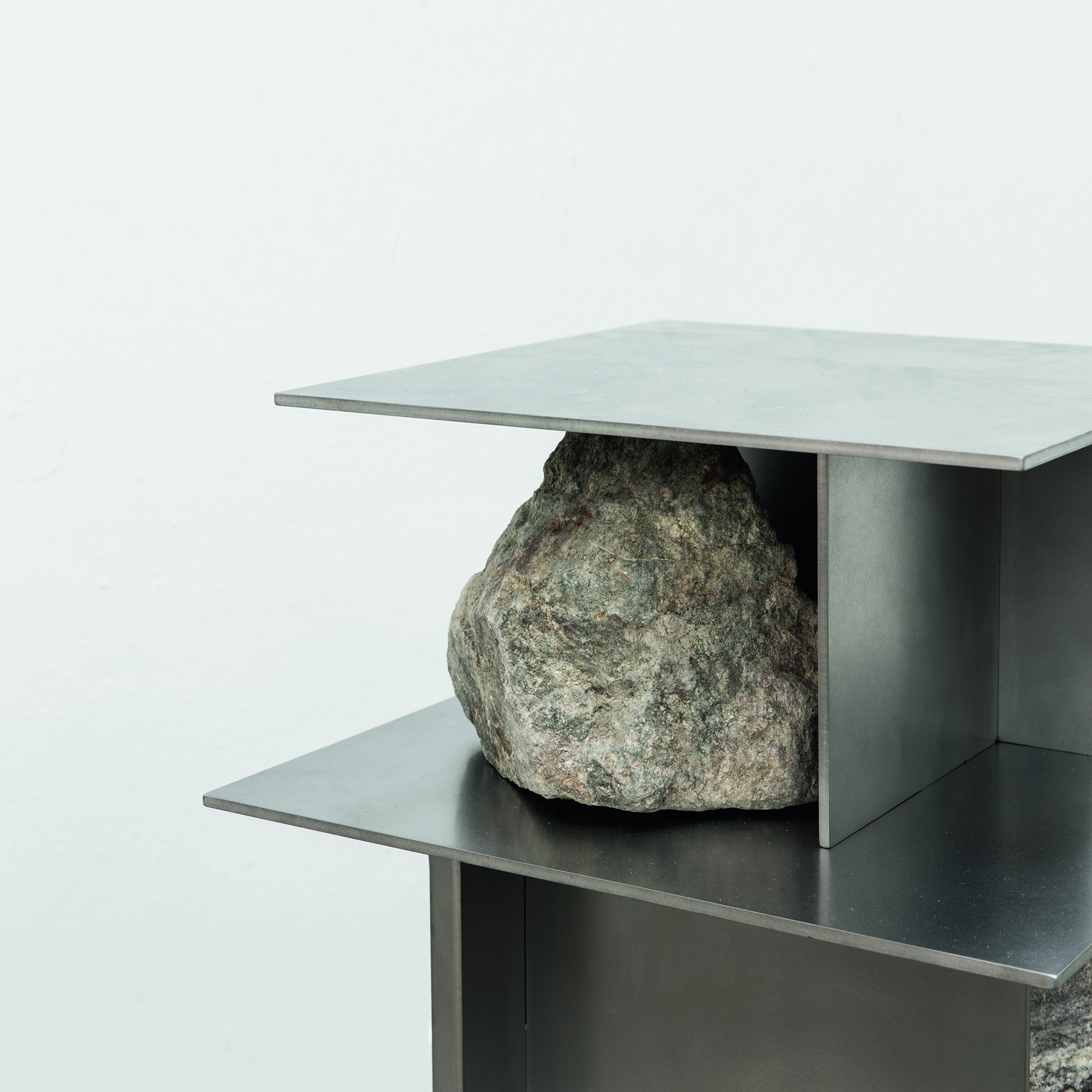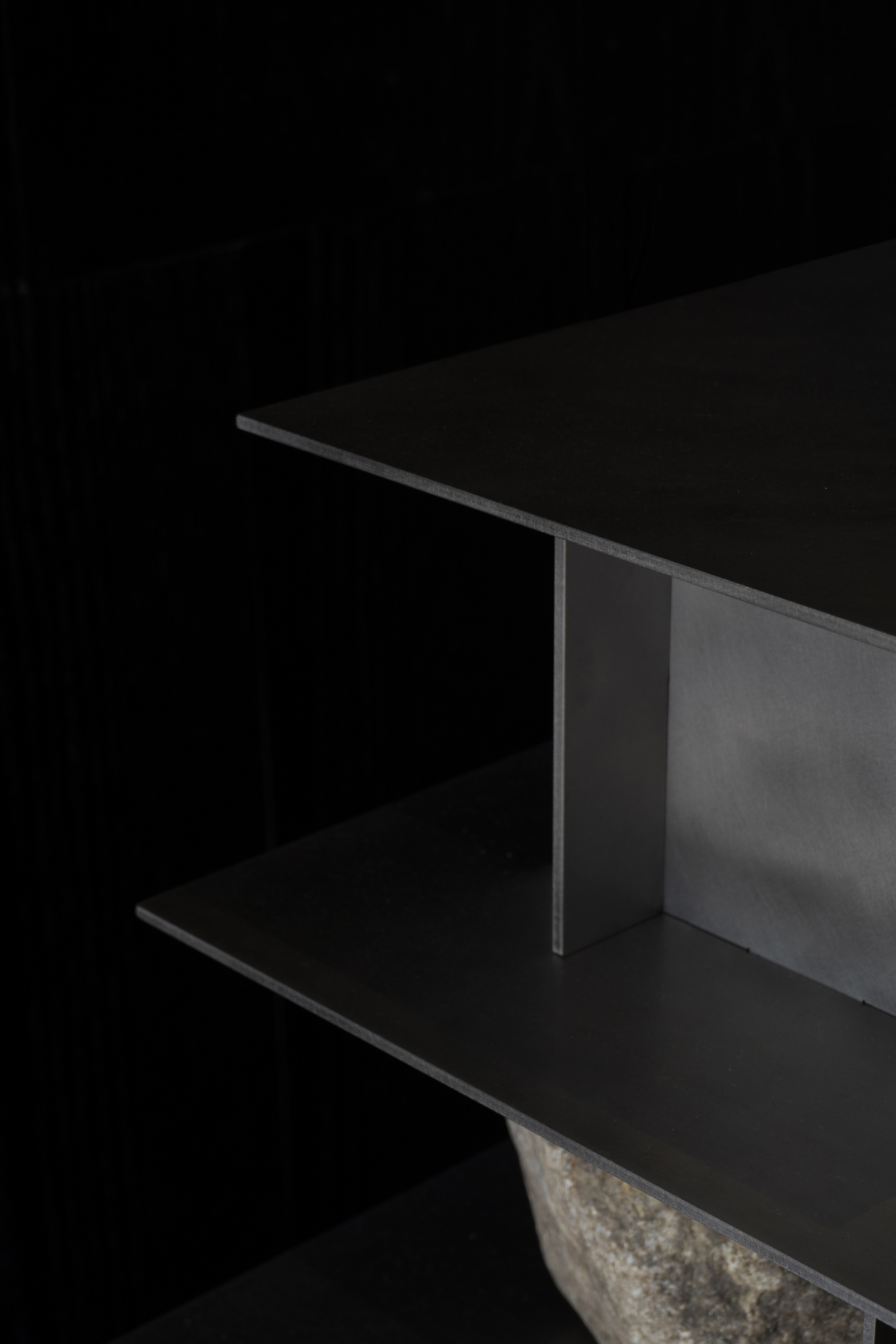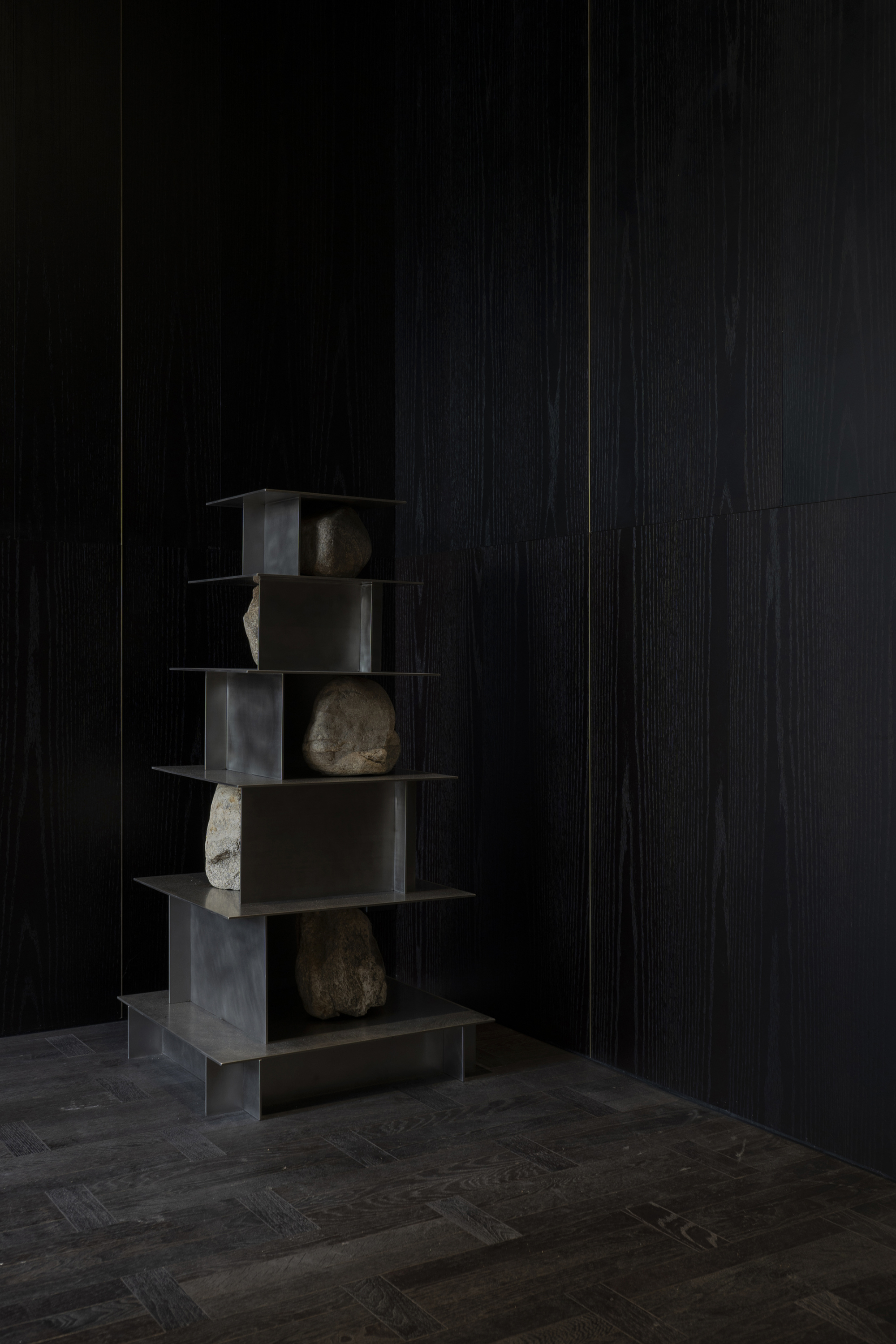To make the Proportions of Stone series of functional furniture pieces that double as artworks, the artist and designer uses found rocks. He then creates the steel elements to match the shape and size of each boulder. The components stand in a stark contrast but also create a perfect balance in a nod to the artist’s exploration of the relationship between nature and artifact. This collection comprises chairs and tables as well as shelving. In these practical sculptures, the stones and the steel play a dual role: aesthetic and structural.