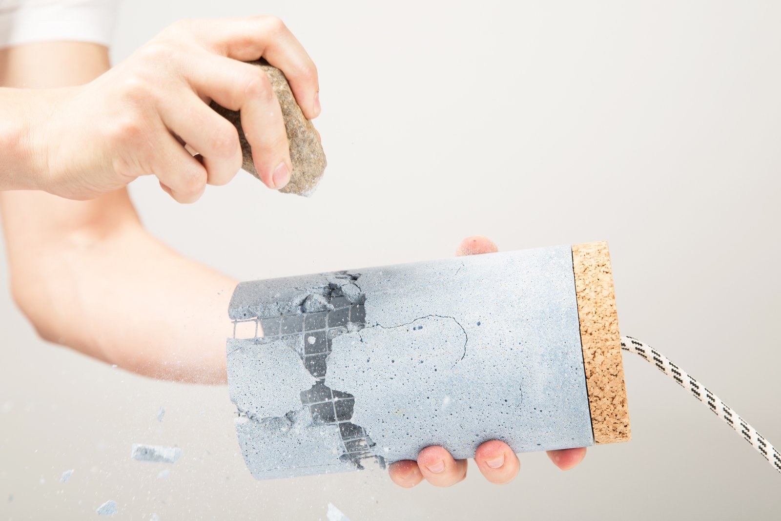 The name of Dragos Motica’s Slash Lamp, designed for Ubikubi, alludes to its confrontation of dualities: new or destroyed; beautiful or ugly; valuable or worthless. The hanging, cylindrical lamp is constructed of concrete and reinforcing wire, and the user has the choice of leaving the object as it was manufactured – smooth and solid, with an LED light that streams out from the bottom – or breaking it with a rock, exposing the grid of wire beneath and allowing light to pour through jagged, unique remnants of concrete. The intent of the object is to provoke and empower the user, allowing him or her to make a decision and examine yet another set of opposites: action or inaction.