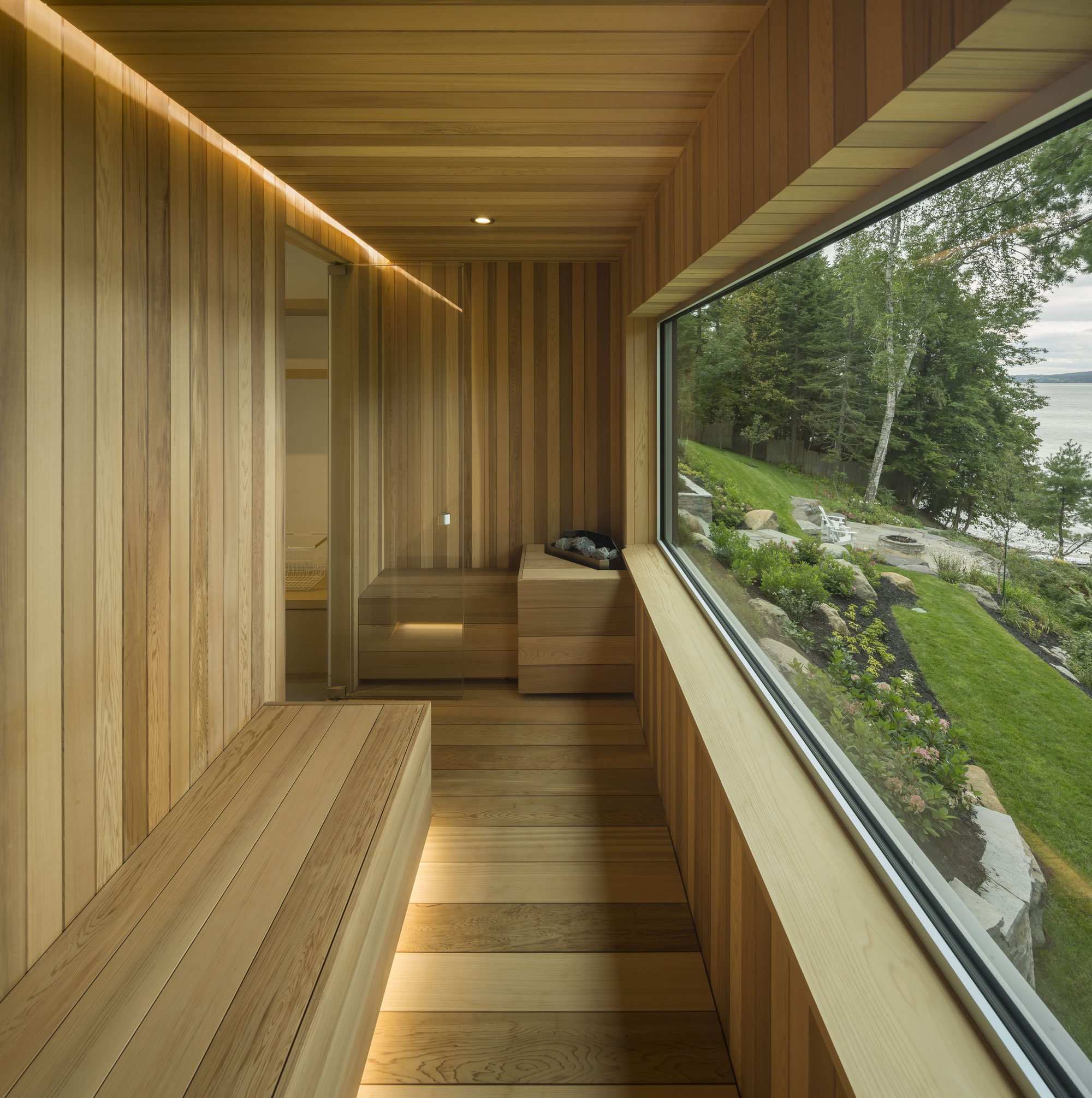 Positioned in a linear layout, the rooms include a master suite as well as two high-end suites and a small lounge. The sauna and training room feature spectacular glazed walls that invite nature inside. Of course, the main socializing space benefits from the best views. Opening towards the lake, the windows create a serene atmosphere. Throughout the modern lake house, the studio used premium materials. These include white oak and glass as well as marble and natural stone. Outside, cascading gardens seem to flow into the lake. Completed with the same black wooden cladding as The Slender House, a boathouse expands upon the main living space with a kitchenette and a roof terrace that offers the perfect place to admire the sunset over the waterline. Photographs© Stephane Groleau.