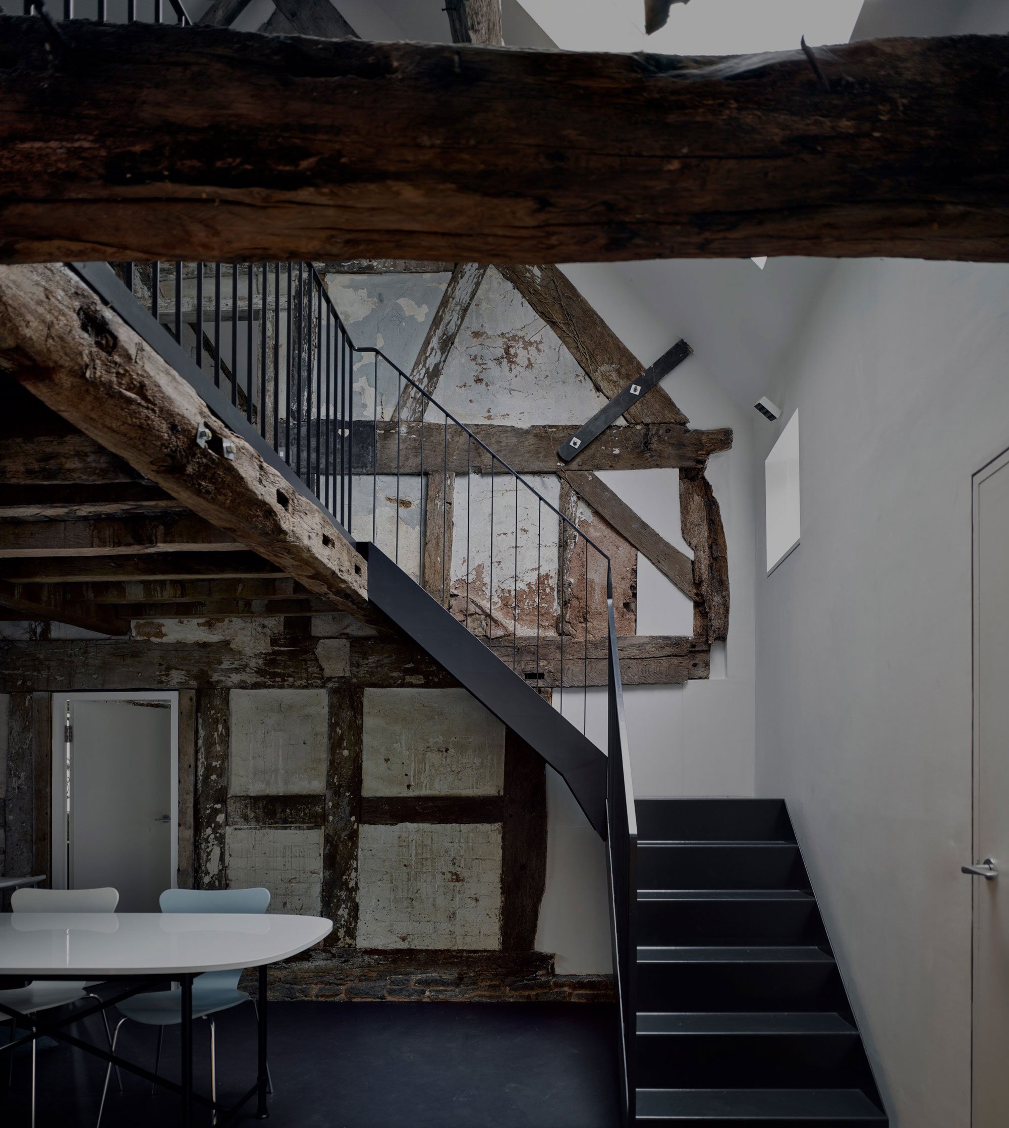 The perfectly preserved dwelling – ivy plants, cobwebs, old bird nests, and all – now sits inside a modern envelope. The exterior features black corrugated iron over a timber and steel structure. The ruins remain untouched in the interior, which now doubles as a house and studio for Darby and Connor. The complex project aims to maintain the past very much alive. “In most places there are two walls, two windows and two roofs, old and new,” explain the two creatives. The layout also allows for further adaptations in the future. For now, the ground floor houses a double height studio, kitchen, and living room, while the upper level contains the bedroom and bathroom.