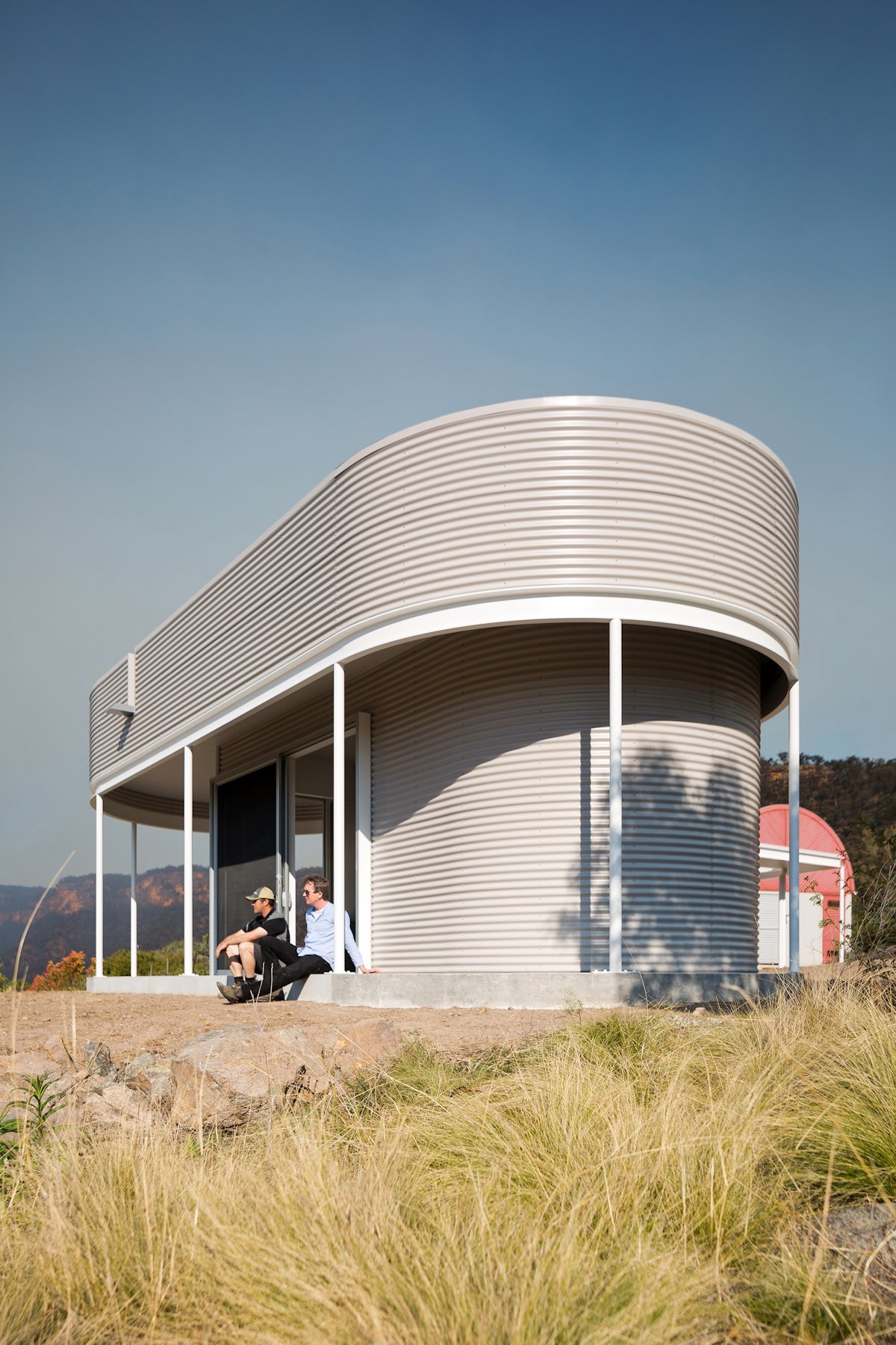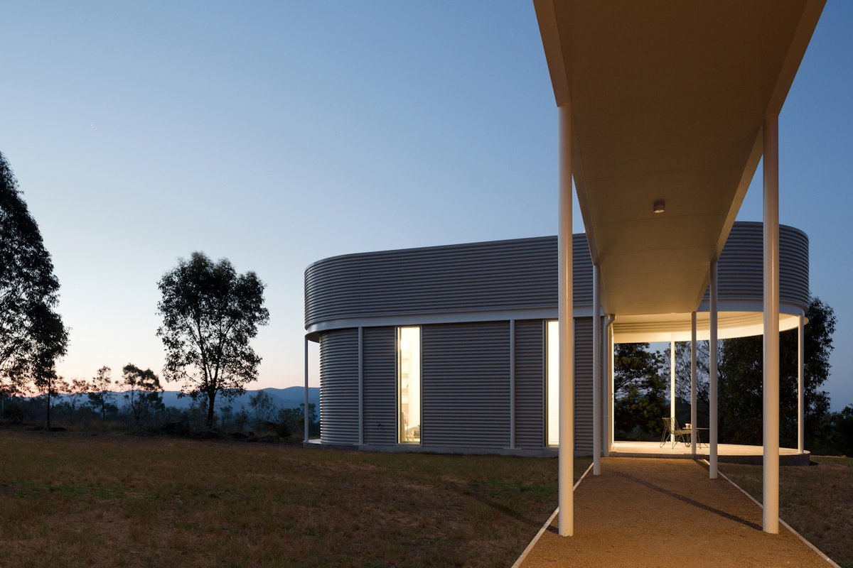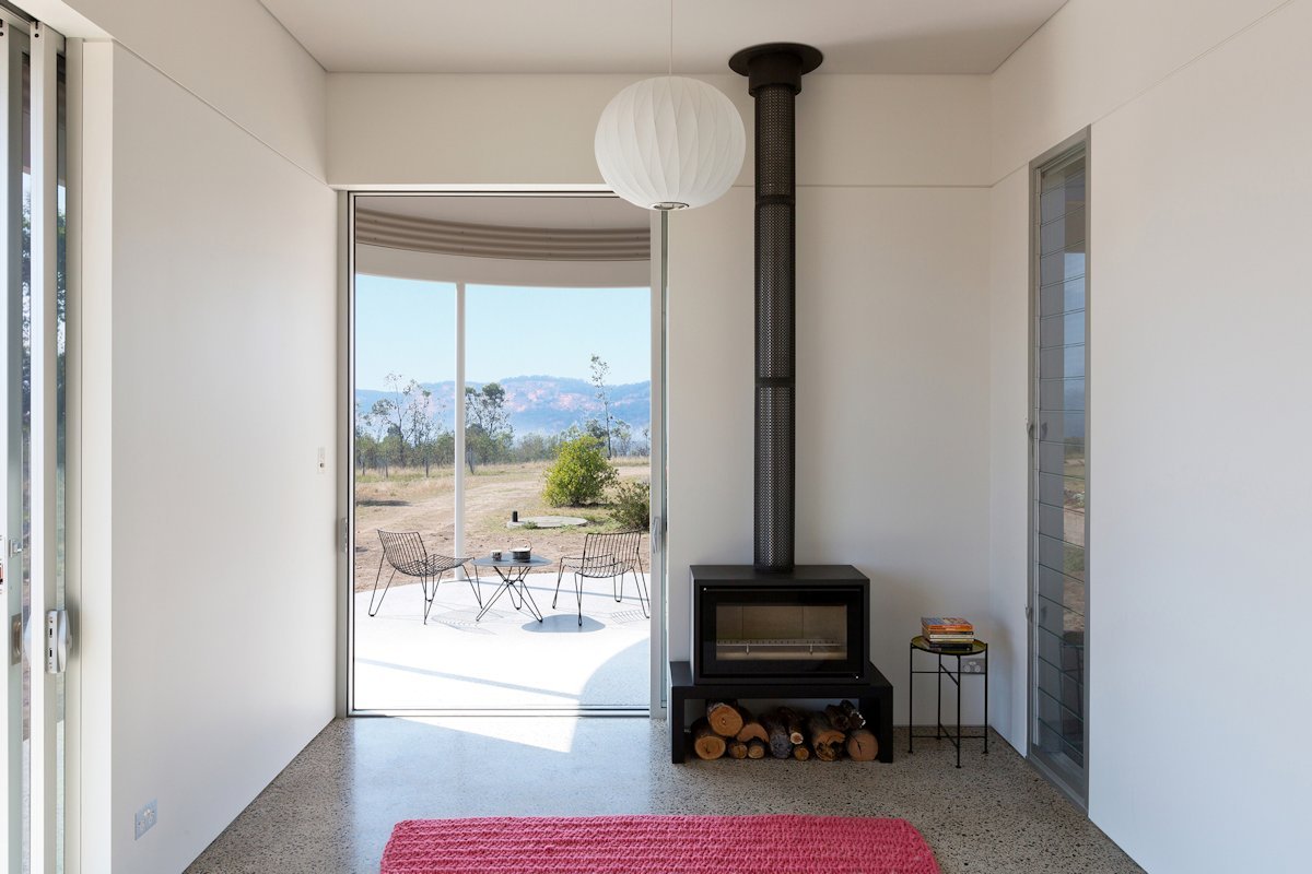 This home-office pavilion was designed in Sydney, Australia by Benn & Penna Architects. Built on the same plot as two existing buildings, the new construction echoes their ribbed cladding and ultra-modern curves and is connected to them by an industrial terrace. The small house has a white and light gray exterior that complements the nearby structures’ white and washed red. It also features a concrete porch with thin metal columns. Inside, the minimalist space suits work and relaxation, providing just enough room for a wood fire, built-in shelves, and seating.