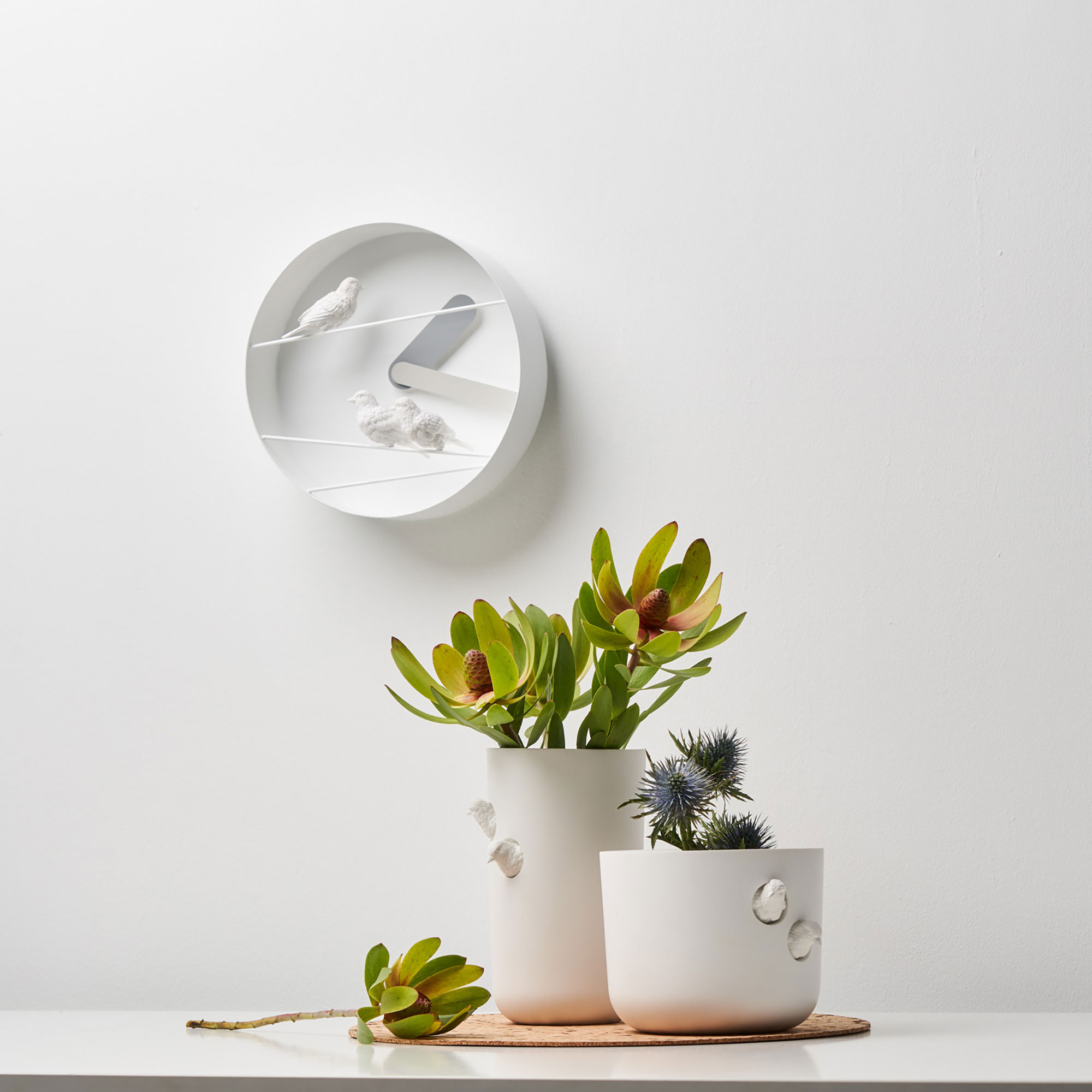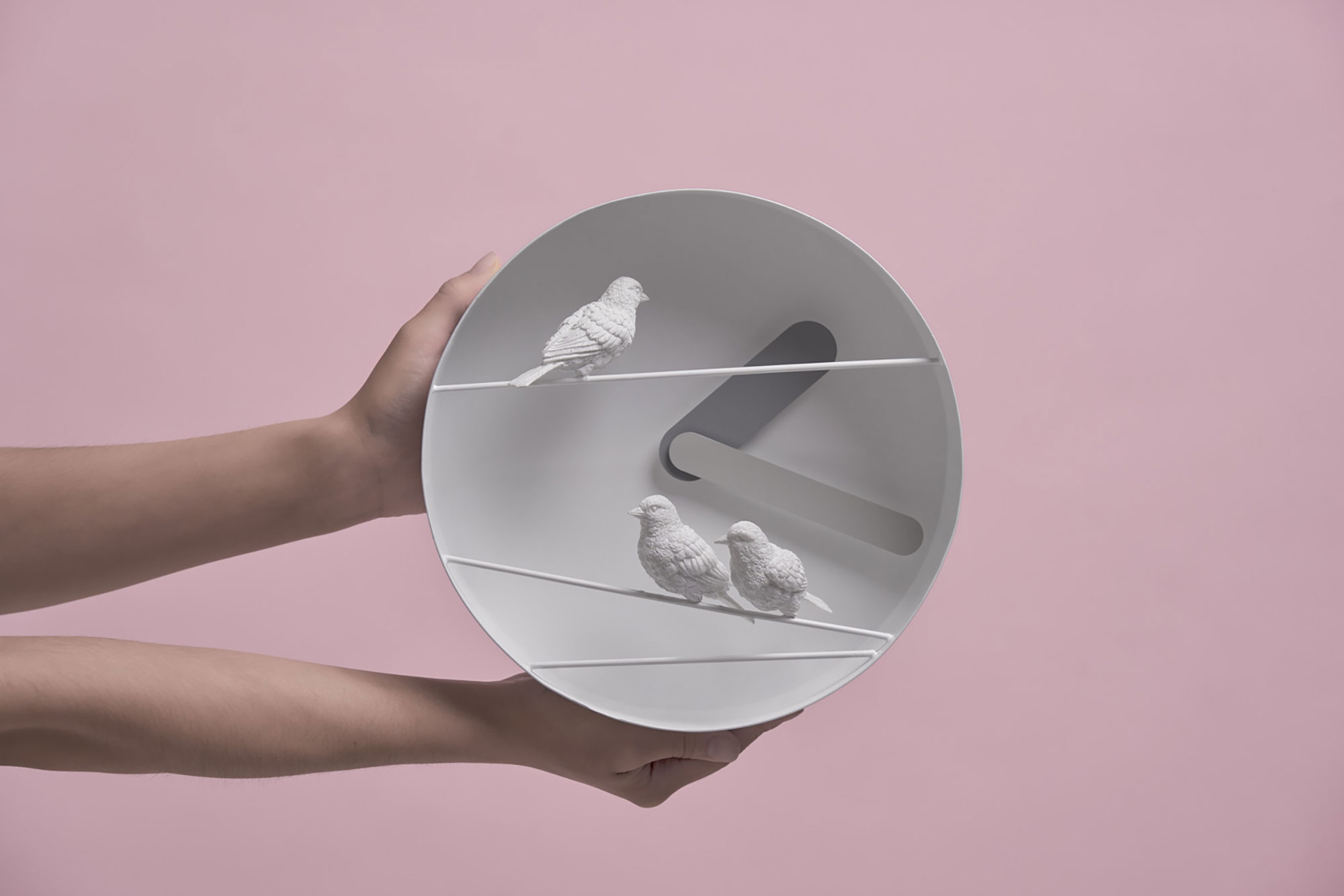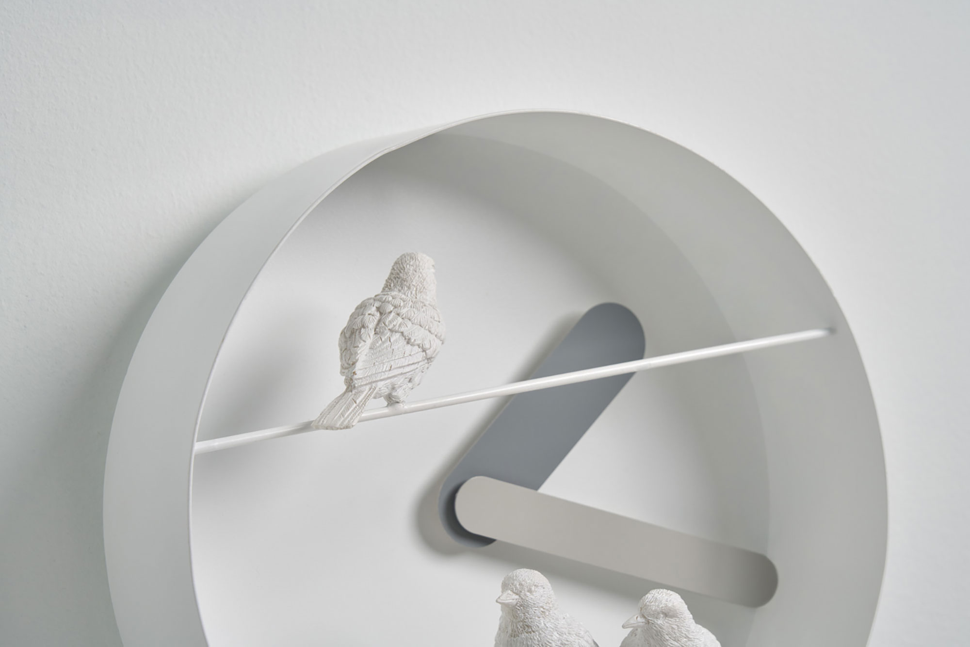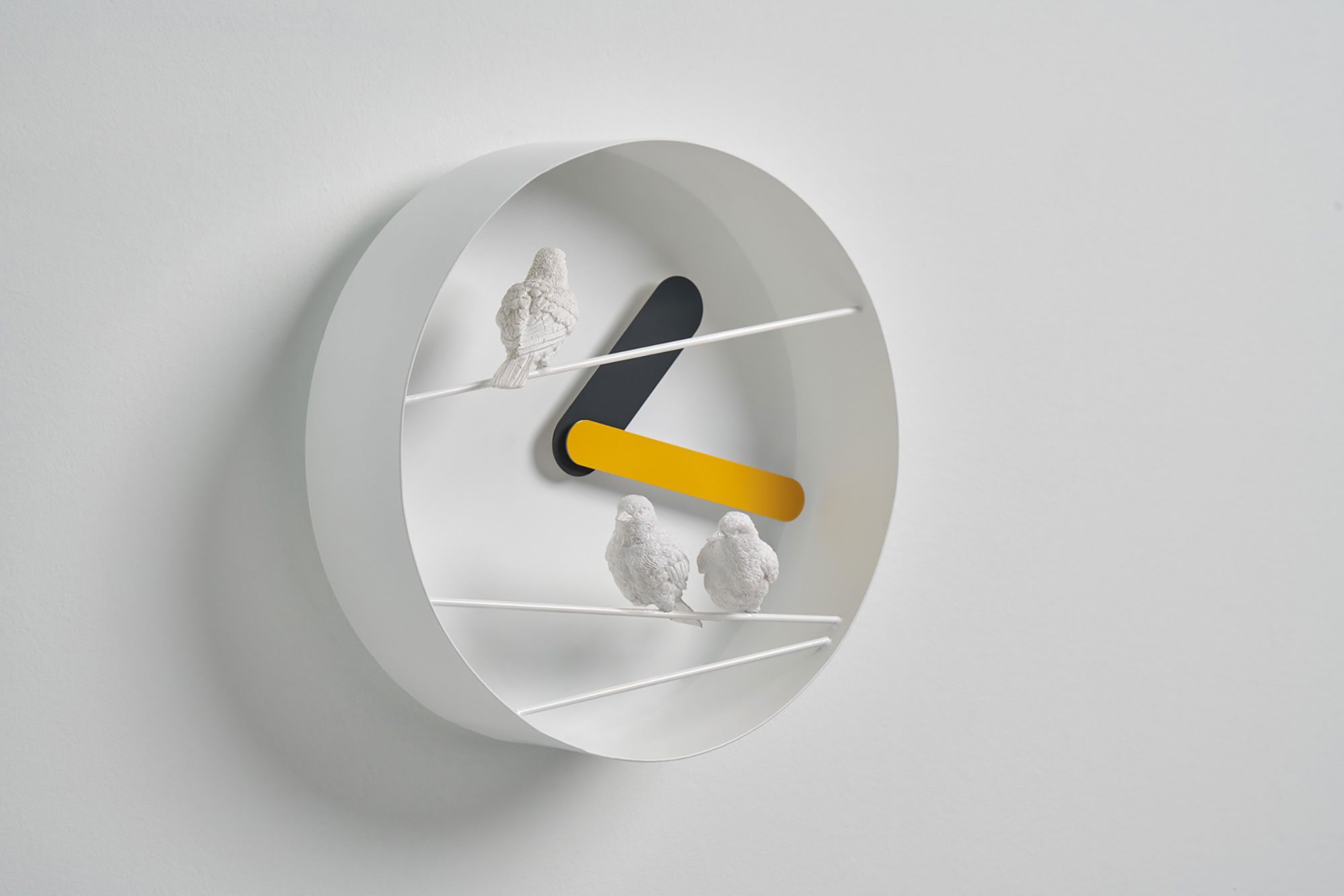 The Sparrow X Round Clock boasts a round case that houses three sparrows. Perched on slender bars, the sparrows have a realistic, detailed design. Looking at them up close, the viewer can admire the skillfully crafted birds and intricately hand carved feathers. Depending on the viewing angle, the sparrows appear slightly different as the light highlights certain details. On the dial, two wide hands in different shades of gray show the current time. The minimalist dial has no markers, numbers, or letters. Handmade, the Sparrow X Round Clock features a resin and iron build with both white and light gray paint finish. It’s a sculptural timepiece that doubles as wall décor while also putting the passage of time in a serene, maybe even more relaxed light. Photographs©: Haoshi.