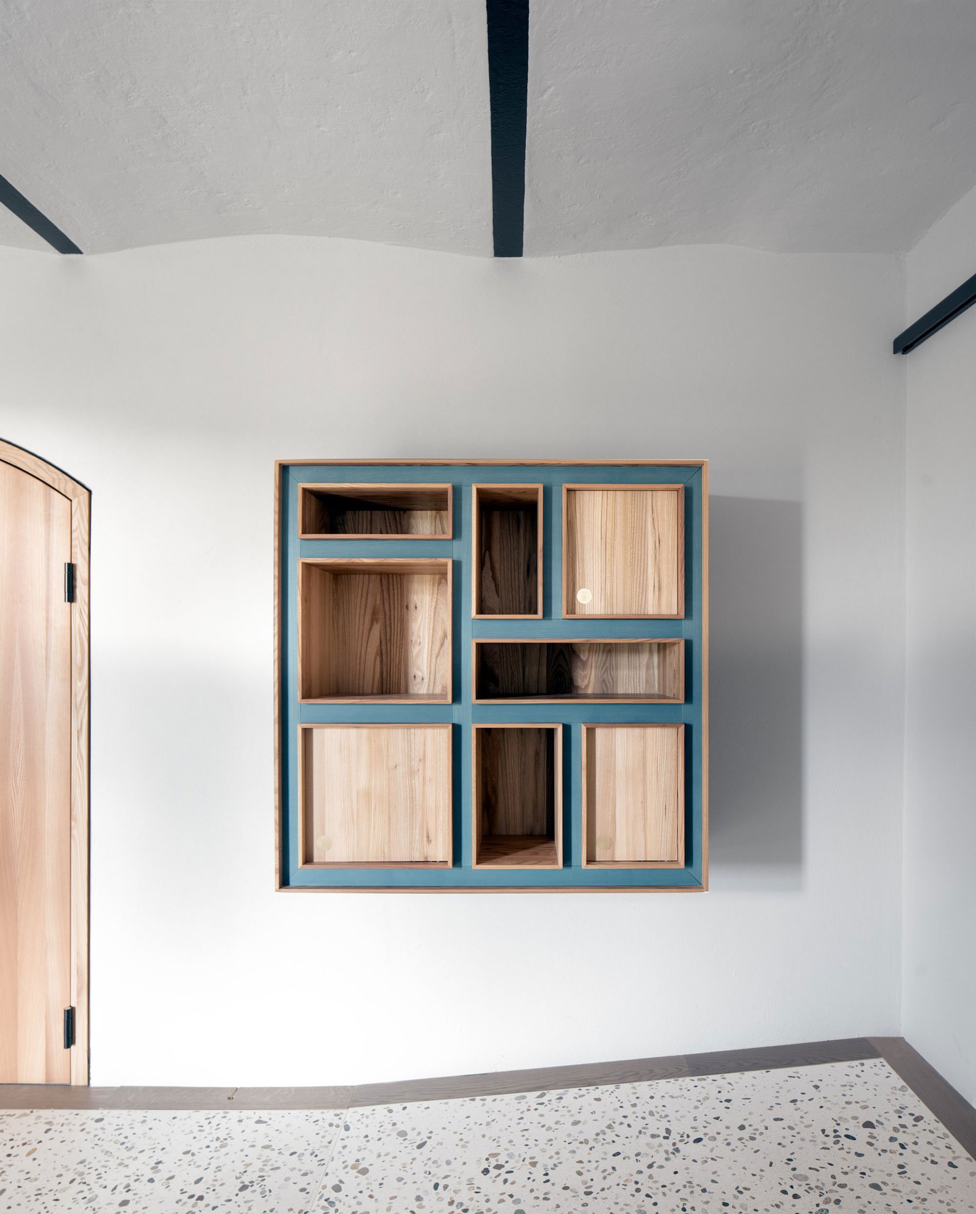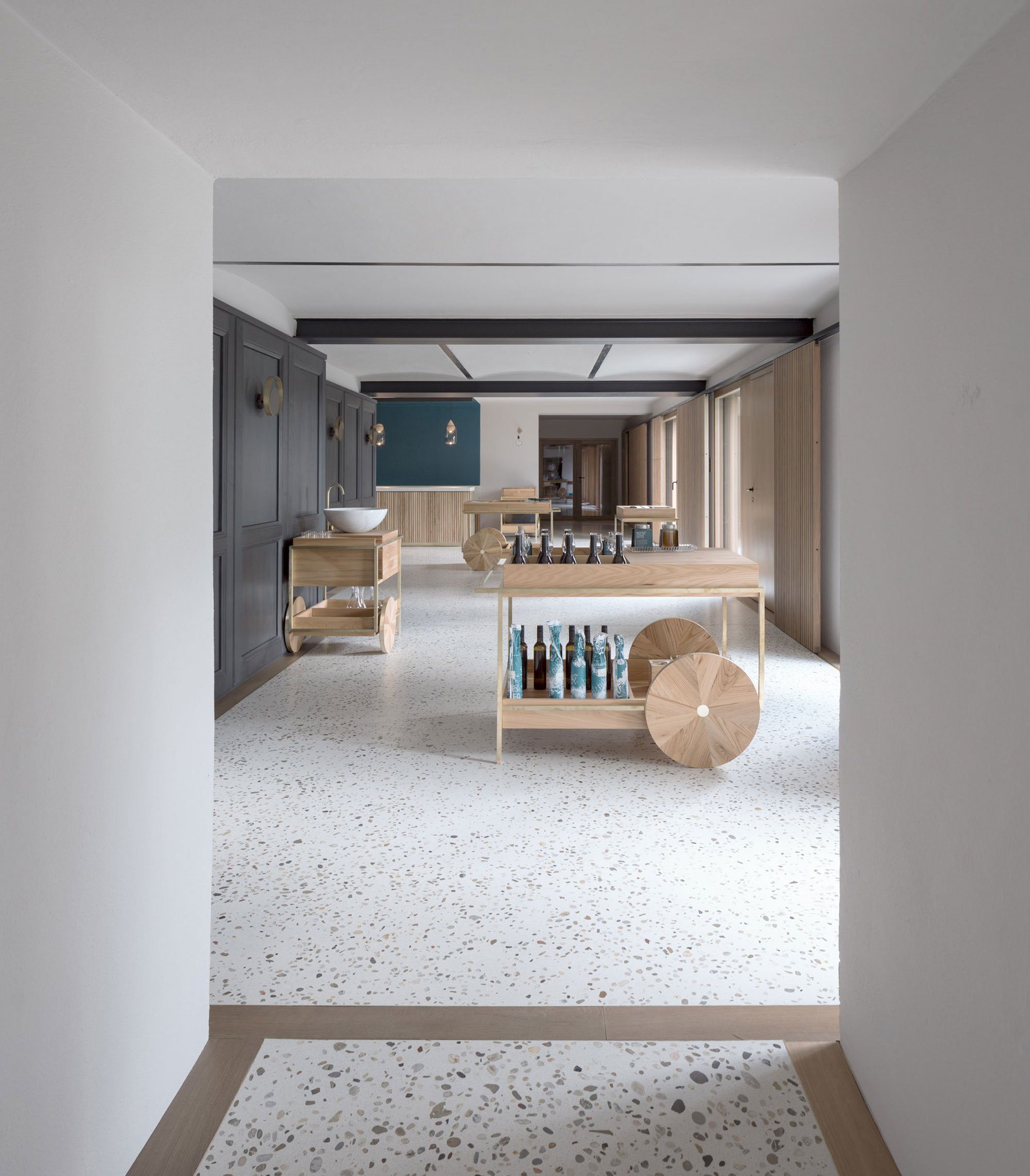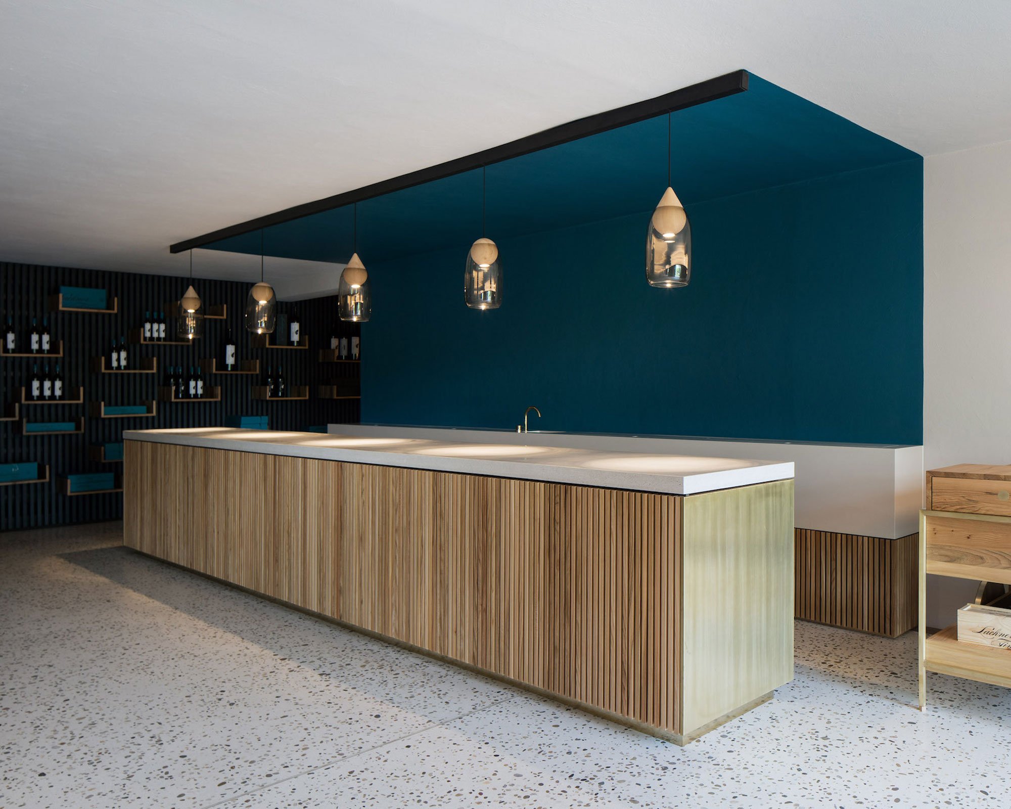 At the long wine counter, pendant lighting puts the glasses of wine in the best light, while a petrol-colored wall paint reaches the ceiling to create a sheltered space for tasters. U-shaped shelves with bottles and wine cartons extend on the wall to reach the next room. Here, the bottle storage area has a captivating atmosphere thanks to the soft lighting coming from the ceiling lamps which hang at different heights. A light gray terrazzo floor stretches throughout the renovated level, linking the rooms visually, along with the dark blue and sage-green colors. Solid walnut and elm furniture pay homage to local craftsmanship, while brass accents and white walls brighten the space further. Photographs© Steinbach Keller Winery.