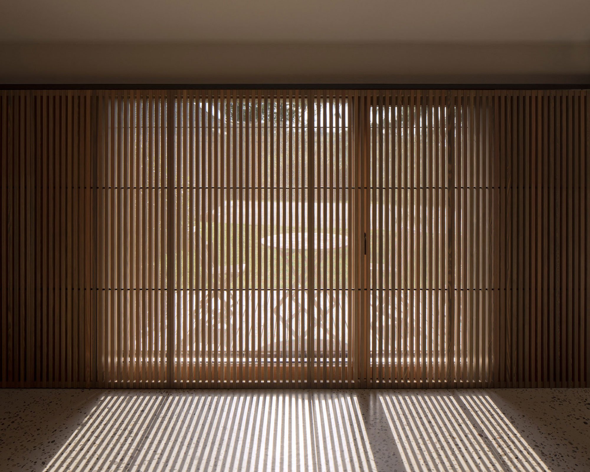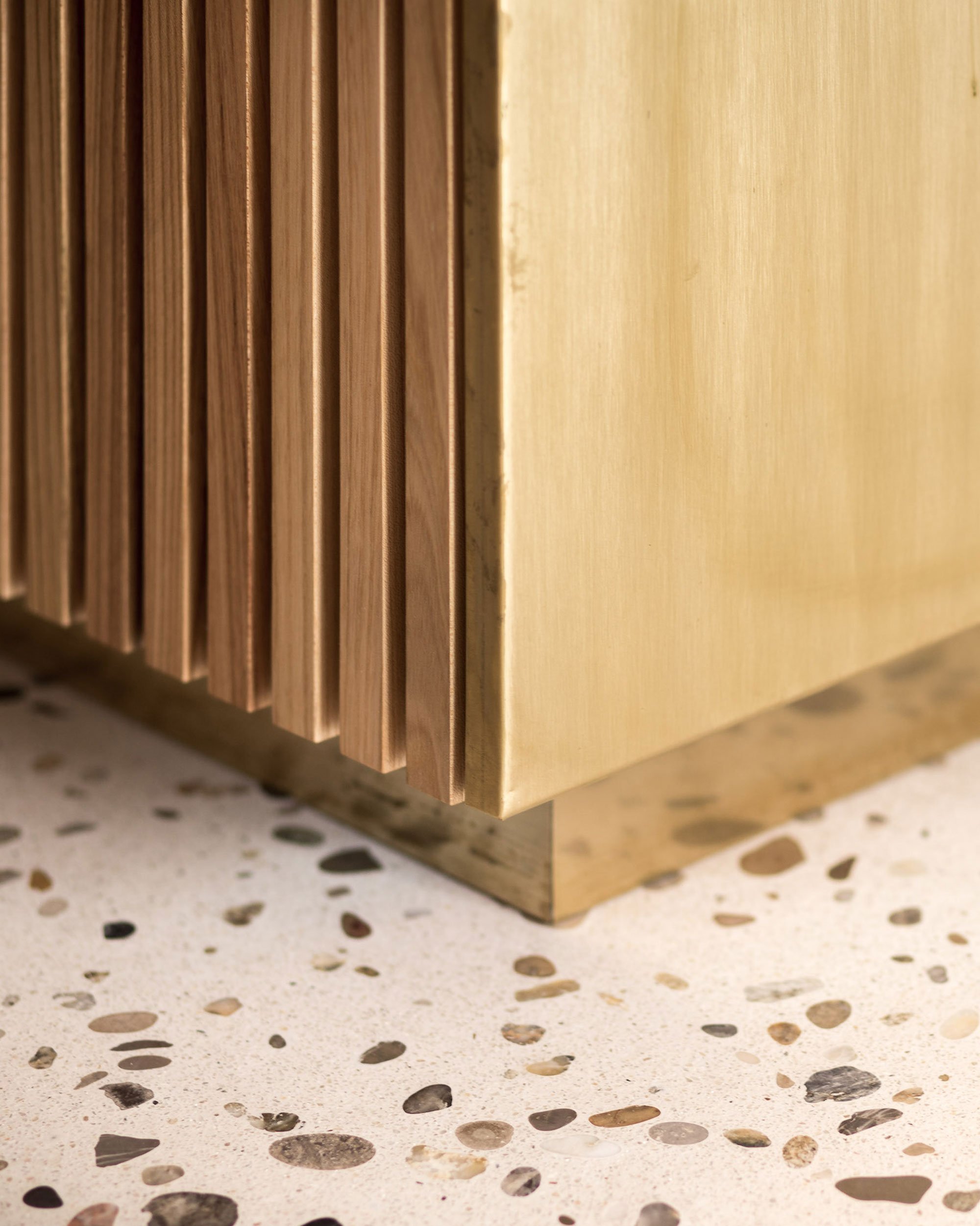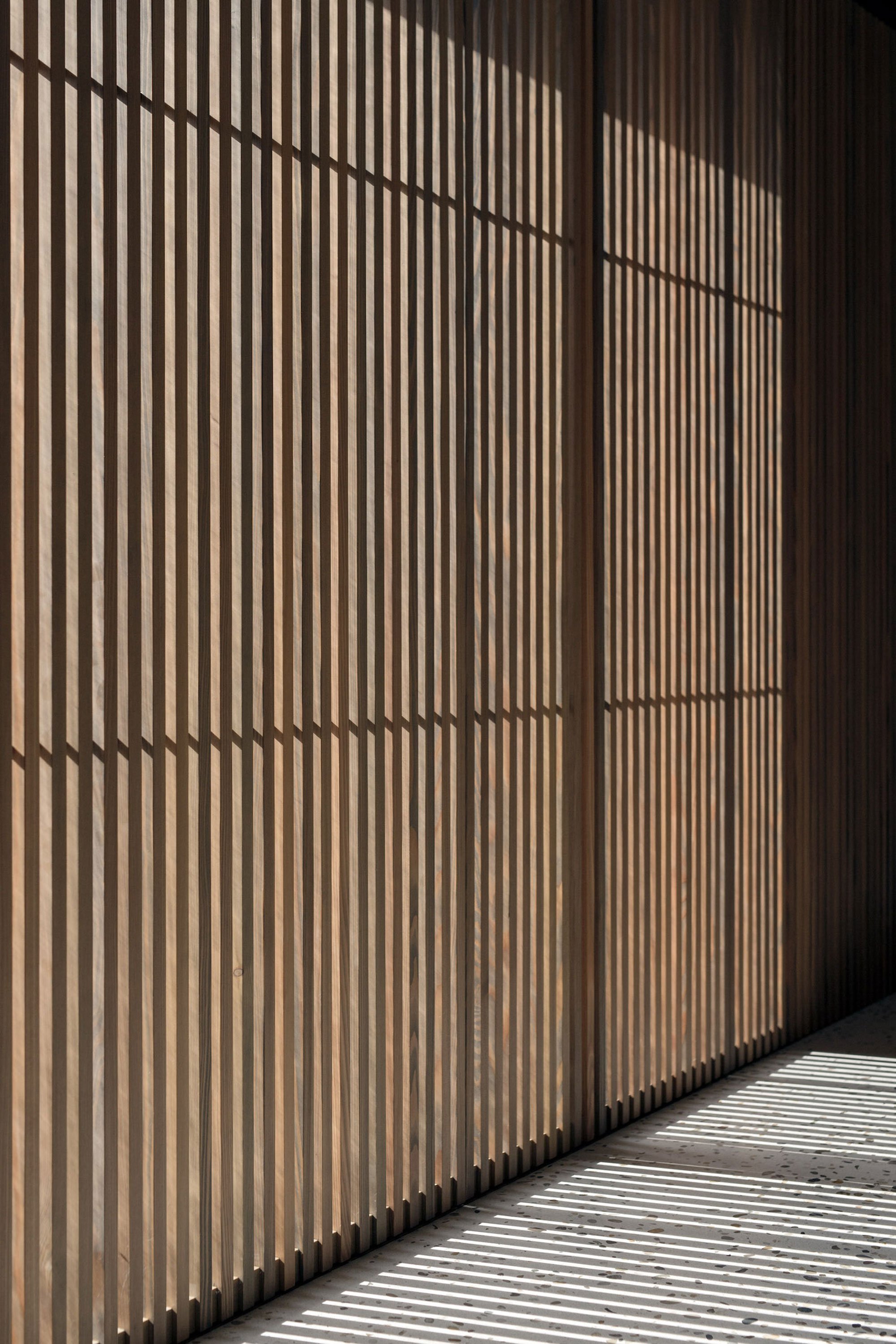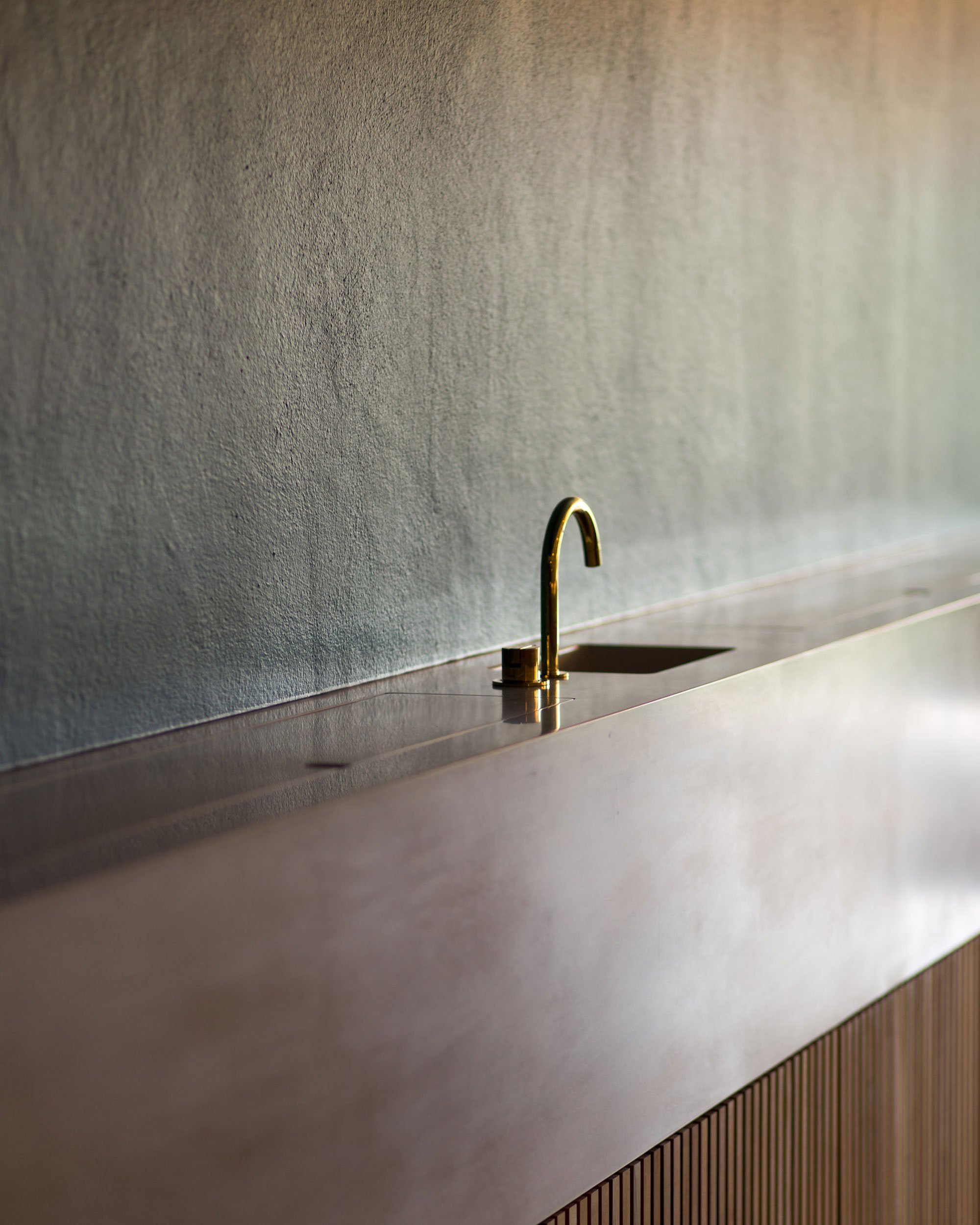 At the long wine counter, pendant lighting puts the glasses of wine in the best light, while a petrol-colored wall paint reaches the ceiling to create a sheltered space for tasters. U-shaped shelves with bottles and wine cartons extend on the wall to reach the next room. Here, the bottle storage area has a captivating atmosphere thanks to the soft lighting coming from the ceiling lamps which hang at different heights. A light gray terrazzo floor stretches throughout the renovated level, linking the rooms visually, along with the dark blue and sage-green colors. Solid walnut and elm furniture pay homage to local craftsmanship, while brass accents and white walls brighten the space further. Photographs© Steinbach Keller Winery.