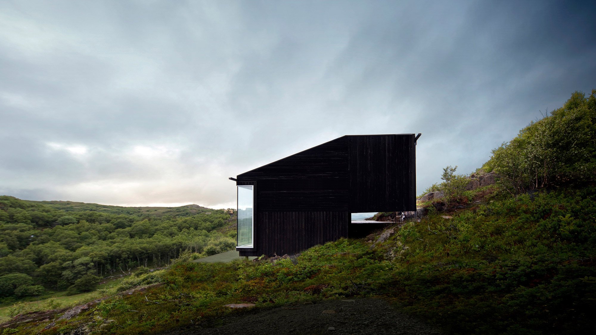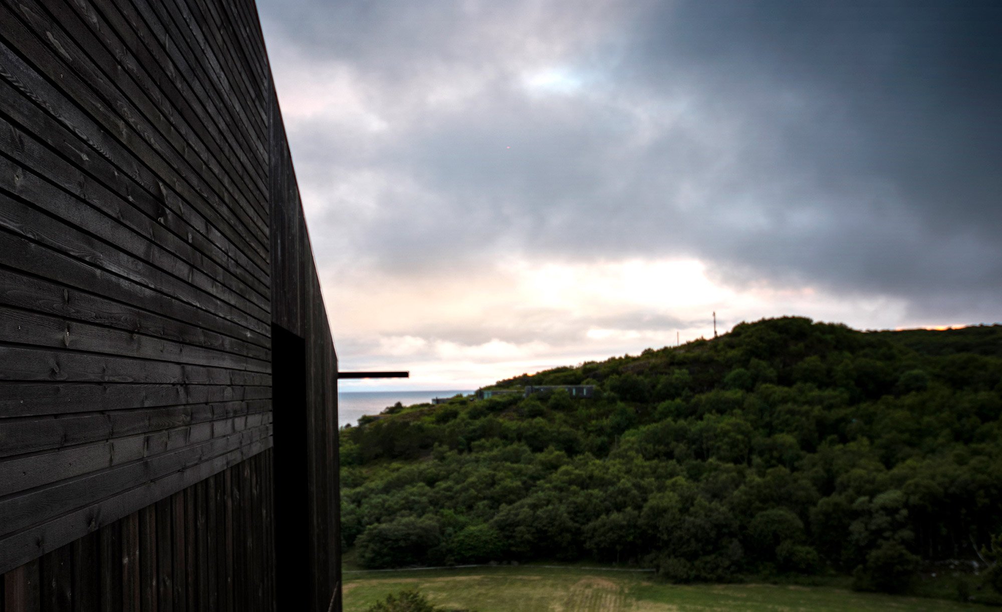 Located on the island of Stokkøya, Norway, this weekend and vacation retreat makes the most of the gorgeous natural views to offer a serene escape from city living. For Stokkøya Cabin, the Kappland Arkitekter firm designed a dwelling that becomes a part of the landscape. The house stands on a steep slope, nestled into a hillside that provides views of the Norwegian Sea. Both the black cladding and the minimalist design help to blend the cottage into its setting. Two outdoor areas overlook different parts of the site, providing a convenient solution to use the space more sheltered from the wind at any given time. While one patio opens to the sea, the other faces the hill and surrounding vegetation.