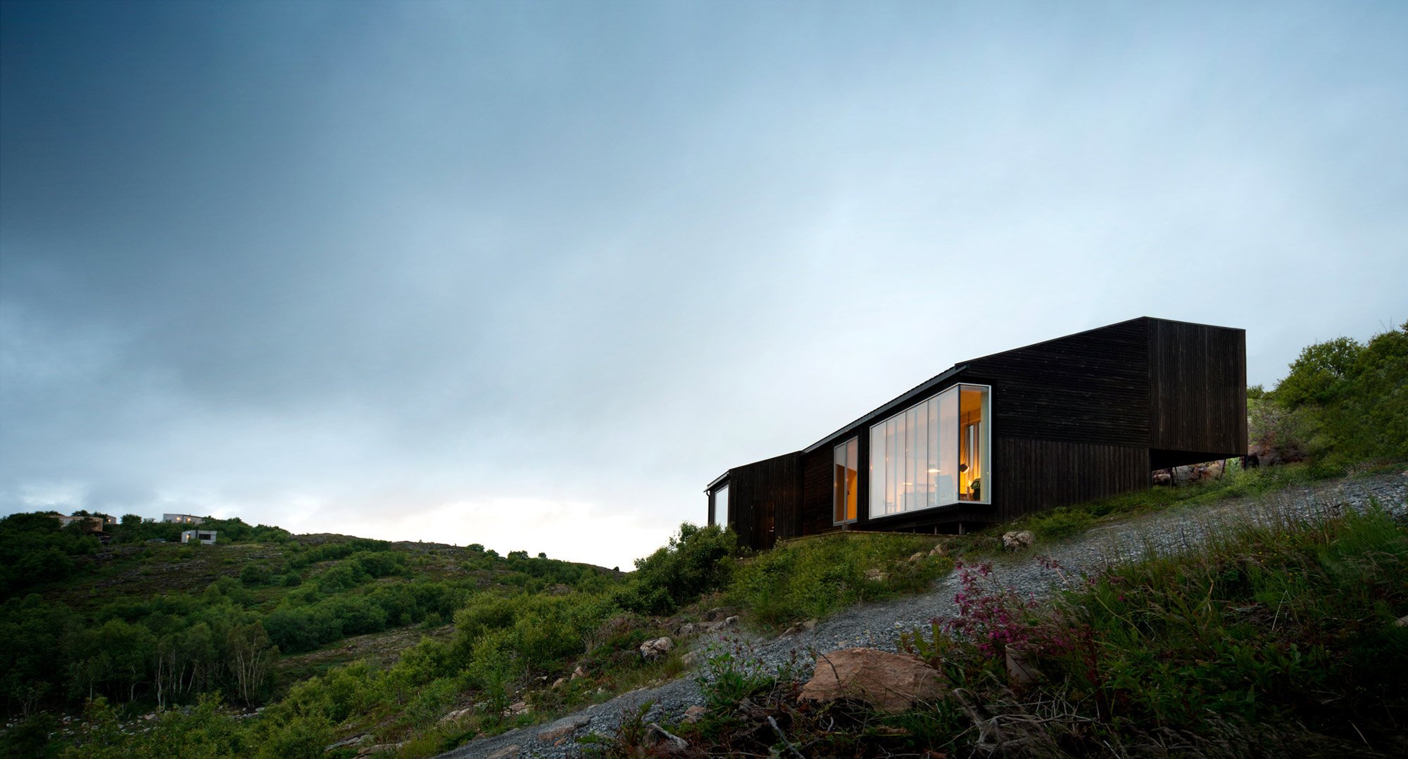 A cozy cabin embedded into a stunning landscape in Norway.