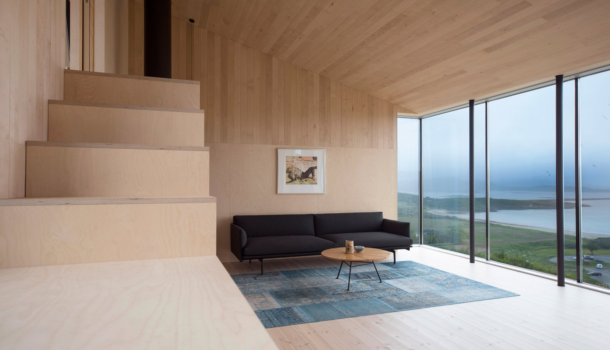 The interior features different levels that follow the sloping plot. The architects optimized the cabin’s footprint and available space with built-in furniture as well as ingeniously integrated storage areas. The use of light birch wood for the furniture. ceilings, walls, and floors creates a simple, understated decor. This interior design decision also allows the beauty of the island to shine through. Large windows frame the sea, verdant surroundings, and rocky terrain, helping the inhabitants to feel a part of Stokkøya’s stunning landscape. Photographs© Kappland Arkitekter.