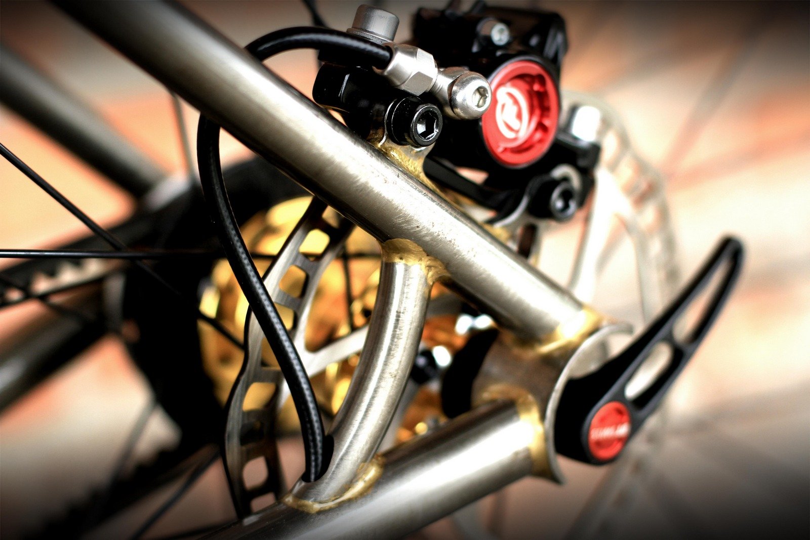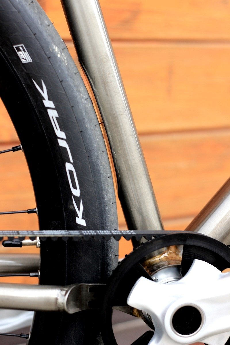 SingleBe Bikes from the Czech Republic puts the pressure on urban bicyclists to bring it with their collection of rides. The Cannondale Lefty-equipped Street Killer is sweet sporting a brass frame, a smokey affect and black labels.   Its inspiration stemmed from a pair of Schwalbe Kojak tires which were love at first sight and the rest of the design went from there. Tom from SingleBe describes the project, “The eccentric bottom bracket was a good choice. It suits the belt drive really, really well as it is easy to set the tension. Since we chose an eccentric BB, we could afford to have two dropout positions for a 135×10 thru-axle hub. We carved out a bit of the seat tube to get some more frame clearance for the Kojak 2.00 tires and a short chain stay.”