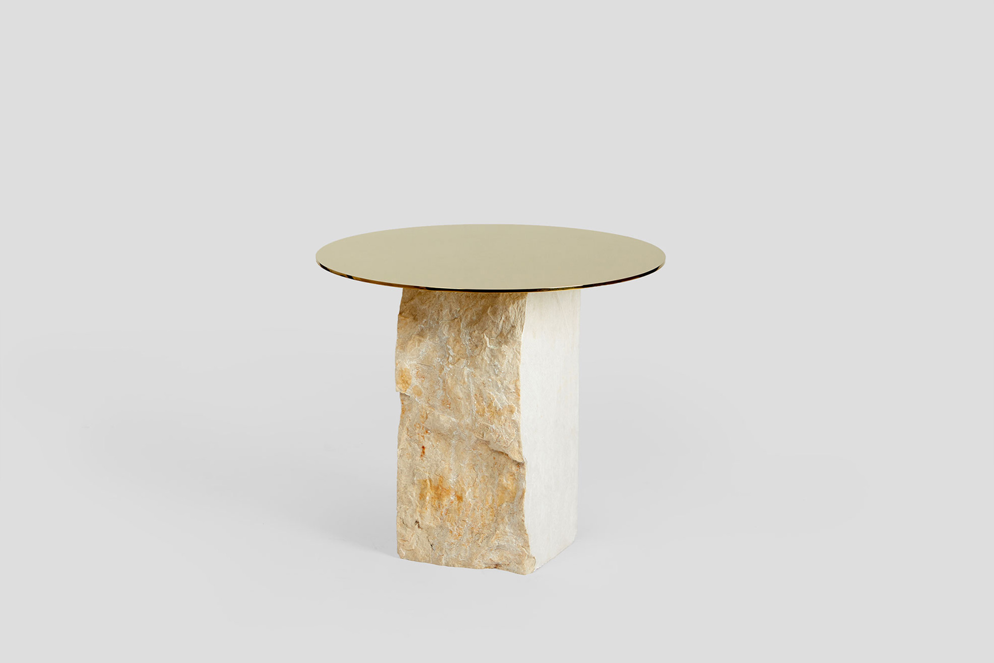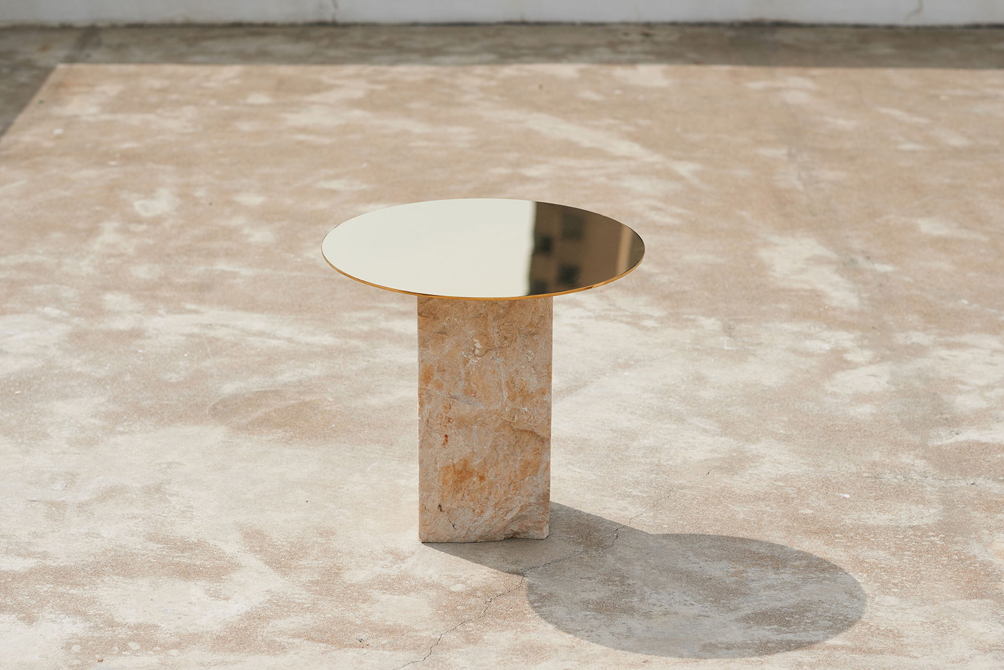 Based in Shanghai, Studio Glume is a multidisciplinary design agency that completes a wide range of projects, from architecture, interior design and furniture design to art and graphic design. The firm’s furniture design series has caught our attention. Using a blend of contrasting materials and finishes, along with either found or recovered materials like reclaimed marble, the studio created a collection of striking designs that highlight the beauty of each component. Minimalist and simple, the objects combine two or three elements with starkly different aesthetics. For example, one side tale boasts a travertine base with a raw, unfinished and irregular surface. On top, a sleek sheet of metal gleams with a golden color and a perfectly smooth finish.