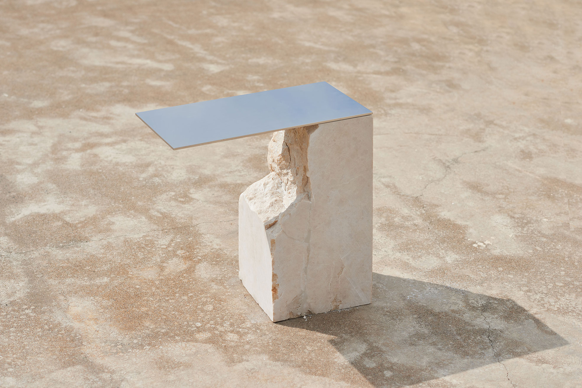 Another table combines a solid stone base, a charred wood block, and a rectangular glass top. Other designs bring together rough marble and mirrored glass, two types of stone with contrasting finishes, or charred wood and stone. Every object creates a dialogue between different materials or textures, pairing rough and high-end finishes in eye-catching functional sculptures. For this series, the studio also used a range of reclaimed or found materials. These include concrete bricks from construction sites and marble blocks reclaimed from the waste materials of a workshop. The collection comprises side tables and coffee tables as well as stools and benches. All of the objects are one of a kind. Photographs© Studio Glume.