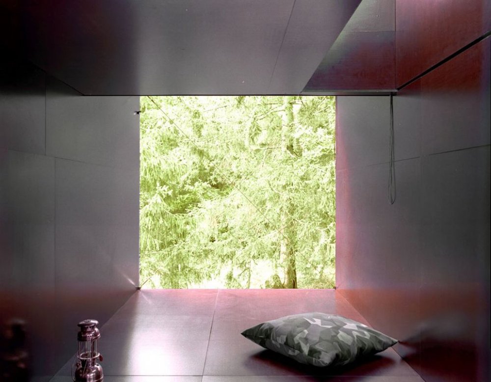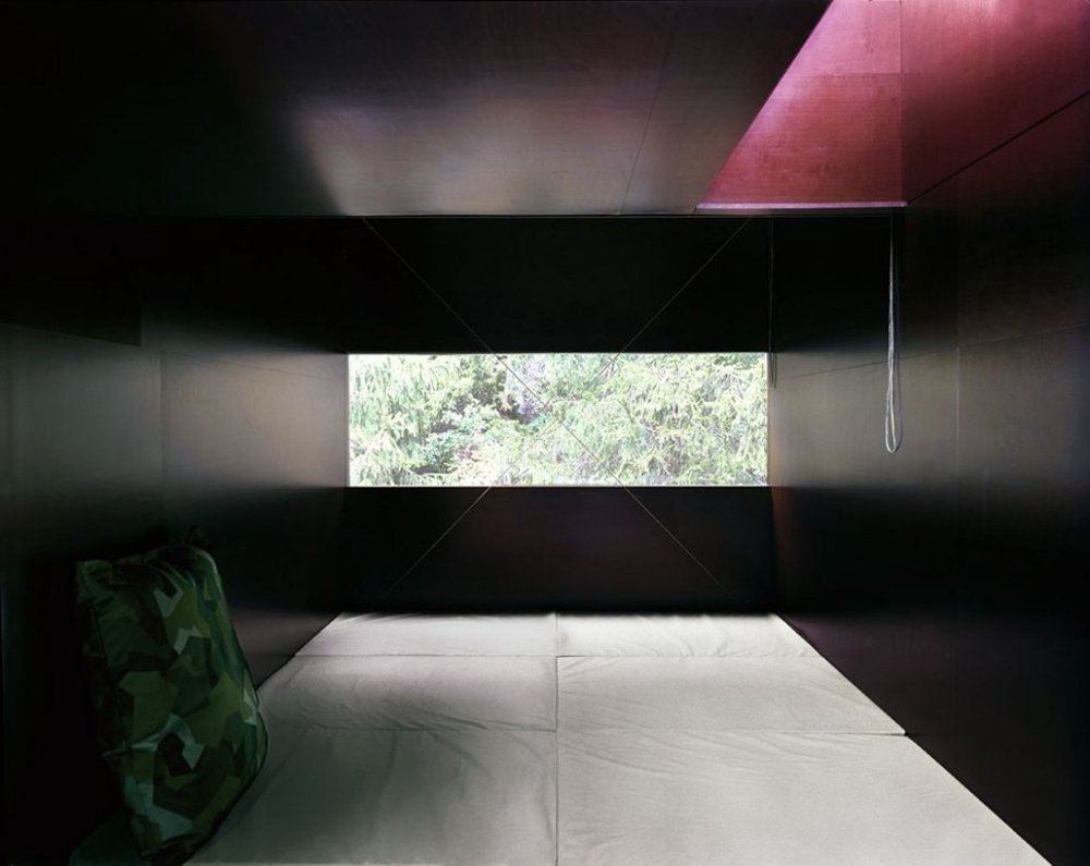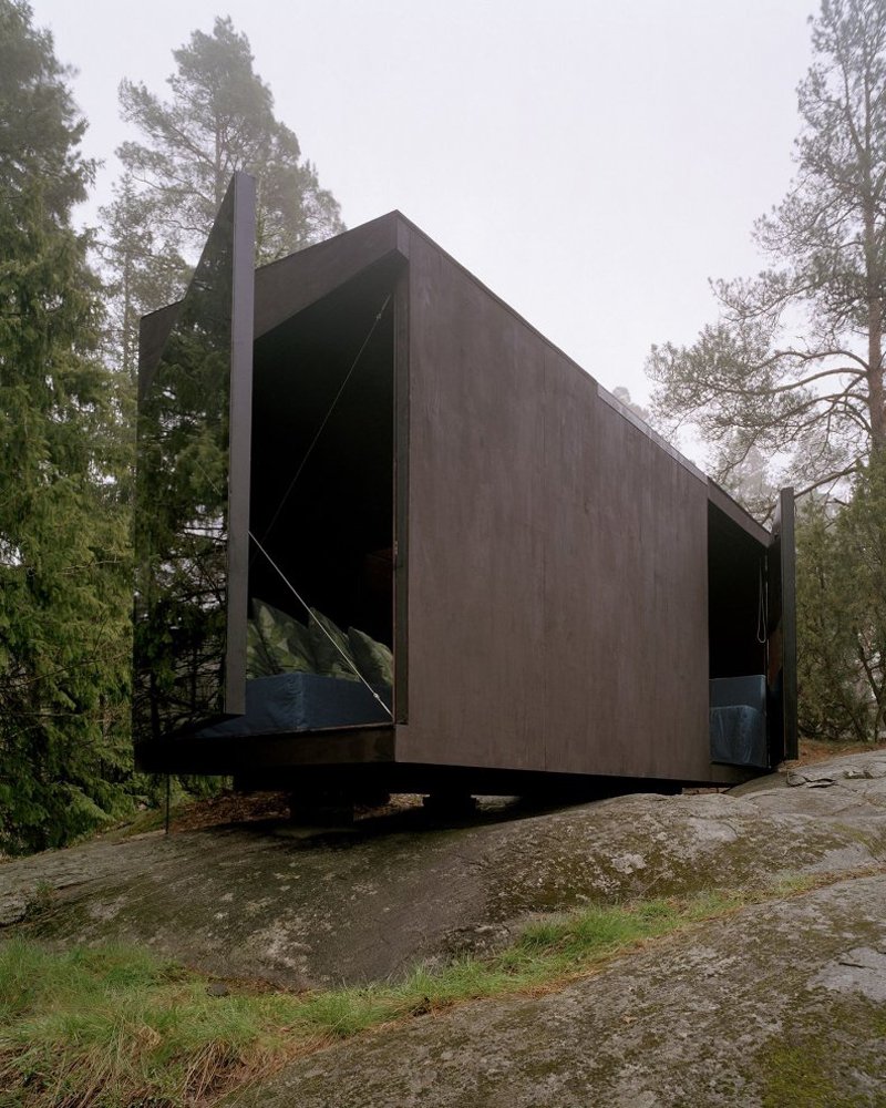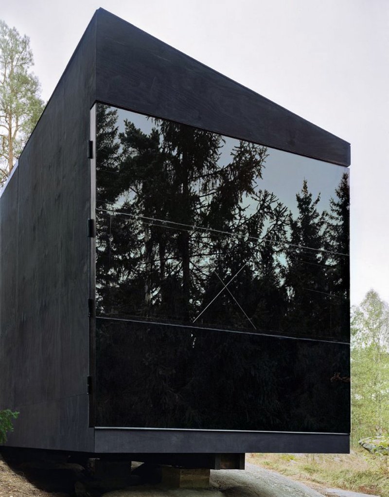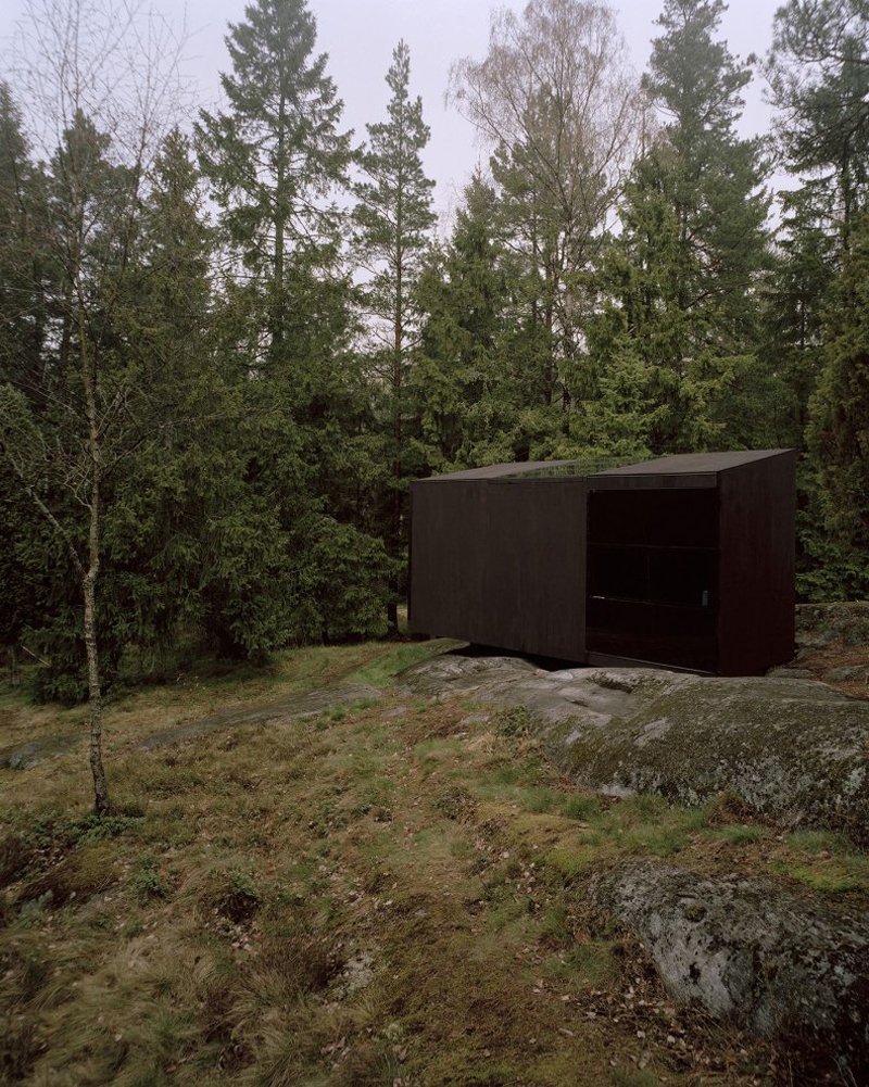 Amidst the forests in Ingarö, Sweden, Black Cabin acts as a viewfinder that frames snapshots of the arboreal environment. Designed by Swedish firm Imanna Arkitekter AB, Black Cabin is dedicated to “sleep and contemplation” though the simplicity of the four adjacent rooms – three surrounding a central one – introduces complexities of its own. Each of these spaces uses an opening in the façade as a canvas for nature, leveraging the contrast between the cabin’s dark surface, both internal and external, and the transparency of the glazing. The ends of the volume completely also completely open, converting the cabin from an enclosed space into an integrative piece of architecture.